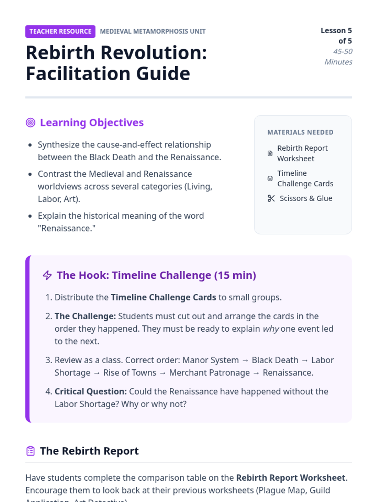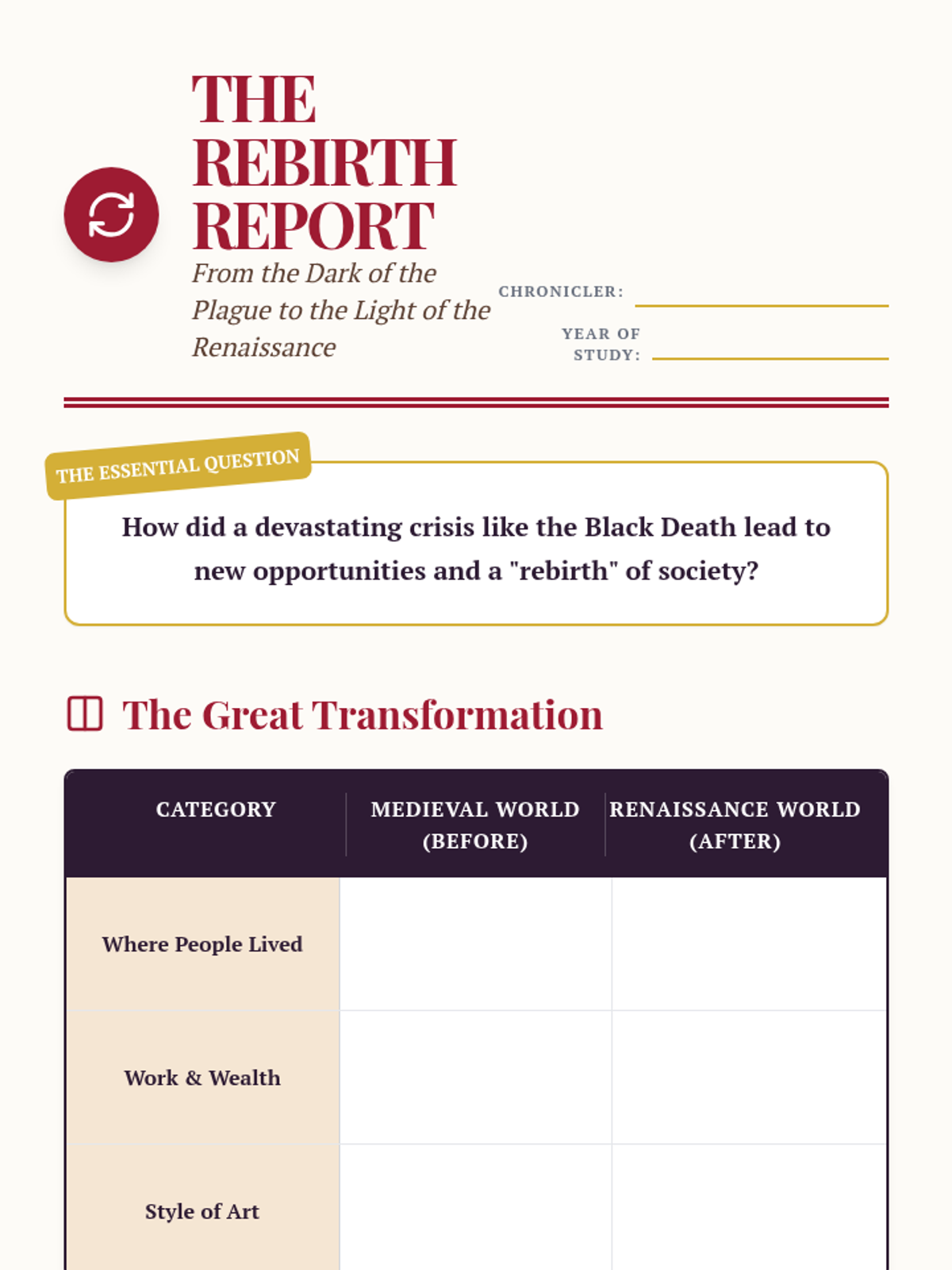 This sequence explores the transformative period from the Black Death to the Renaissance. Students will analyze how a global crisis reshaped European society, leading to the decline of feudalism, the rise of towns and guilds, and the birth of modern art and commerce.