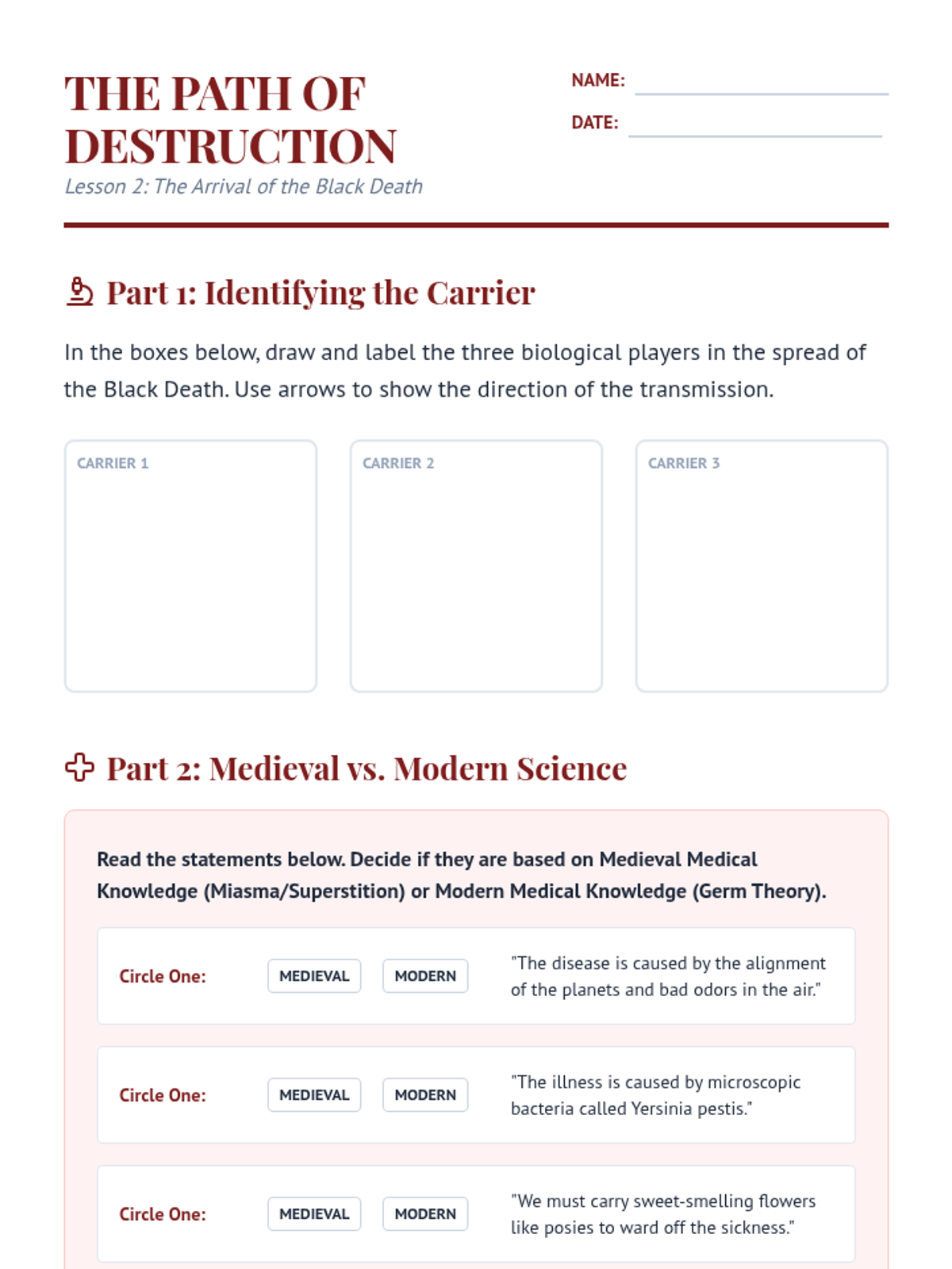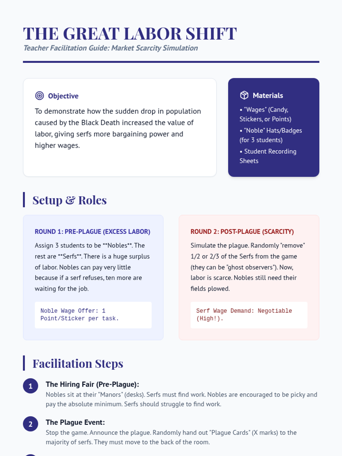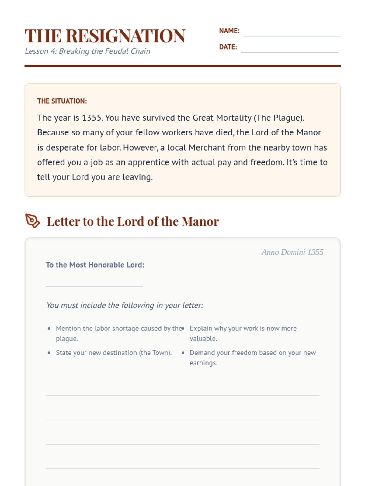 A 5th-grade history sequence exploring the transition from the feudal Middle Ages to the early modern period. Students analyze how the devastation of the Black Death triggered economic shifts, the rise of the merchant class, and the growth of towns, setting the stage for the Renaissance.