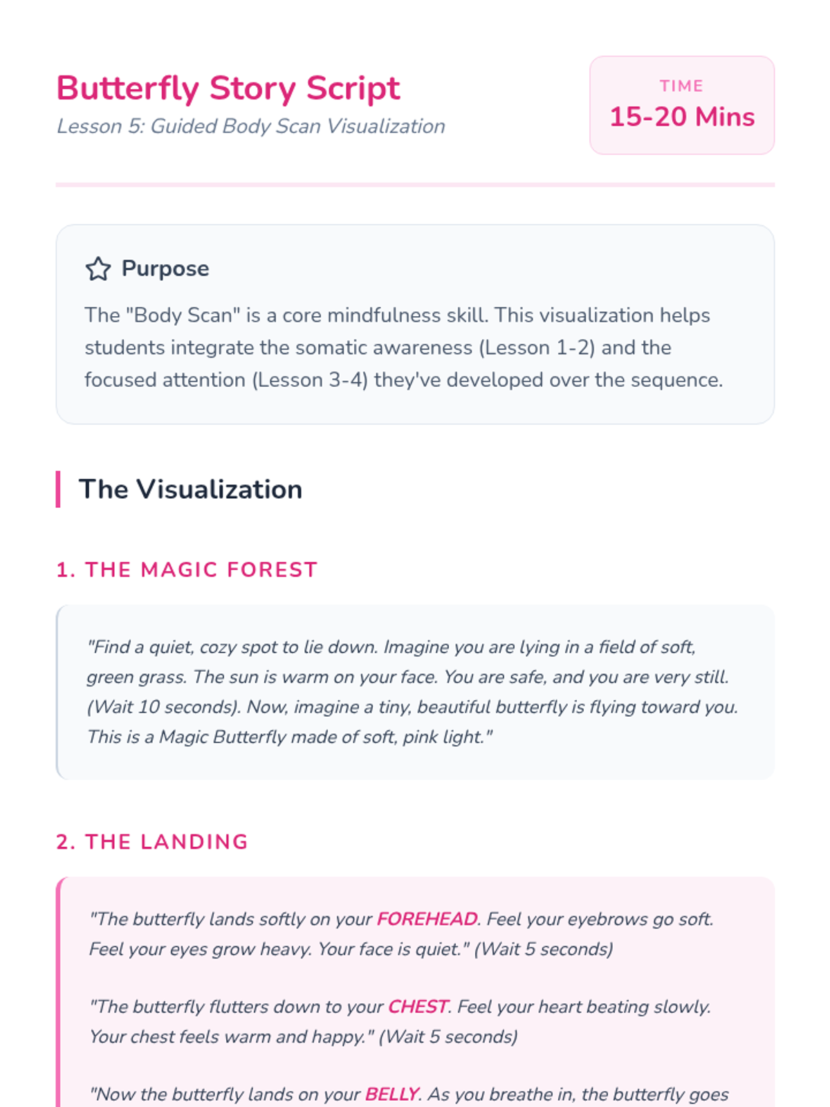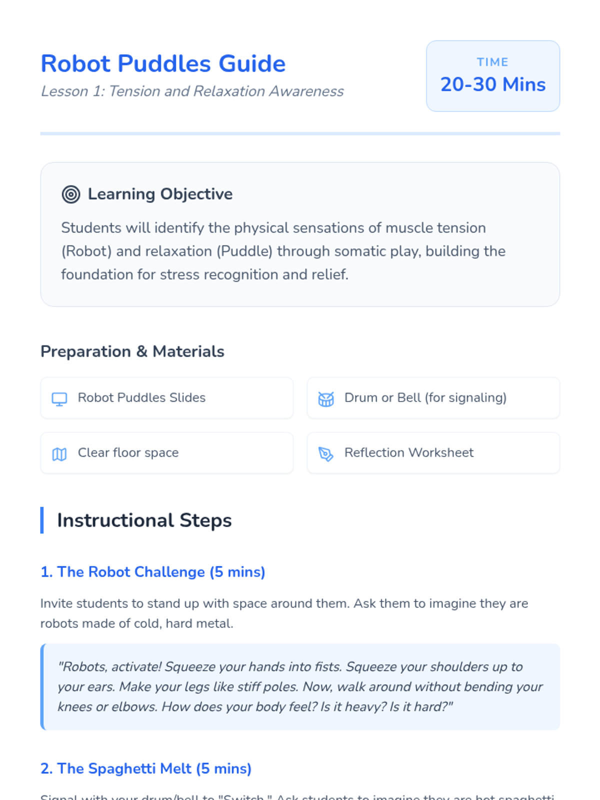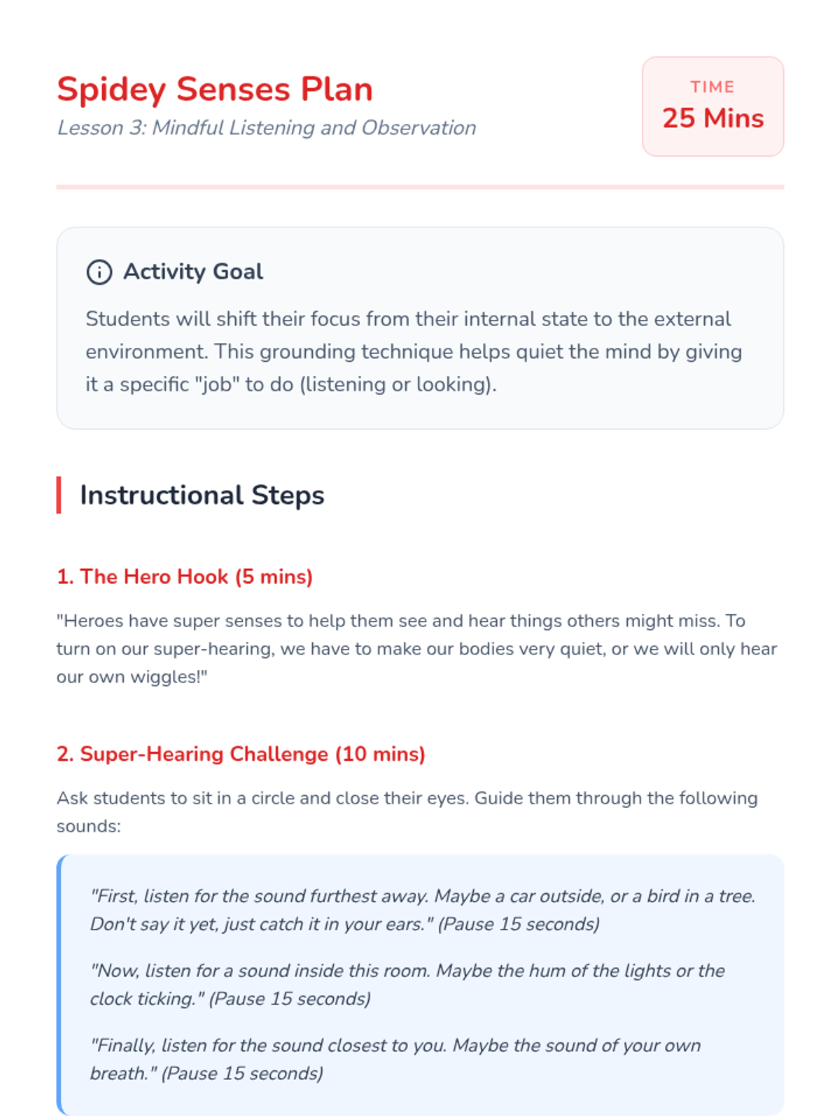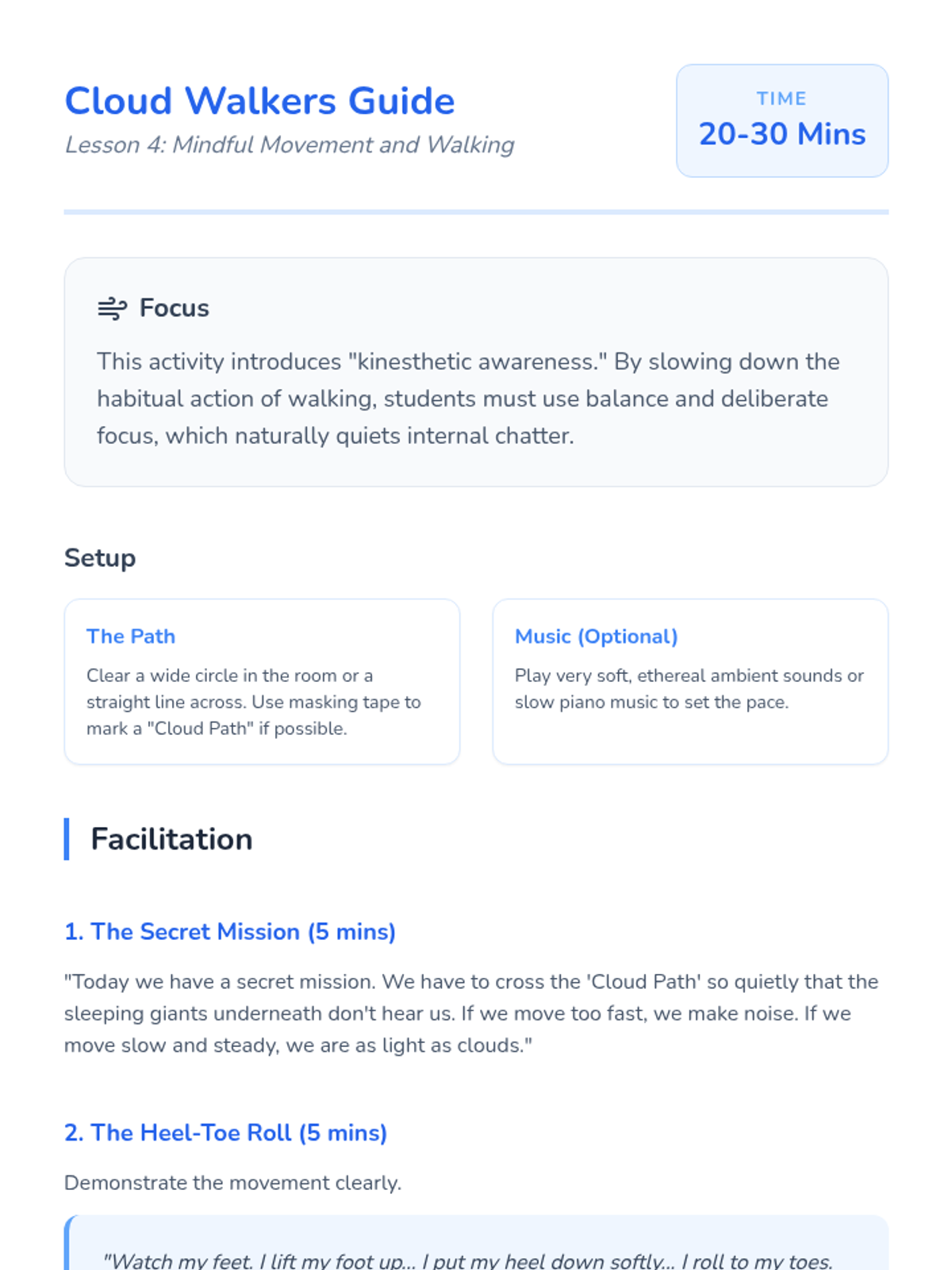 A sequence for Kindergarten students focusing on physical grounding and sensory mindfulness. Students learn to recognize tension, practice relaxation techniques, and sharpen their external senses to achieve a calm mental state.