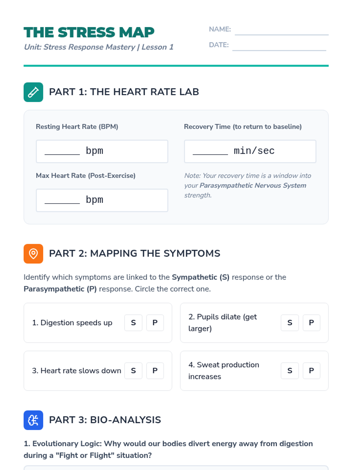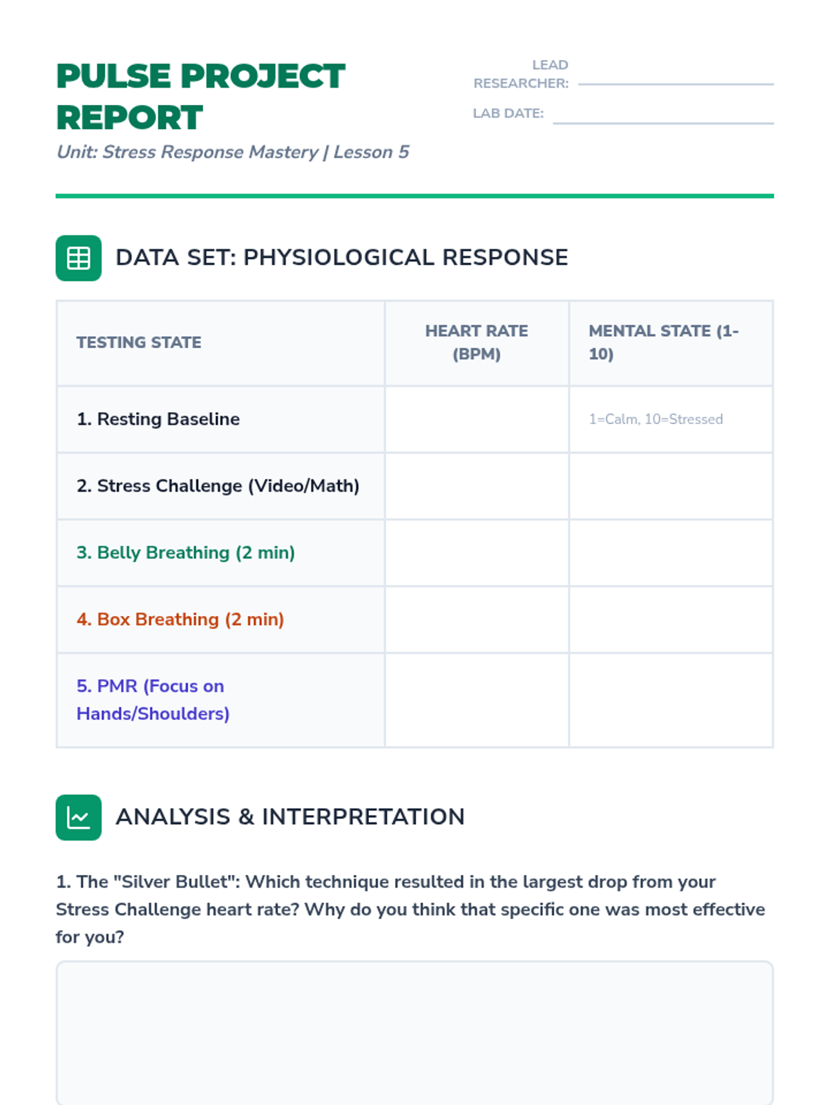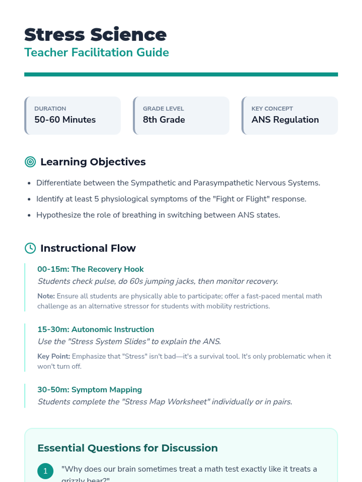 This 8th-grade sequence explores the biological connection between the nervous system and stress. Students learn the science of the 'fight or flight' response and practice evidence-based breathing and relaxation techniques like diaphragmatic breathing, box breathing, and progressive muscle relaxation to consciously regulate their physiological state.