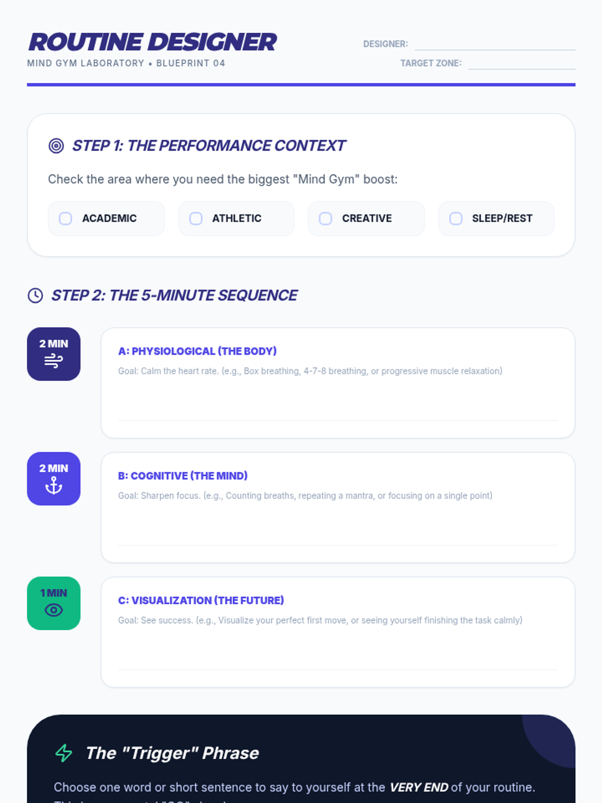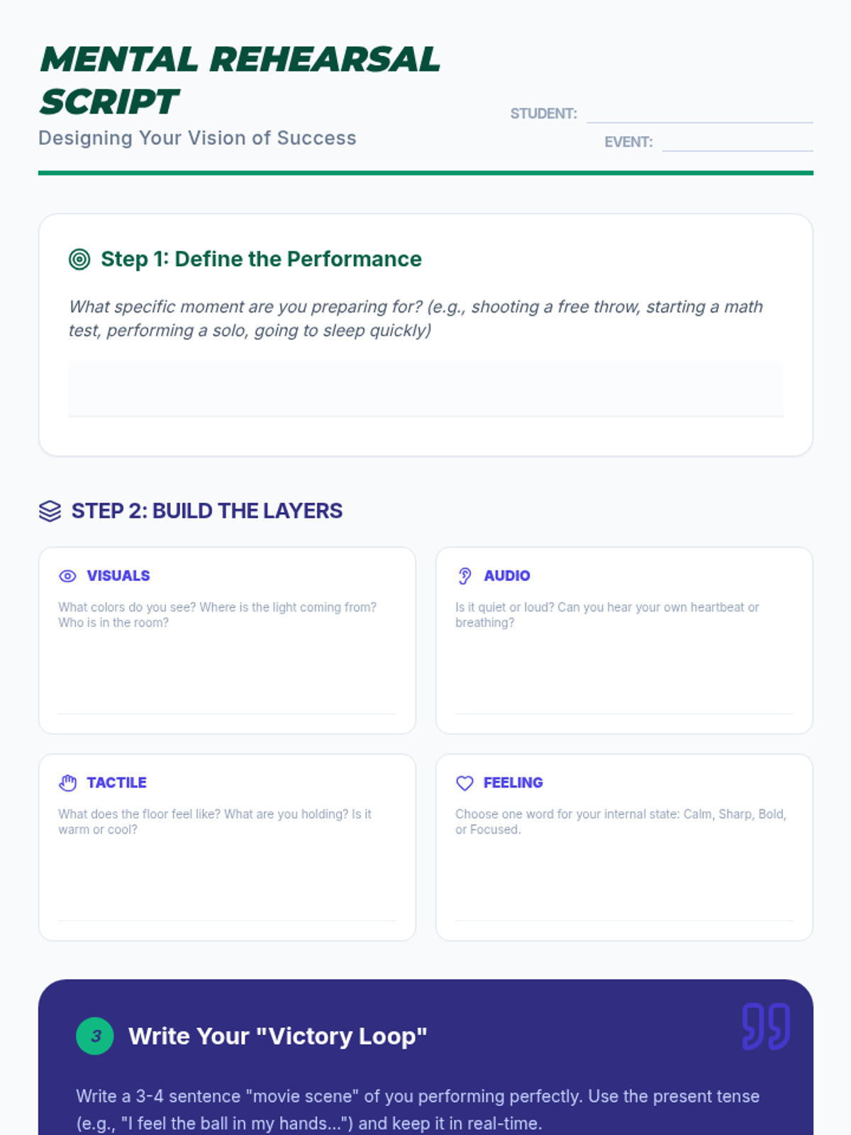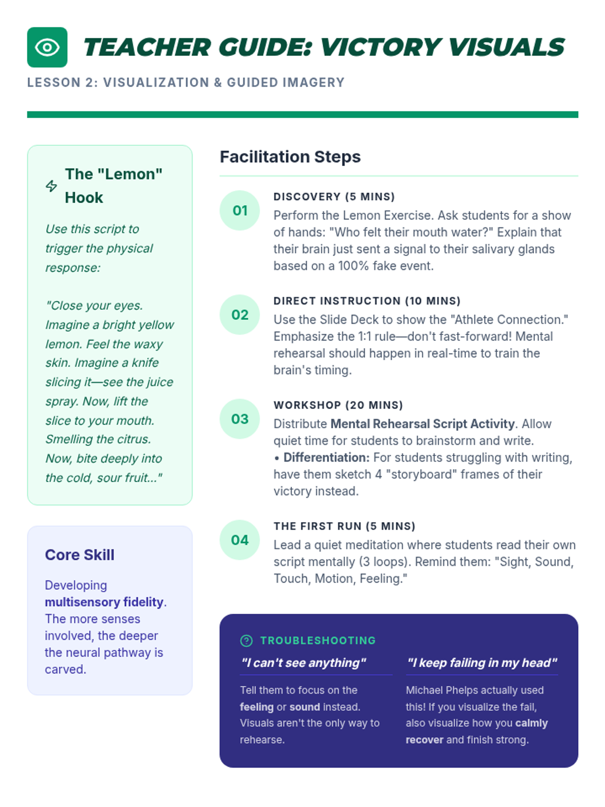 This 8th-grade health sequence explores meditation through the lens of performance and neuroscience. Students learn how mental training rewires the brain (neuroplasticity), practice visualization techniques used by elite athletes, and develop their own 5-minute pre-performance routines for sports, academics, or sleep.