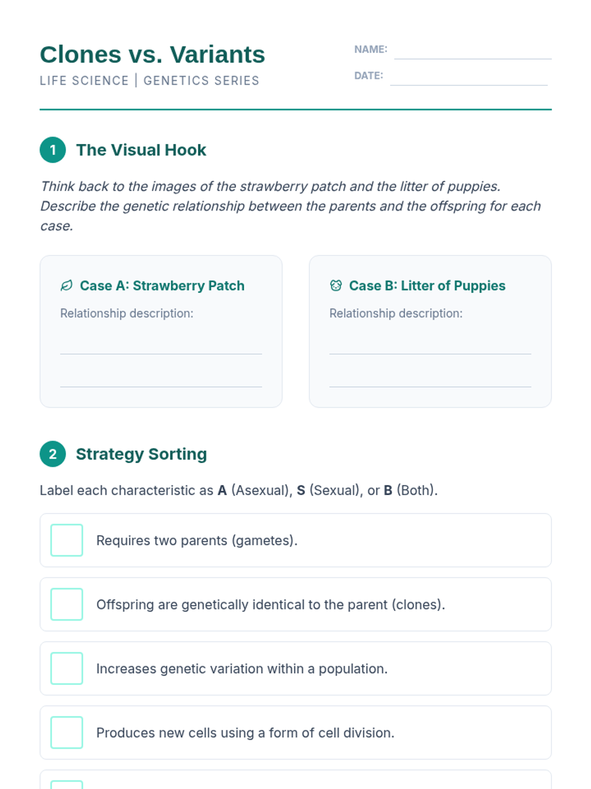 This sequence explores the differences between asexual and sexual reproduction, the process of meiosis, and how genetic variation occurs through chromosome reduction and crossing over. Students will investigate the essential question of why siblings differ despite sharing the same parents.
