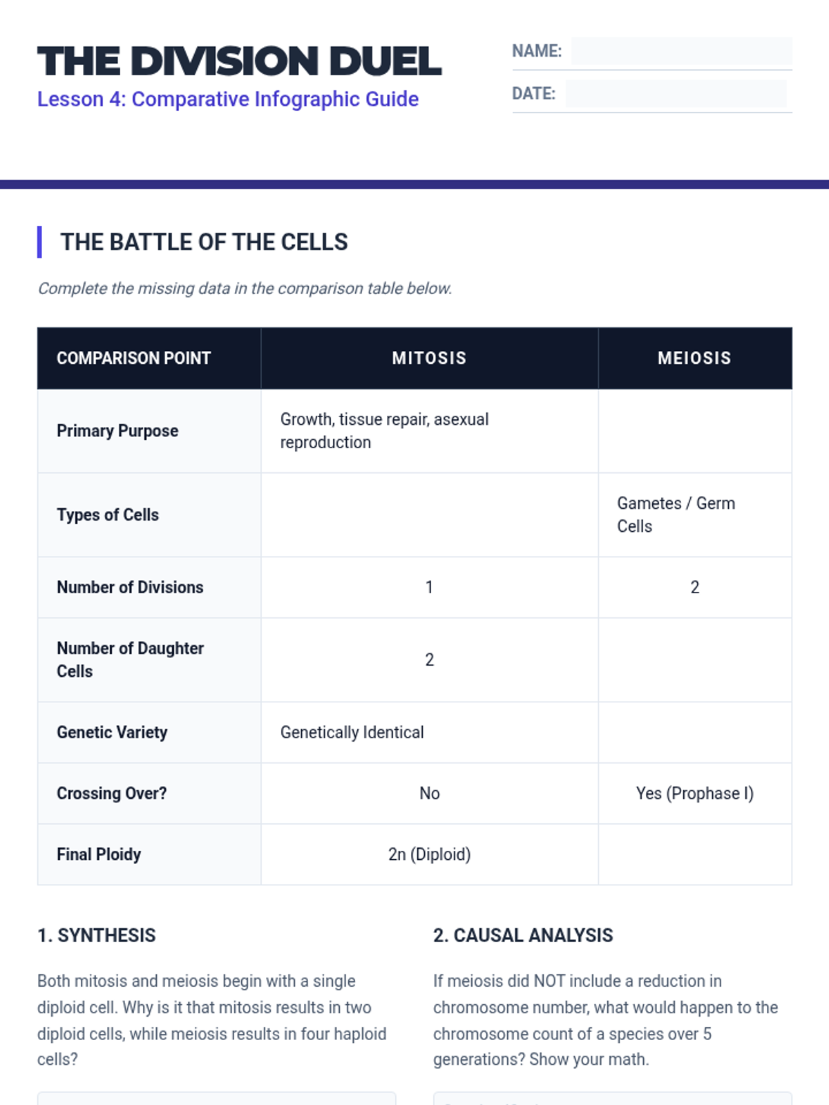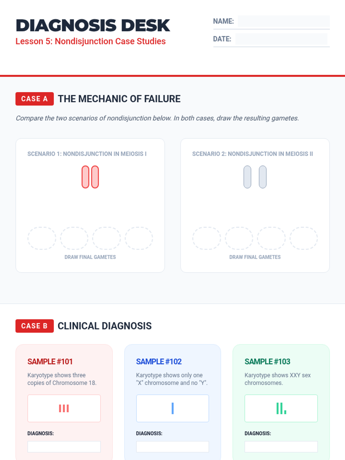 Students explore the process of meiosis, focusing on how chromosome numbers are halved and genetic variation is generated. They contrast meiosis with mitosis and analyze chromosomal disorders arising from errors in division.