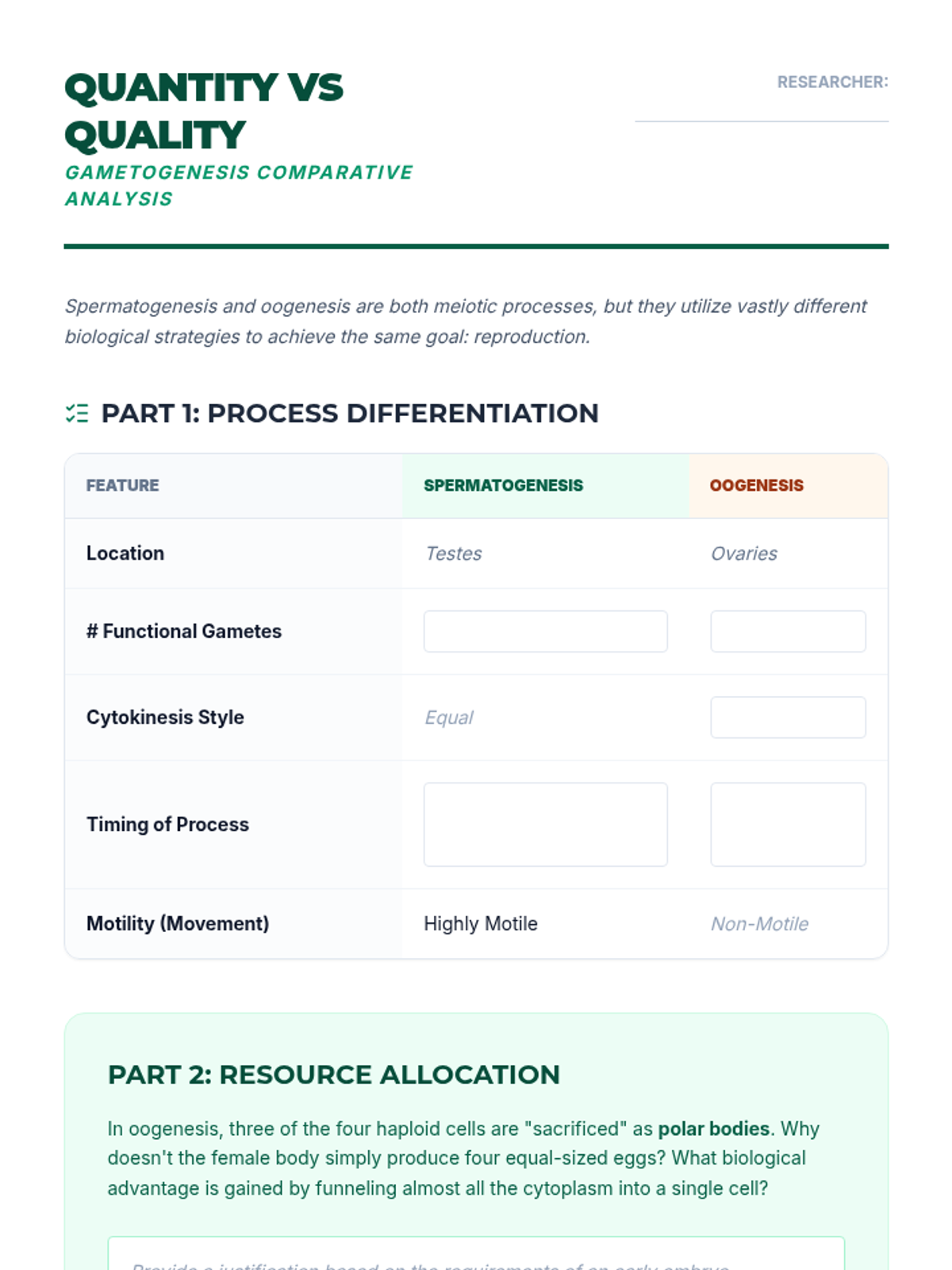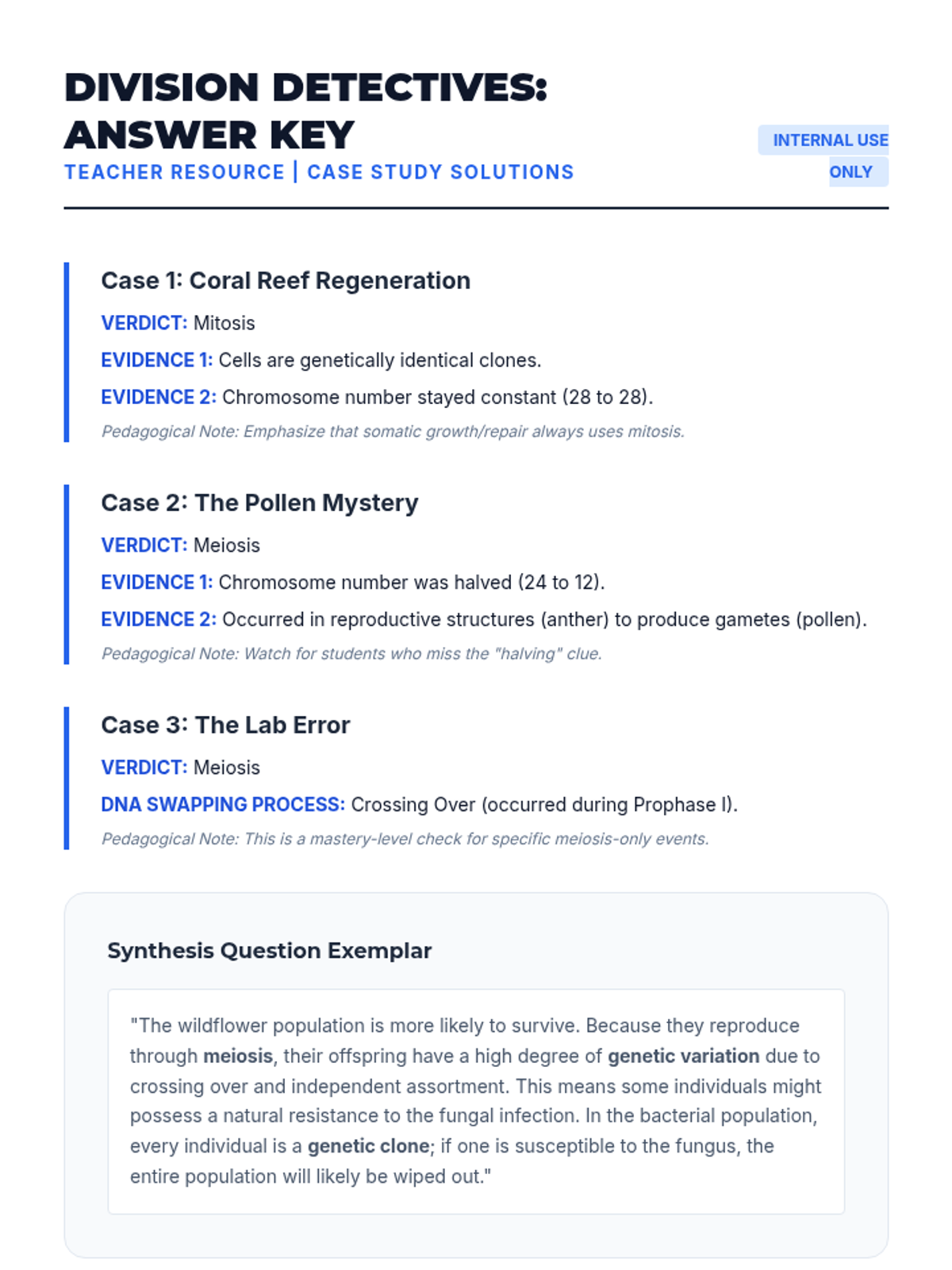 This 11th-grade biology sequence explores meiosis as the engine of genetic diversity. Students move from understanding chromosome structure and ploidy to modeling the complex processes of reduction division, crossing over, and gametogenesis, culminating in a critical comparison with mitosis and an evaluation of evolutionary advantages.
