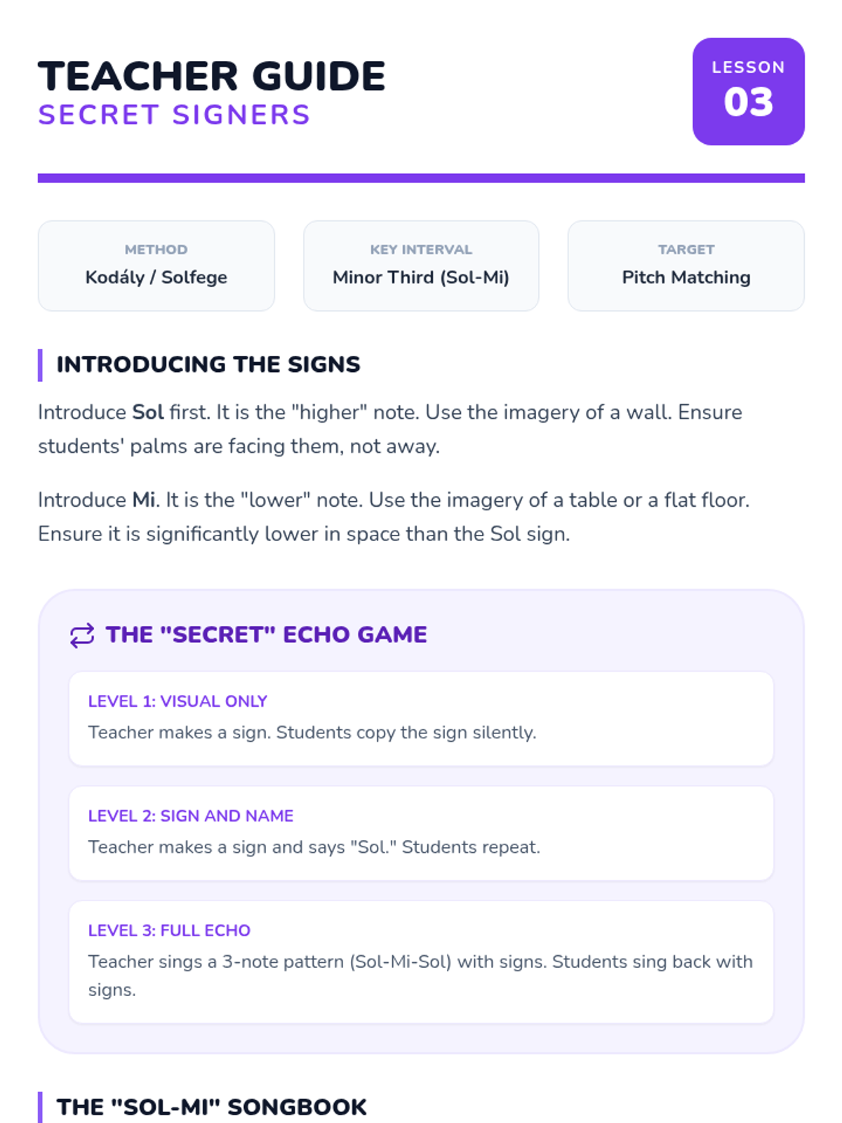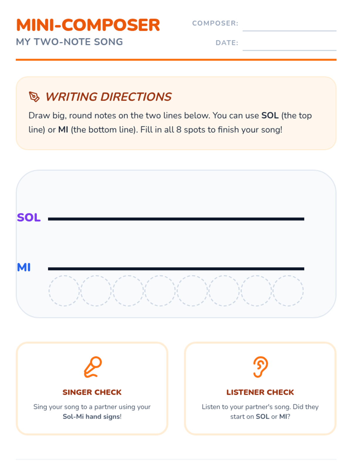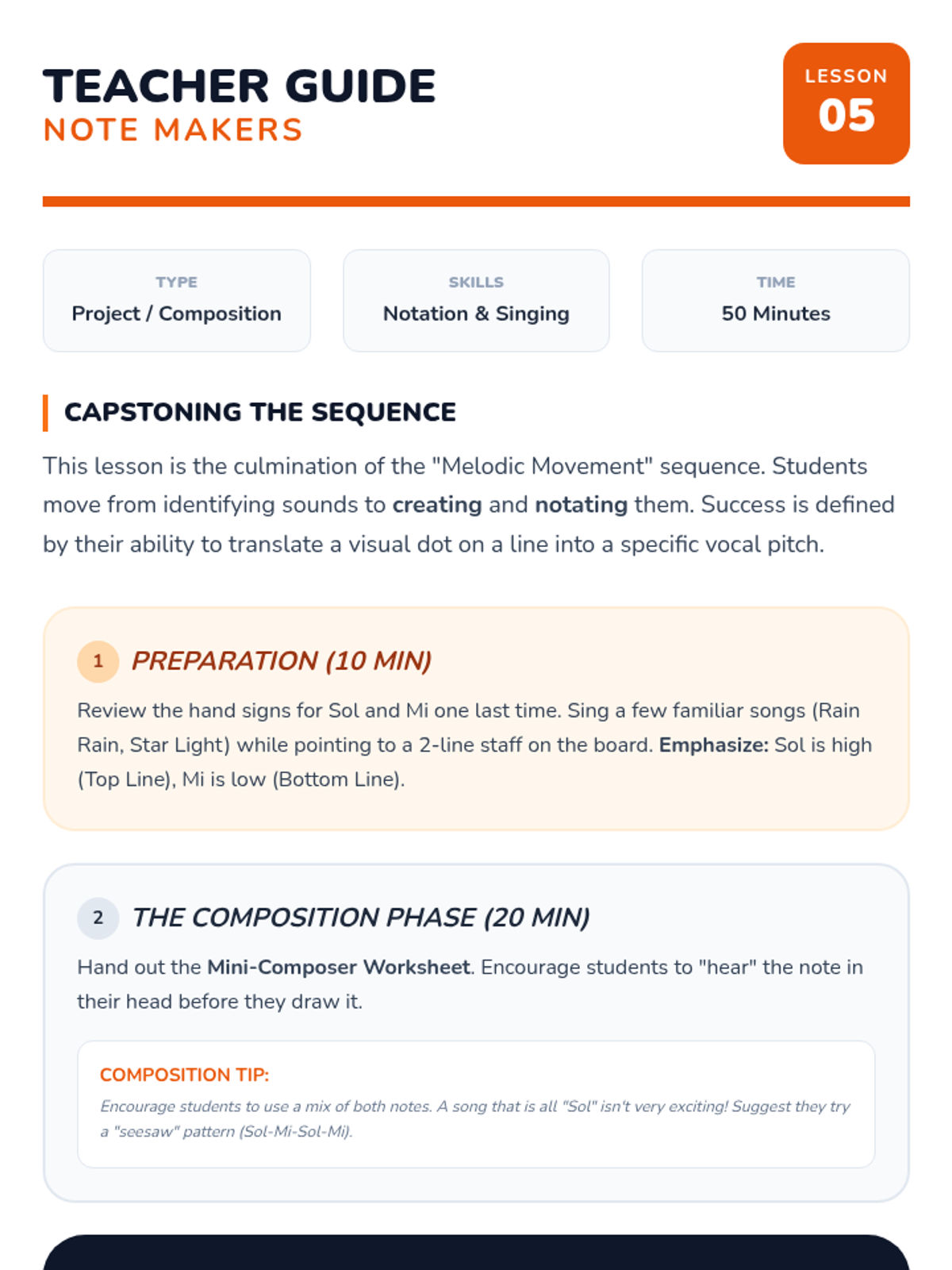 A 1st-grade music sequence focusing on pitch discrimination, melodic contour, Sol-Mi intervals, and the basics of the musical staff through movement and composition.