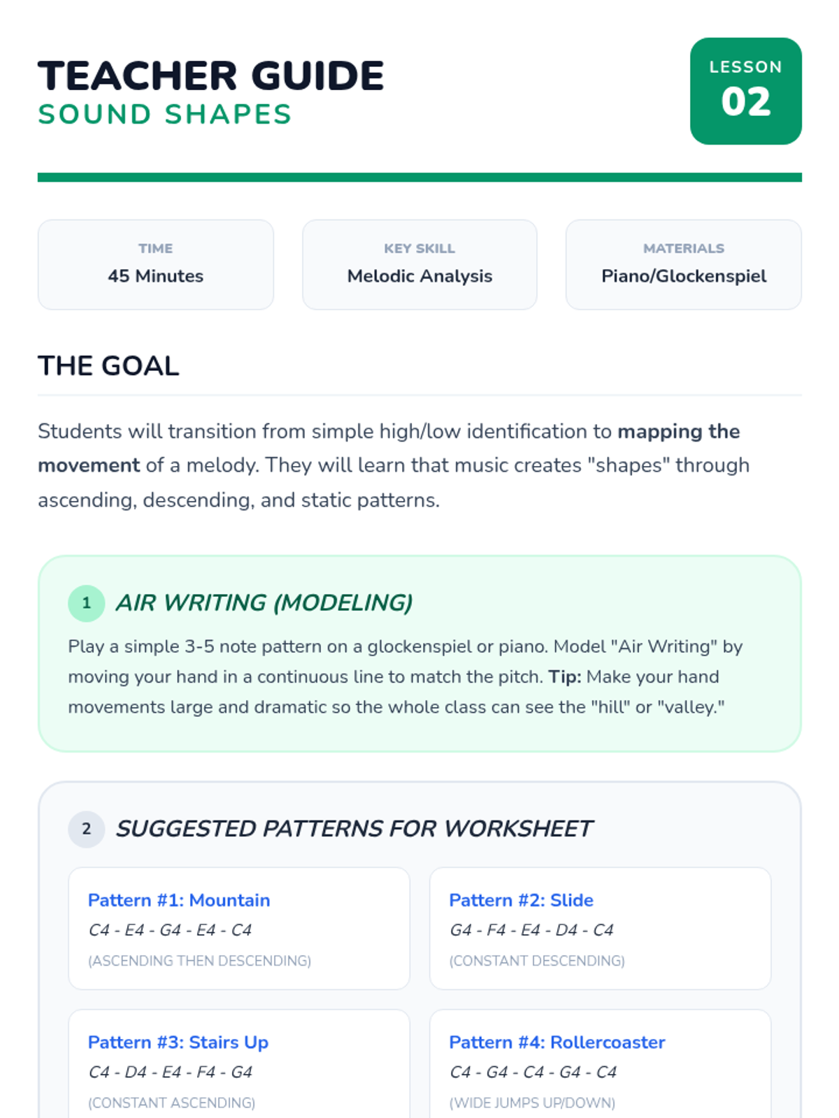 This 1st Grade sequence explores the uniquely American roots of Folk, Blues, and Jazz. Students learn about oral traditions, call-and-response, syncopation, and improvisation through interactive singing and rhythmic games.