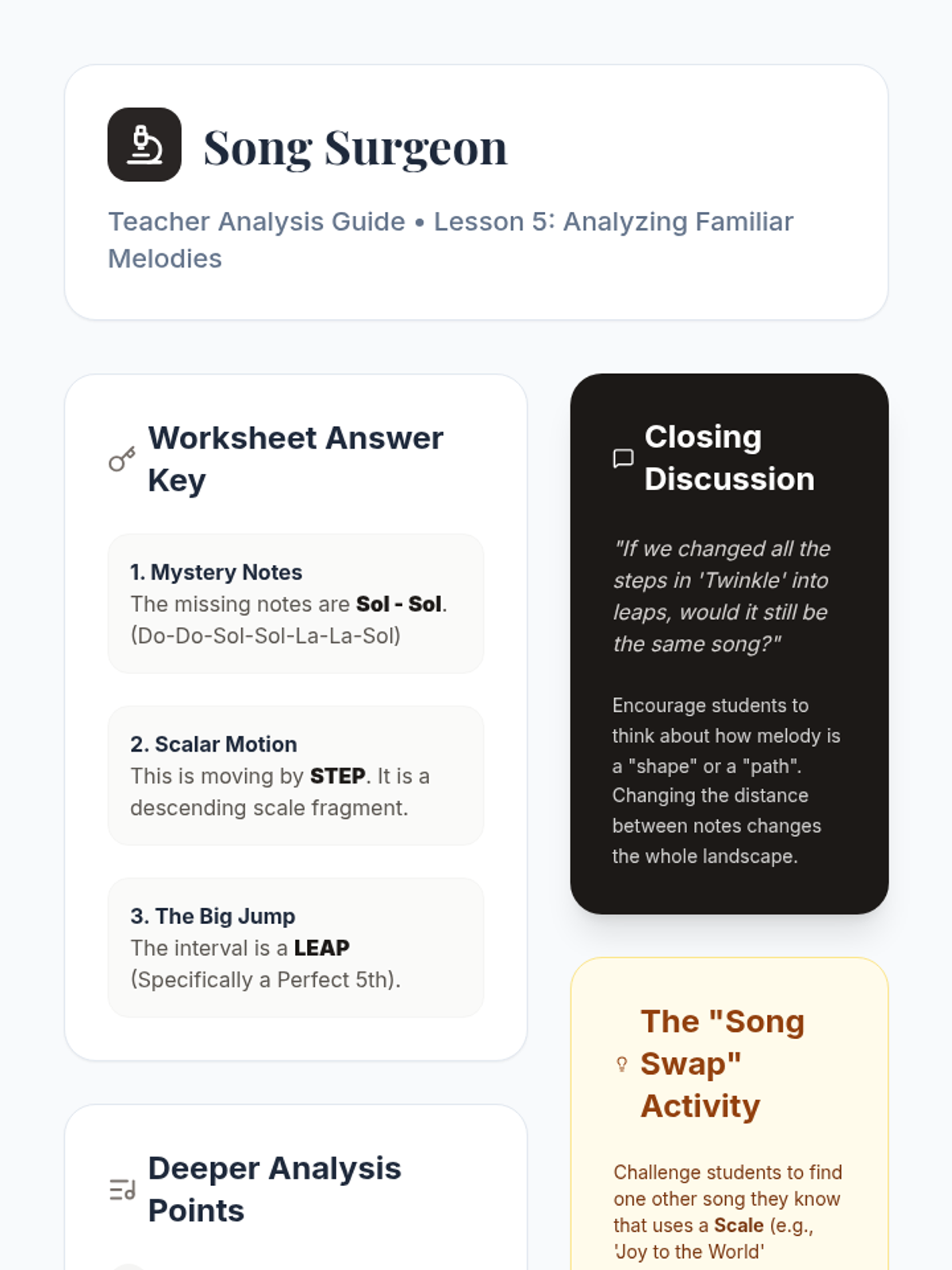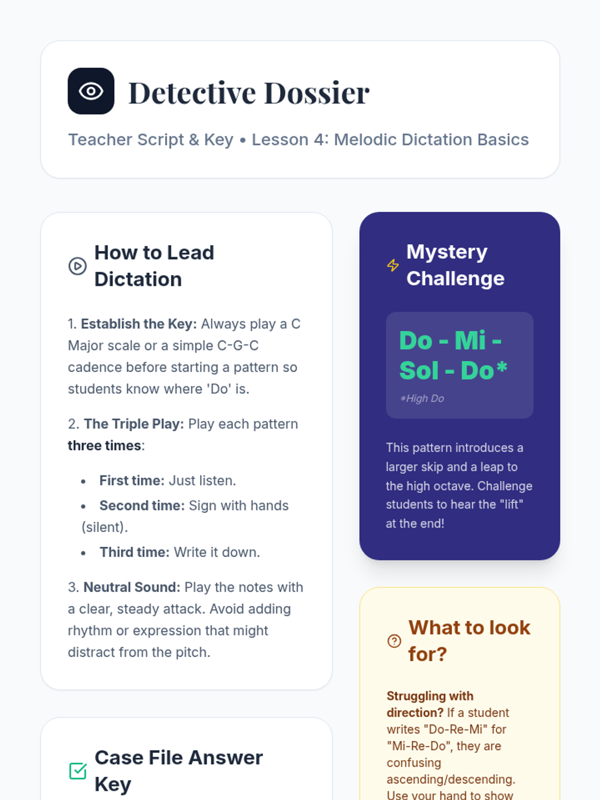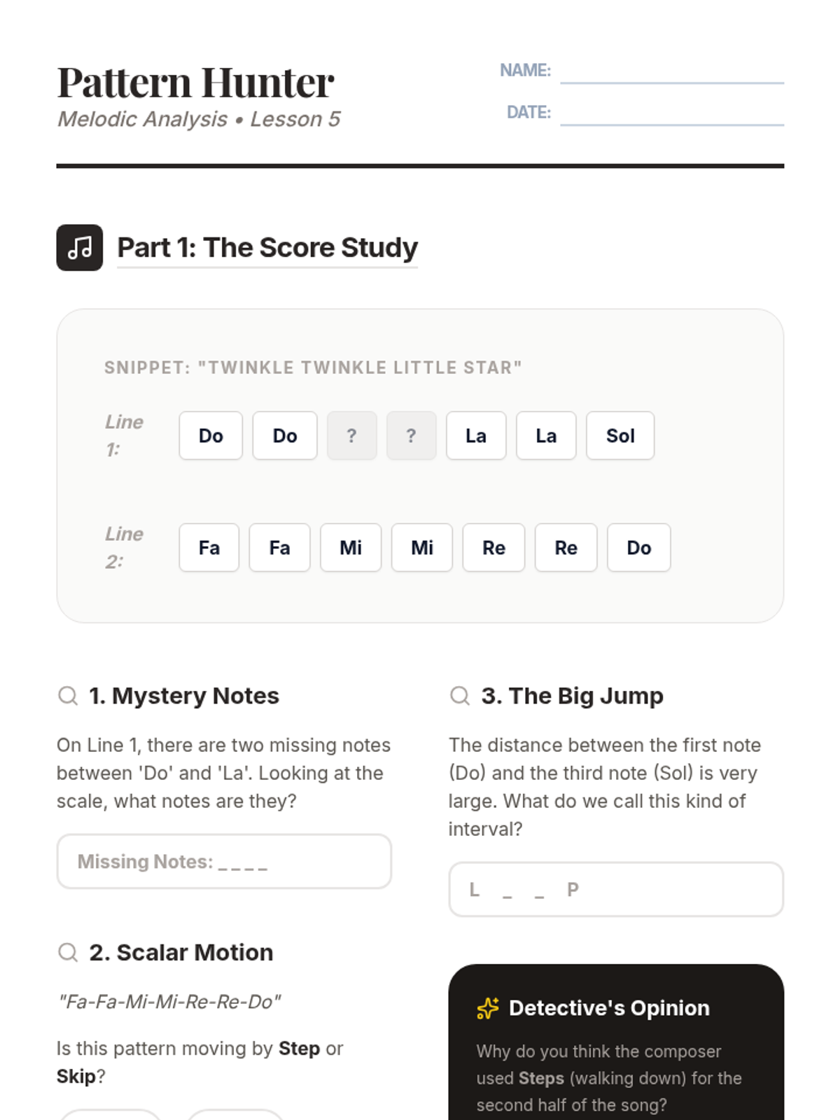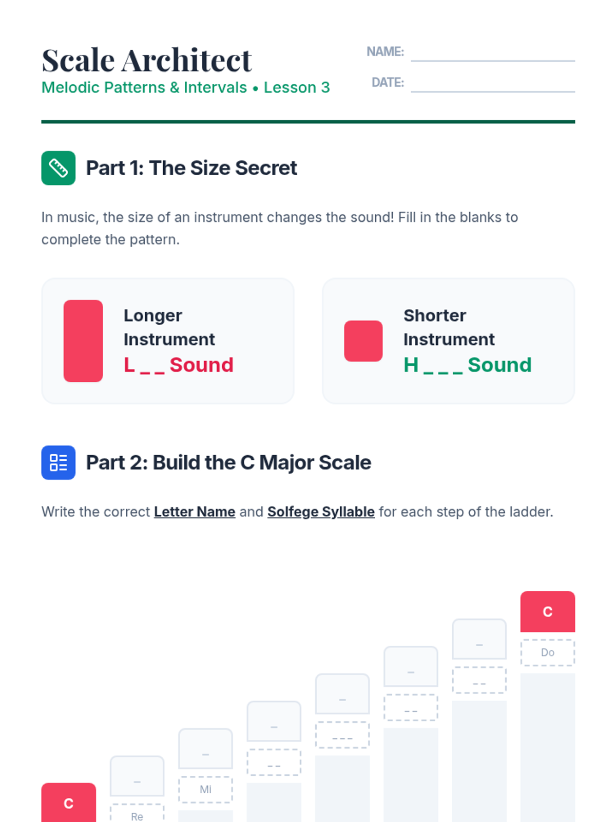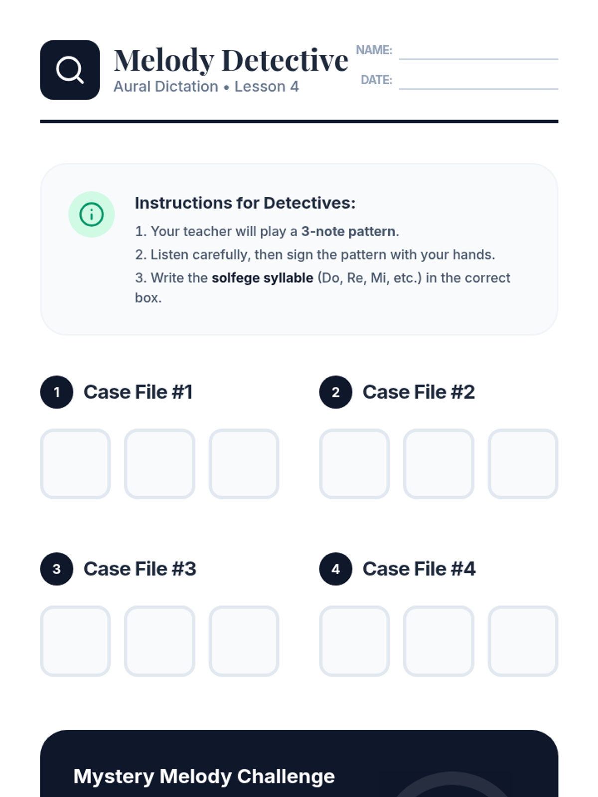Students explore the relationships between notes, focusing on intervals (steps, skips, leaps) and the construction of the C Major scale. Using solfege, hand signs, and aural analysis, students learn to identify and dictate melodic patterns in simple folk music.