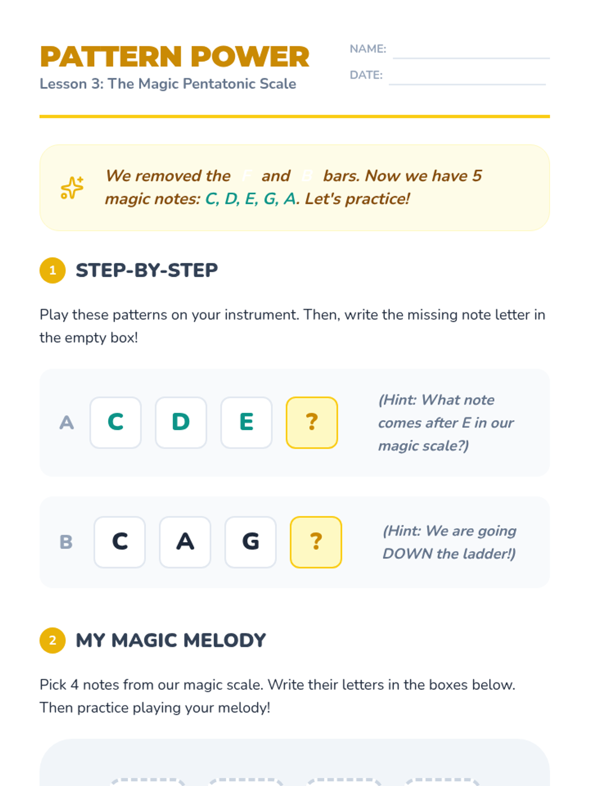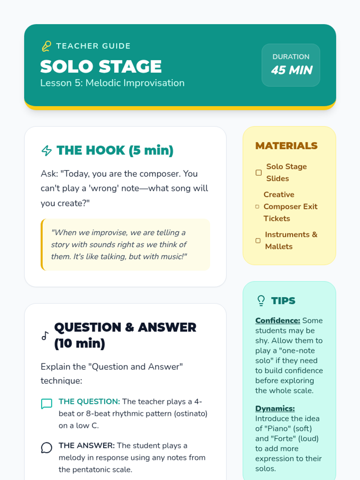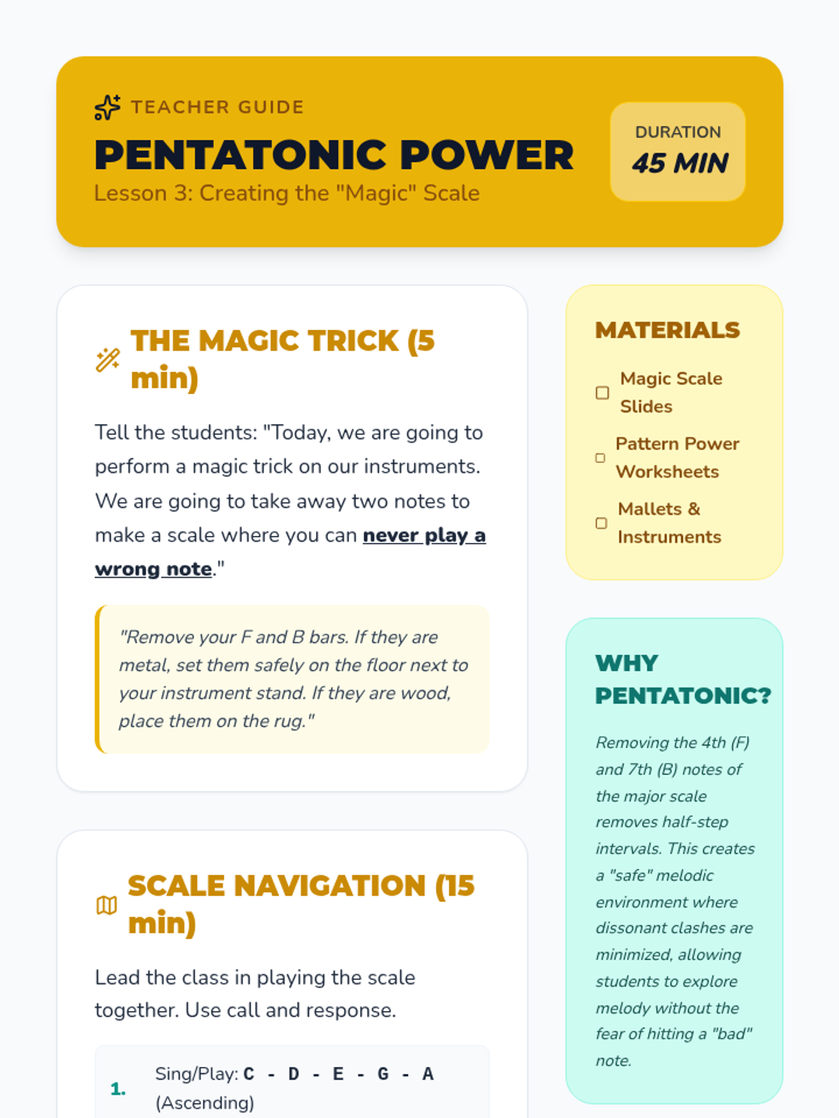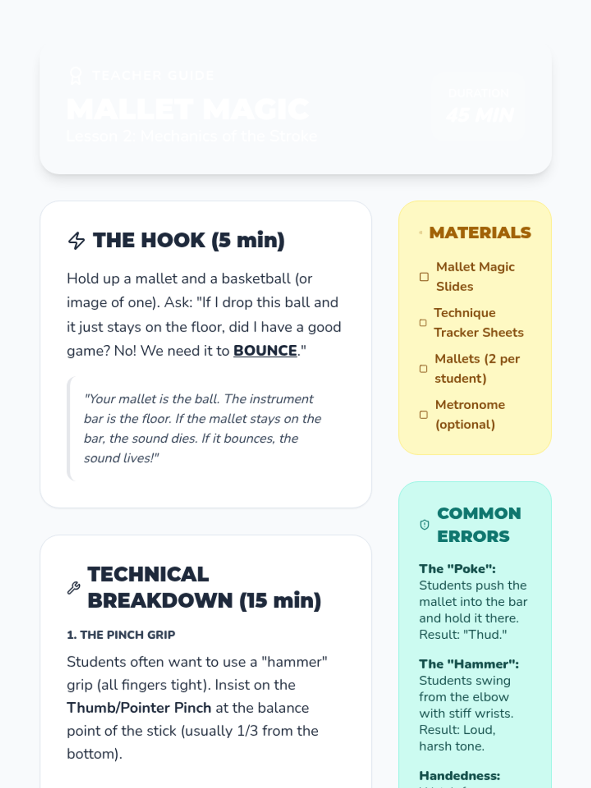 A 5-lesson unit for 2nd grade students focused on transitioning from rhythm to melodic performance on barred instruments. Students explore pitch, mallet technique, the pentatonic scale, and graphic notation, culminating in musical improvisation.