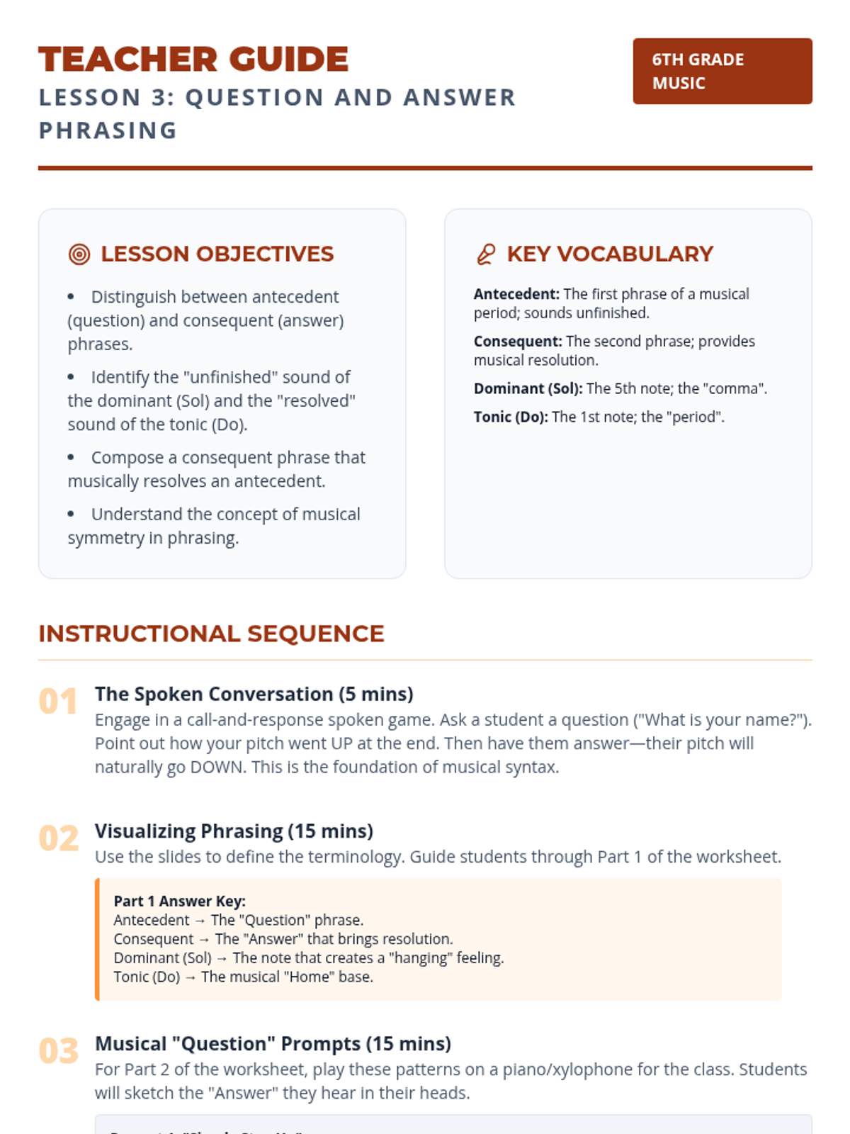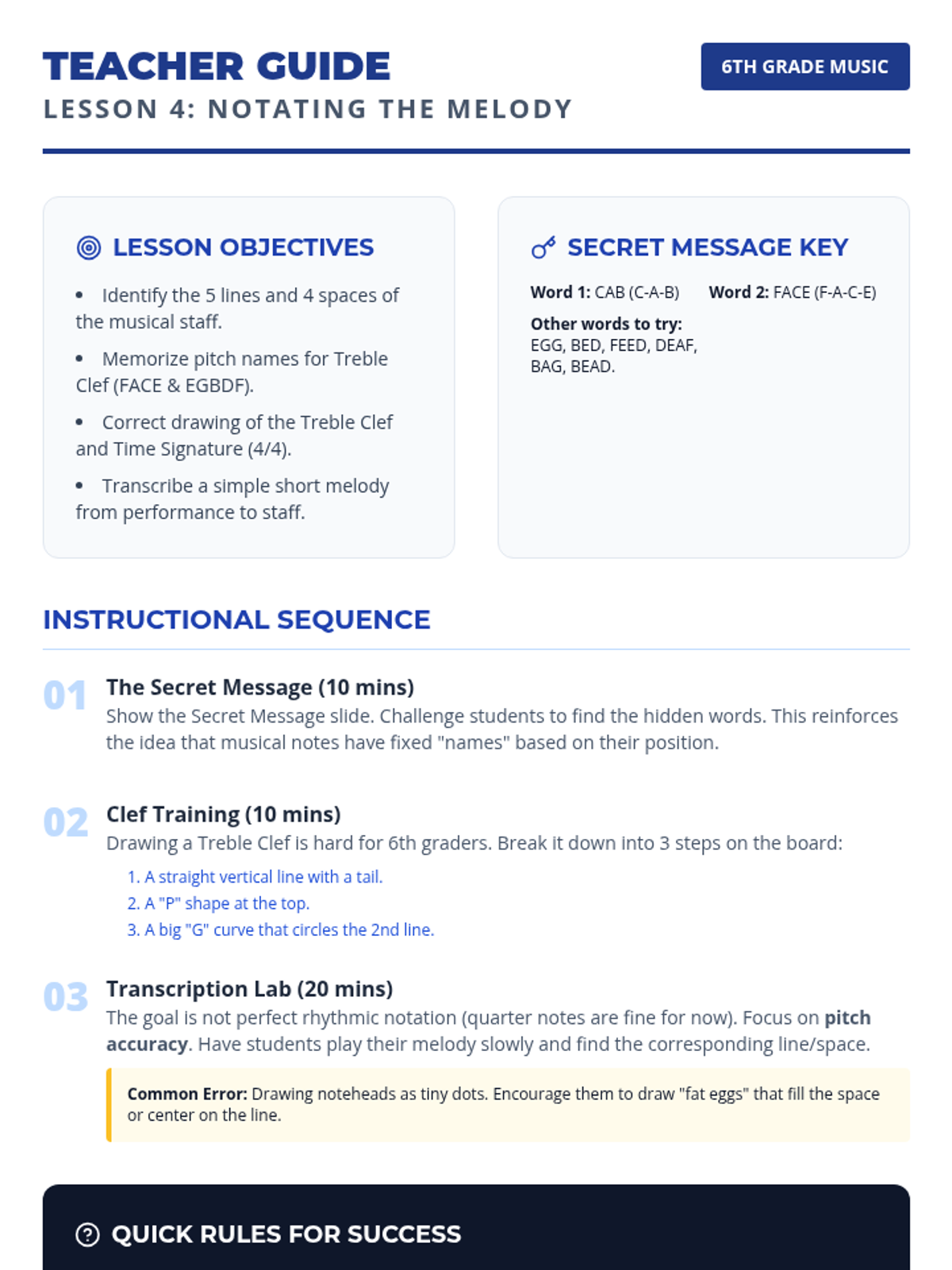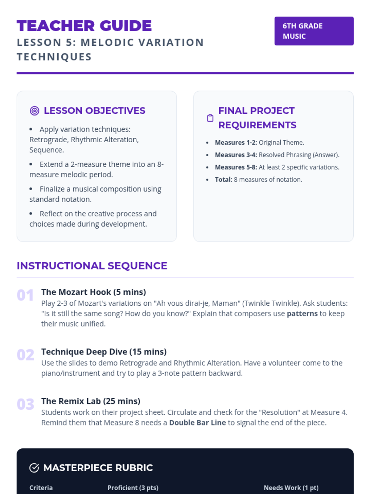 A comprehensive 5-lesson unit for 6th-grade students focused on composing memorable melodies. Students progress from visualizing melodic shapes to understanding pentatonic scales, mastering call-and-response phrasing, and finally notating and varying their own musical creations.