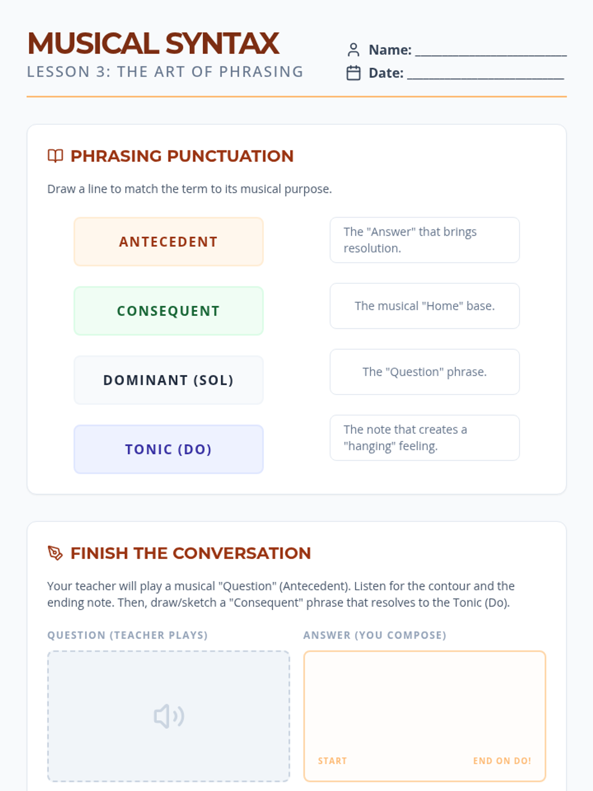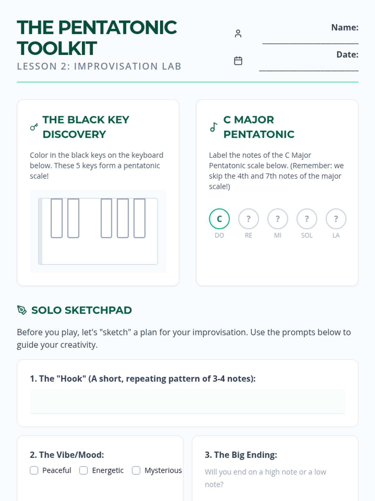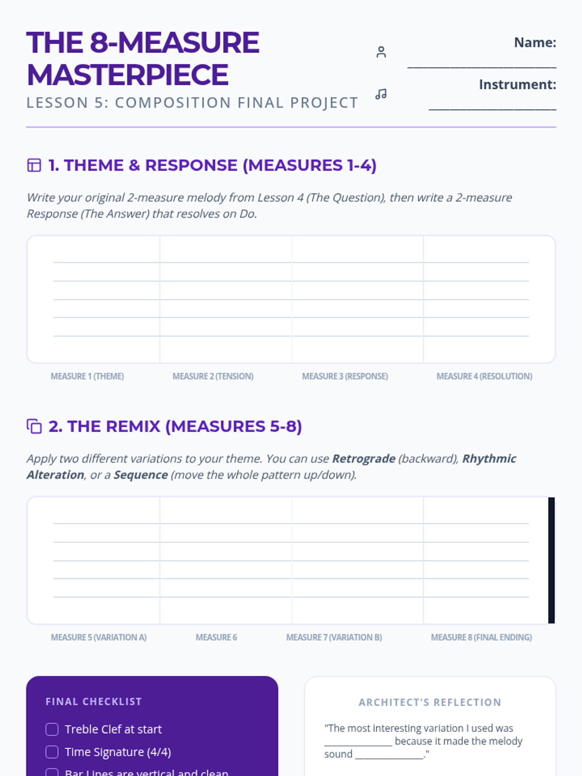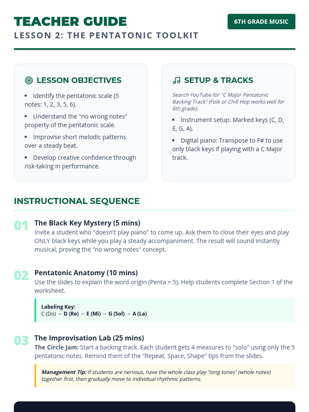 A comprehensive 5-lesson unit for 6th-grade students focused on composing memorable melodies. Students progress from visualizing melodic shapes to understanding pentatonic scales, mastering call-and-response phrasing, and finally notating and varying their own musical creations.