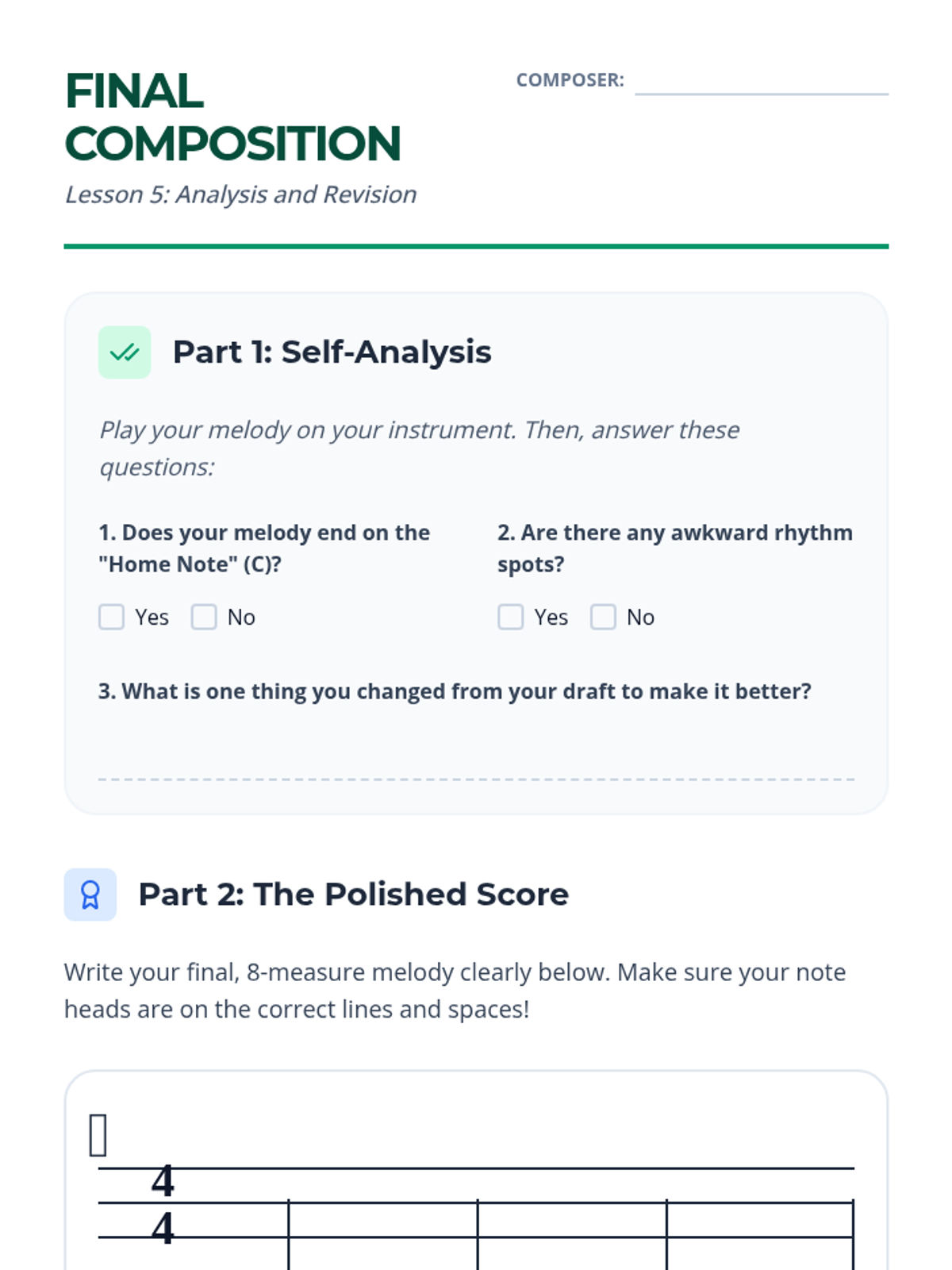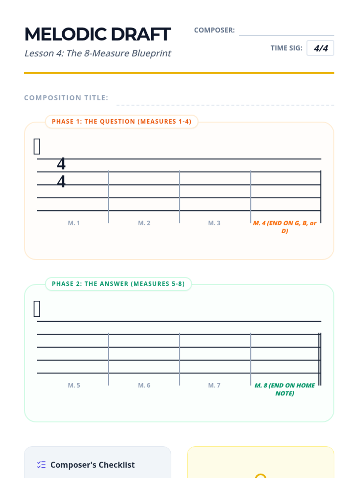 A comprehensive 5-lesson sequence for 5th-grade students to master melodic composition using standard treble clef notation, covering contour, staff literacy, phrasing, and the revision process.