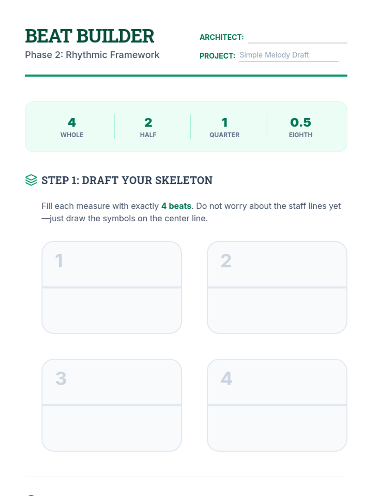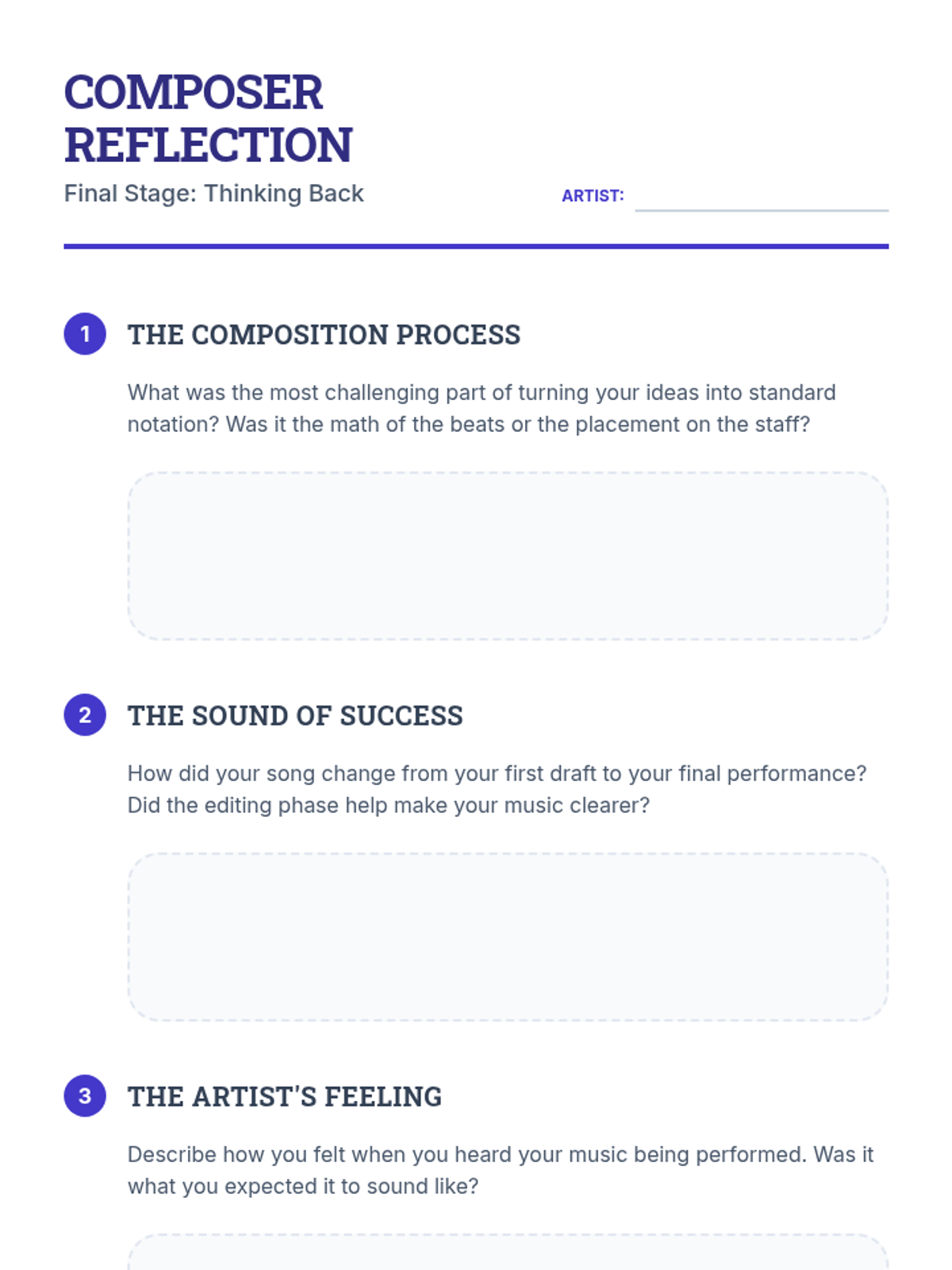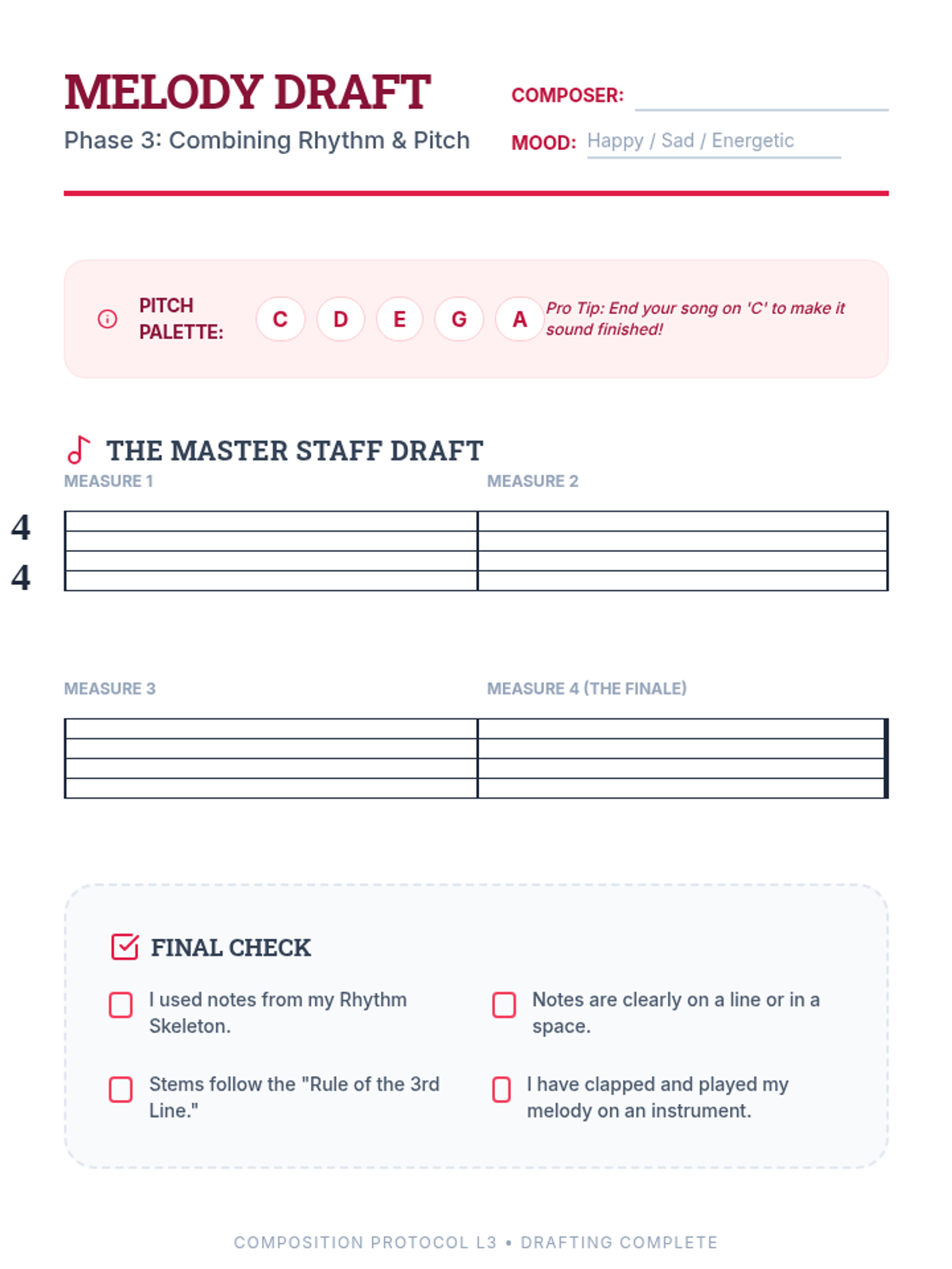 A project-based sequence where 3rd-grade students learn the fundamentals of standard music notation and composition, culminating in the creation and performance of their own 4-measure melodies. Students progress from learning the 'handwriting' of music to drafting rhythms, adding pitches, and refining their work through peer feedback.