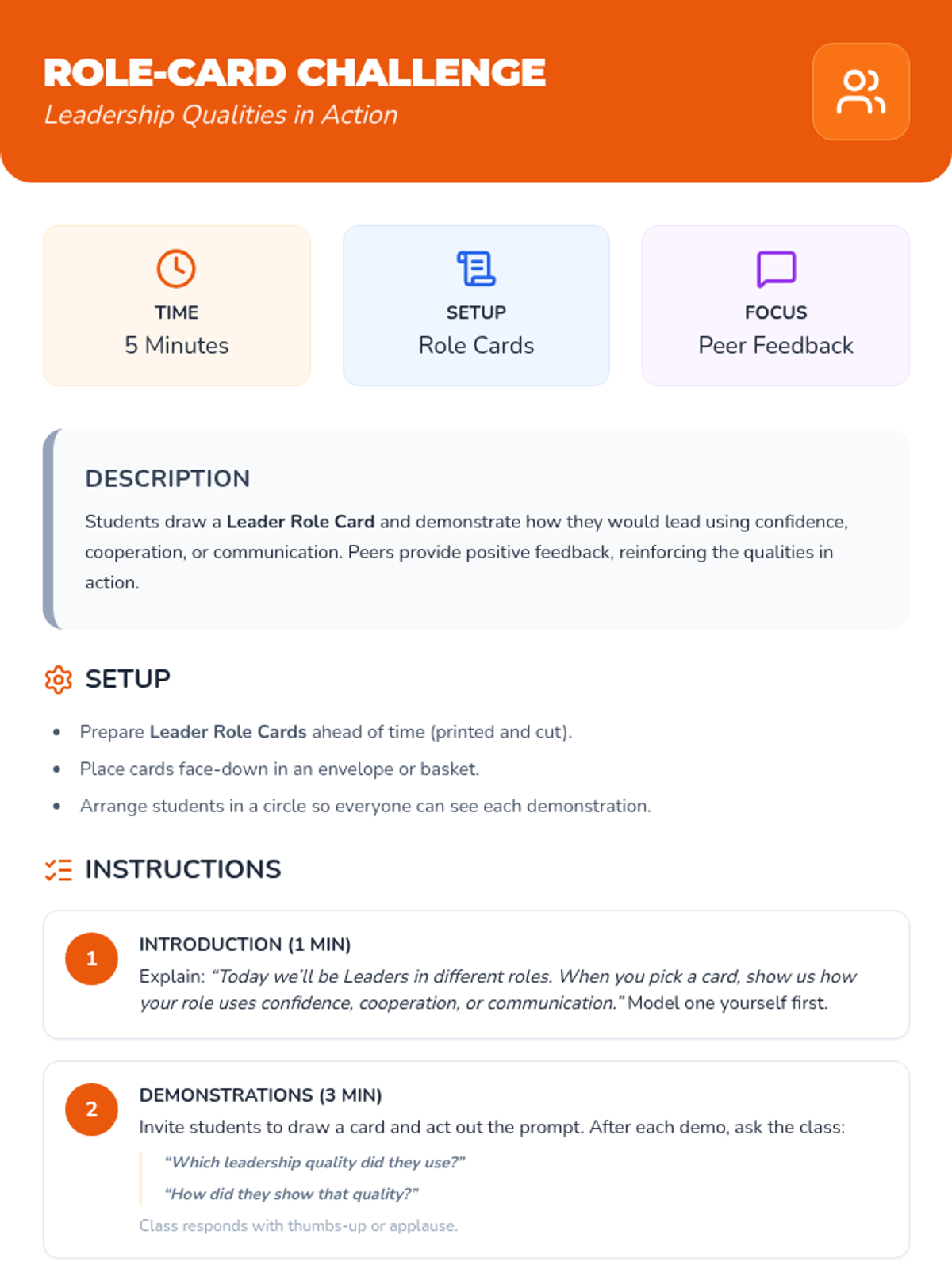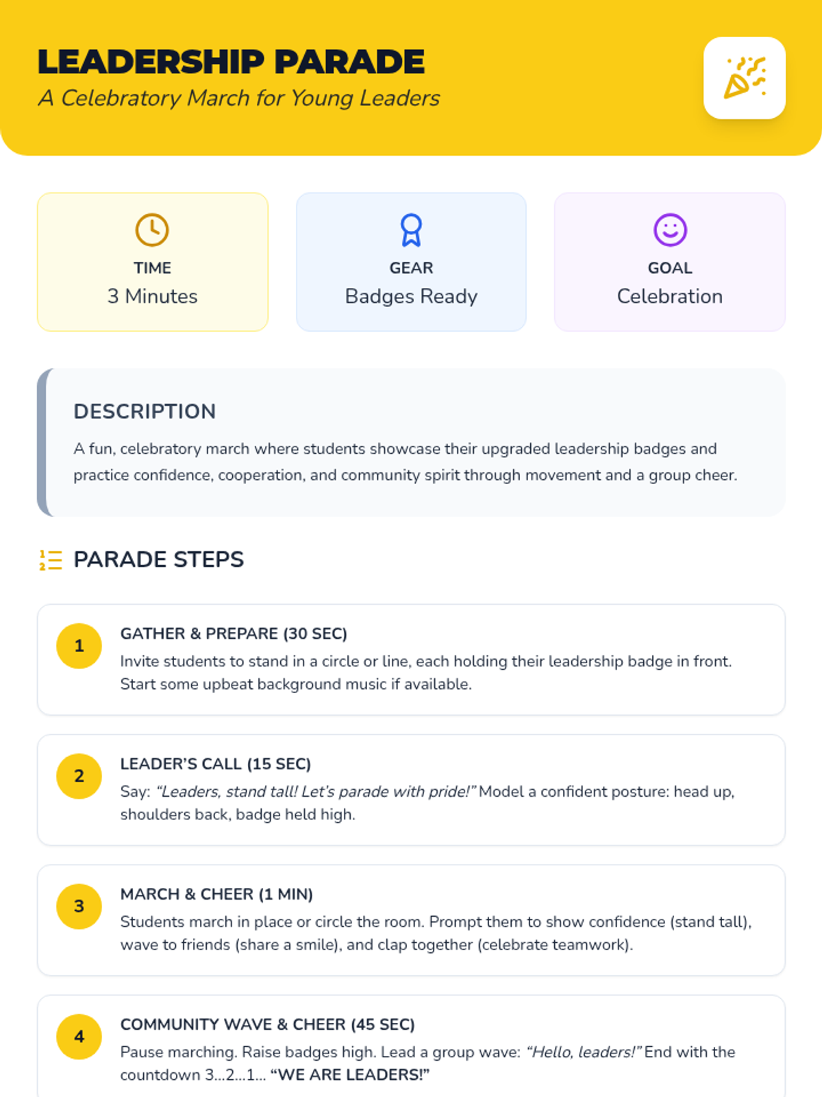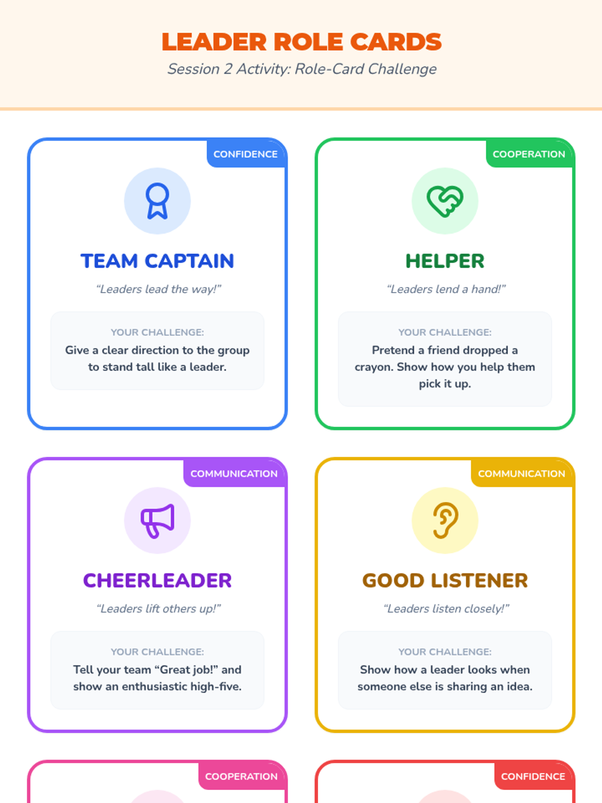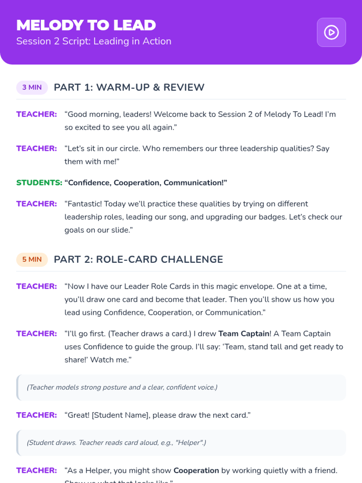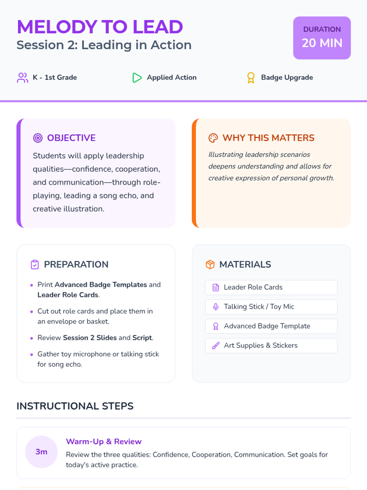 A two-session unit for Kindergarten and 1st grade that uses music, movement, and art to teach positive leadership qualities like confidence, cooperation, and communication.