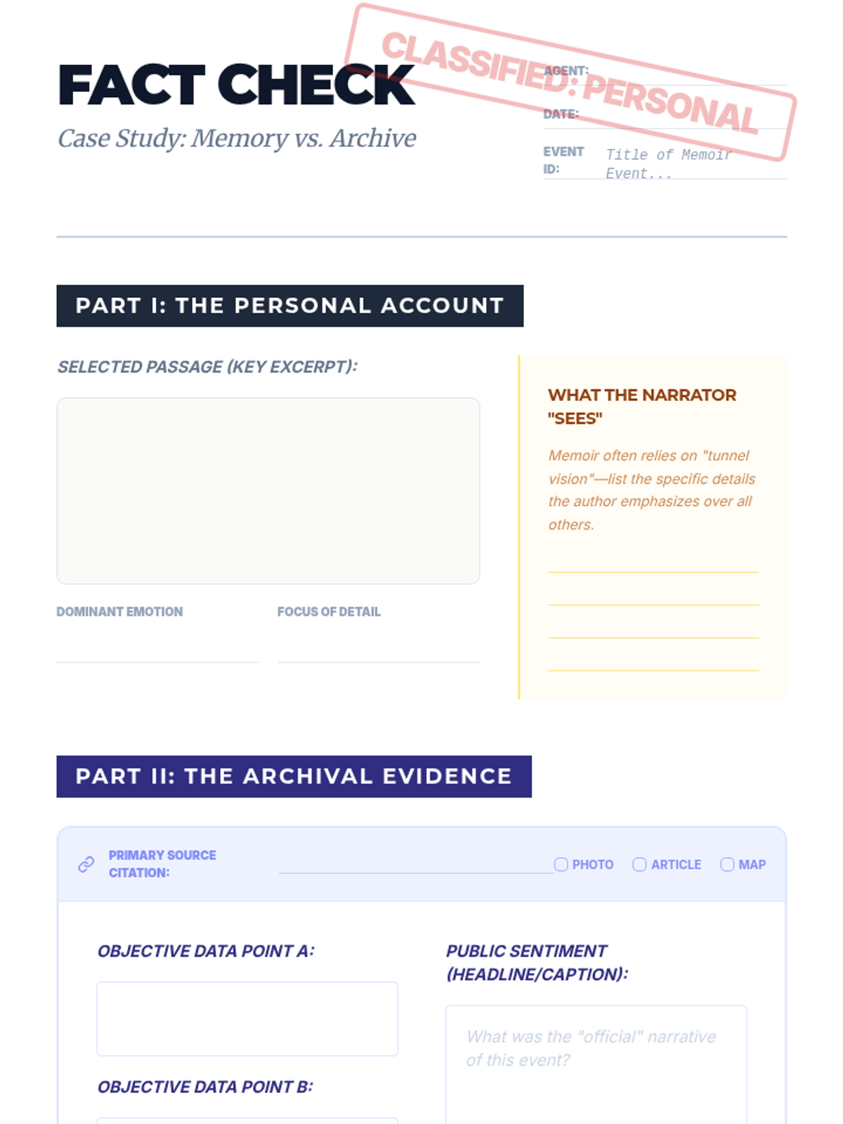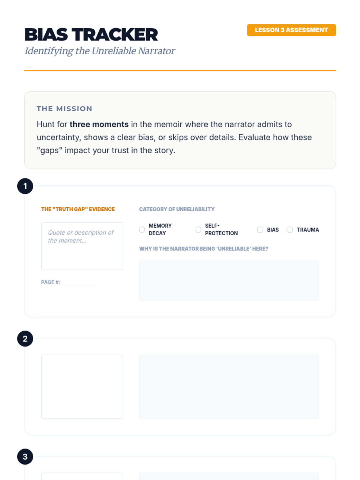 A comprehensive 12th-grade unit exploring the intersection of personal memory and historical reality in memoirs. Students analyze narrative voice, the fallibility of memory, and the connection between individual lives and larger societal movements through critical reading and comparative writing.