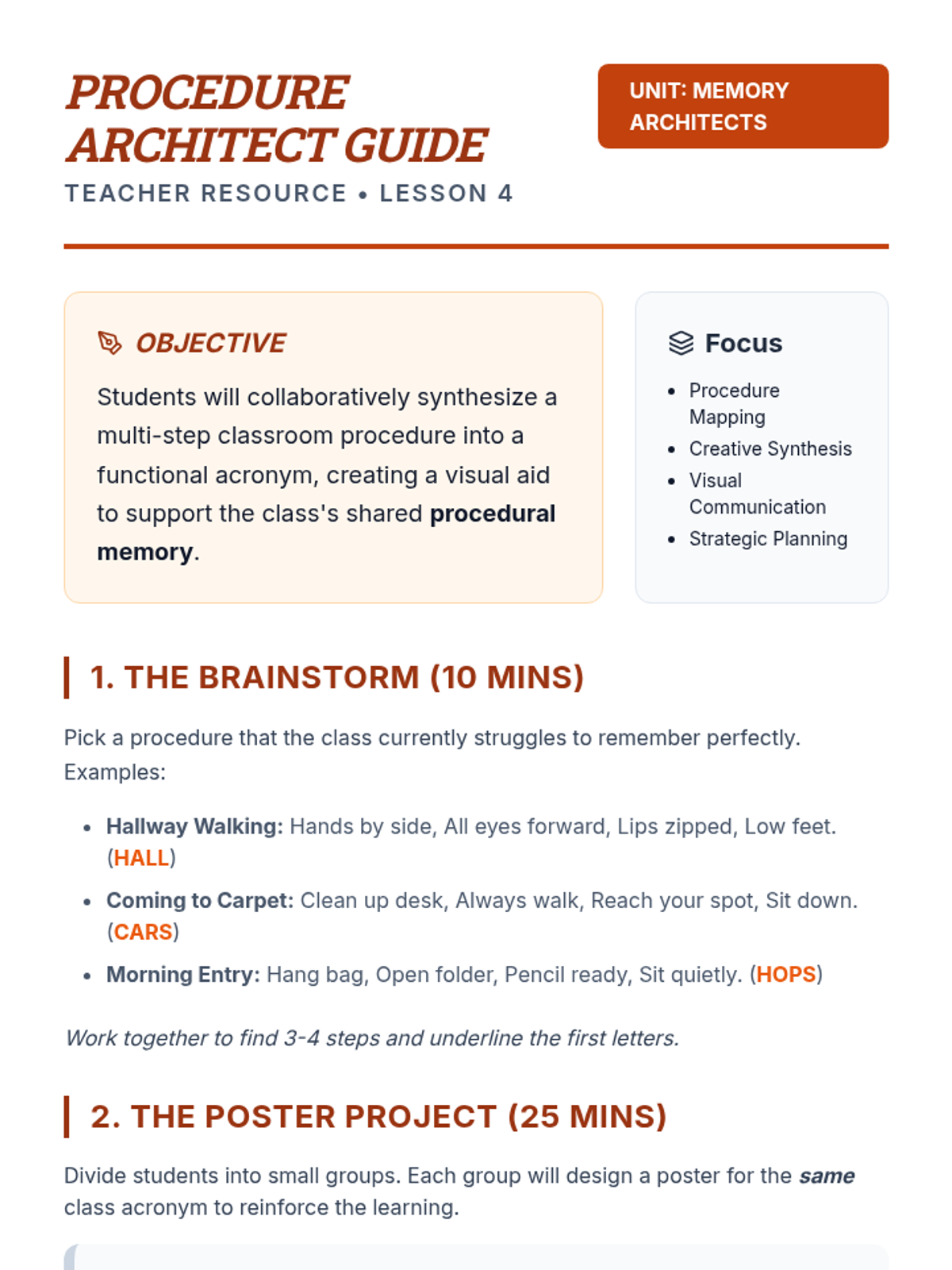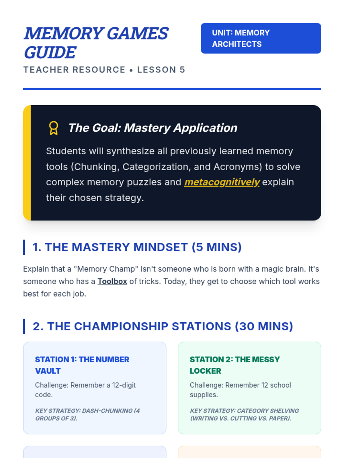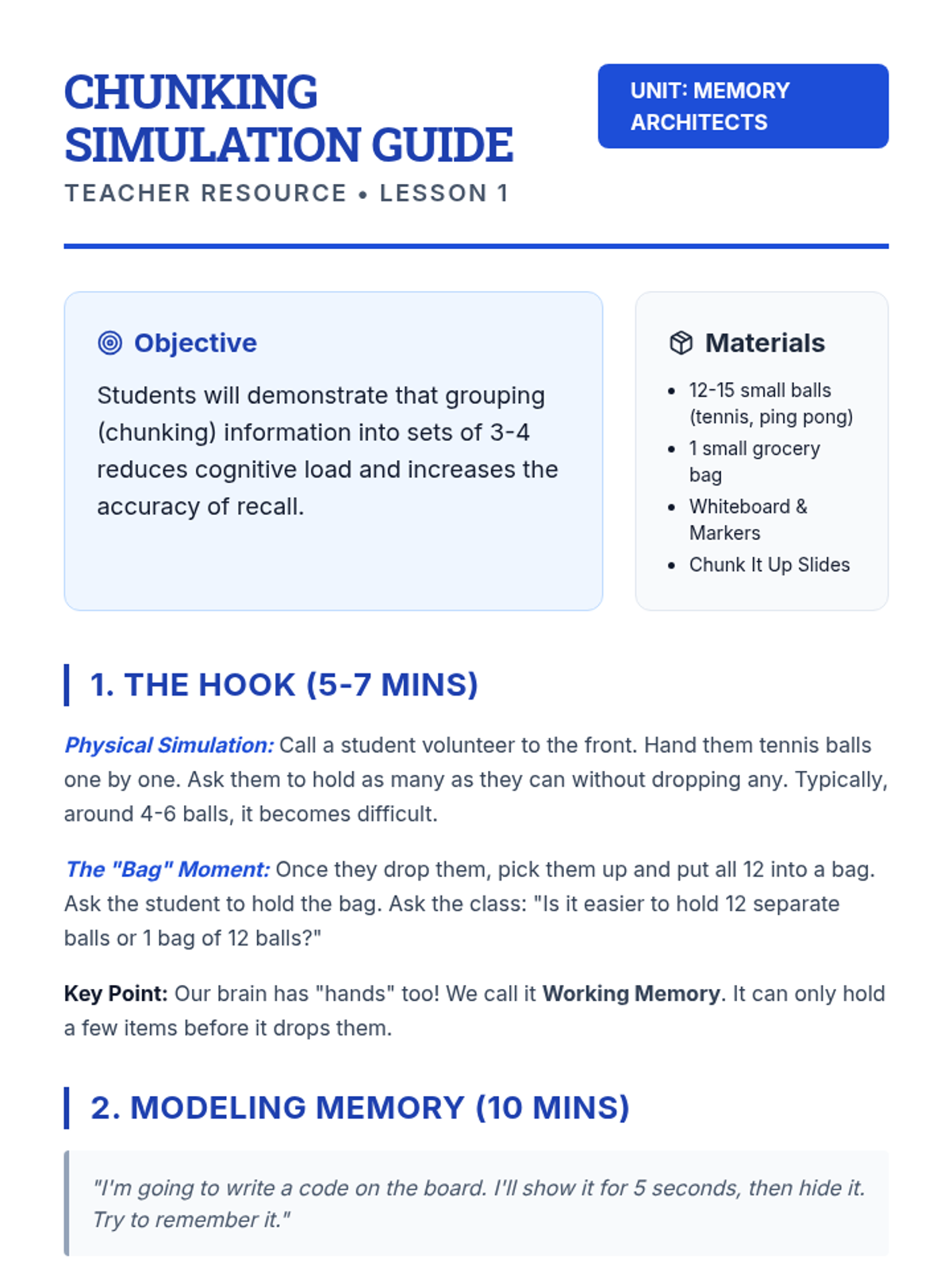 A 2nd-grade sequence focused on working memory supports, specifically 'chunking' (grouping information) and using acronyms. Students act as 'information architects' to learn how to manage mental clutter and improve recall.