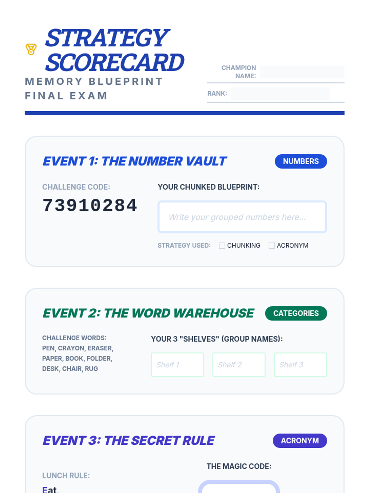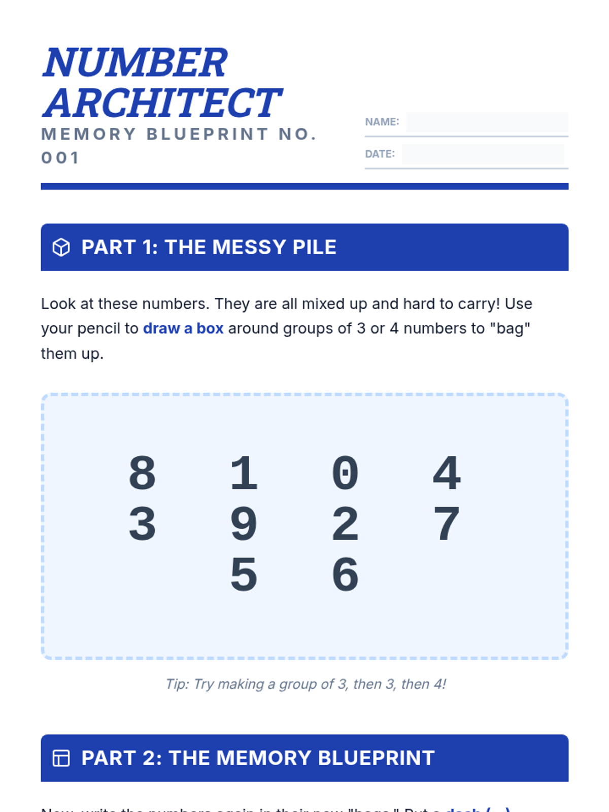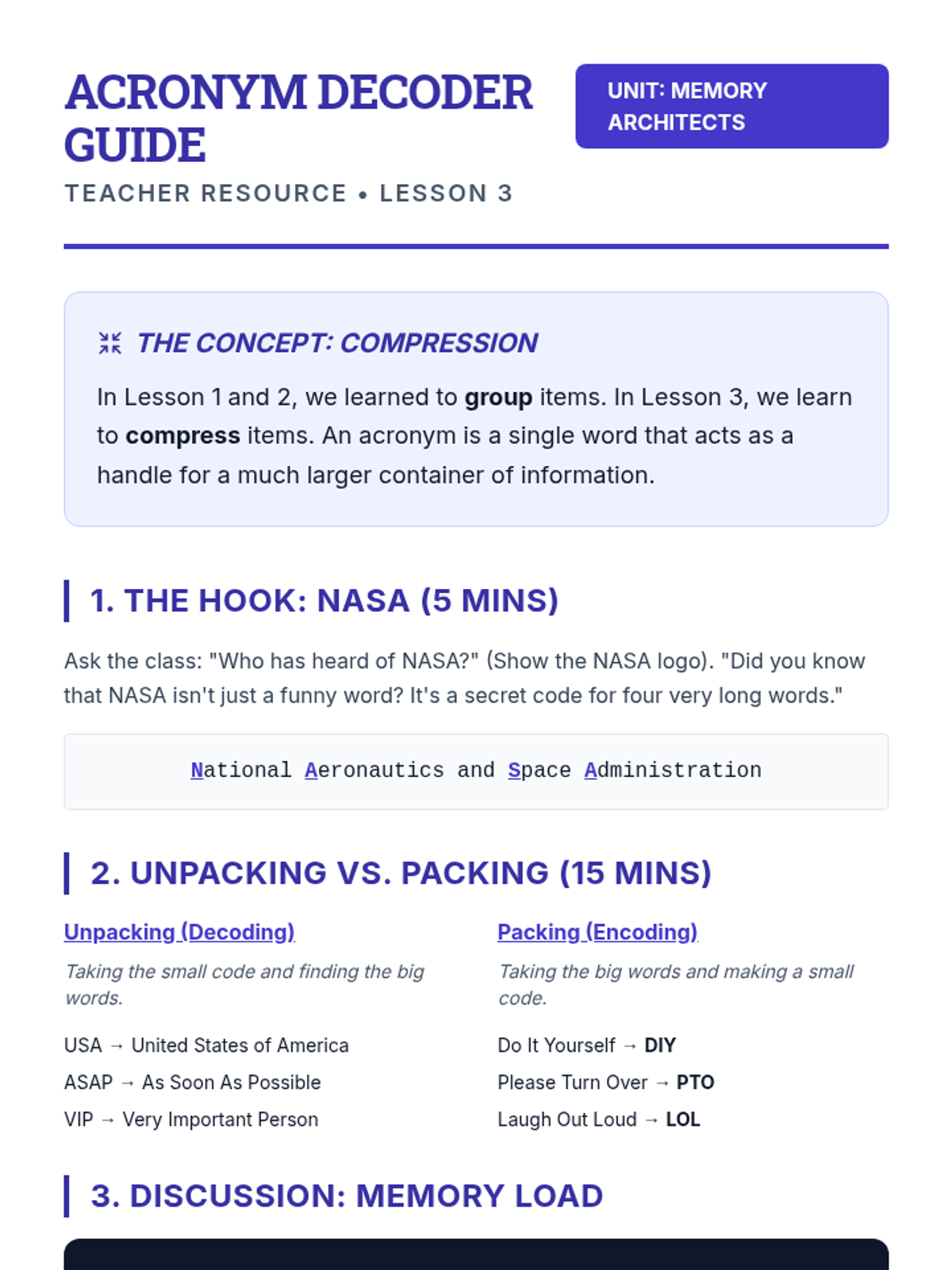 A 2nd-grade sequence focused on working memory supports, specifically 'chunking' (grouping information) and using acronyms. Students act as 'information architects' to learn how to manage mental clutter and improve recall.