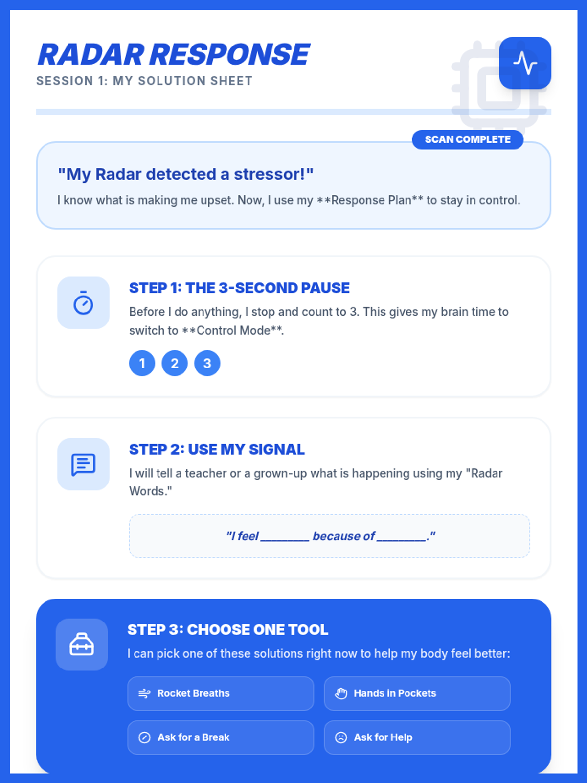 A comprehensive unit for 4th graders to identify internal body signals using a 'Blow-up Meter' metaphor and applying CBT-based strategies (breathing, grounding, and coping talk) to manage dysregulation.