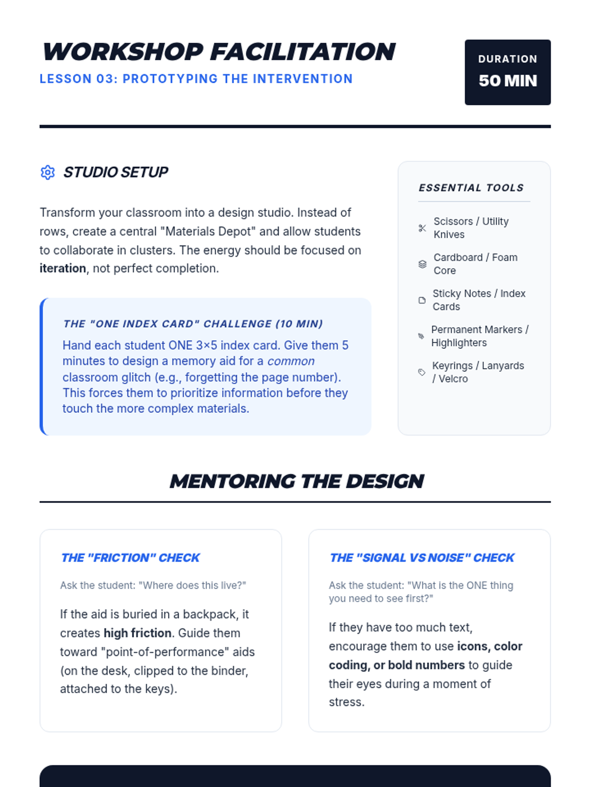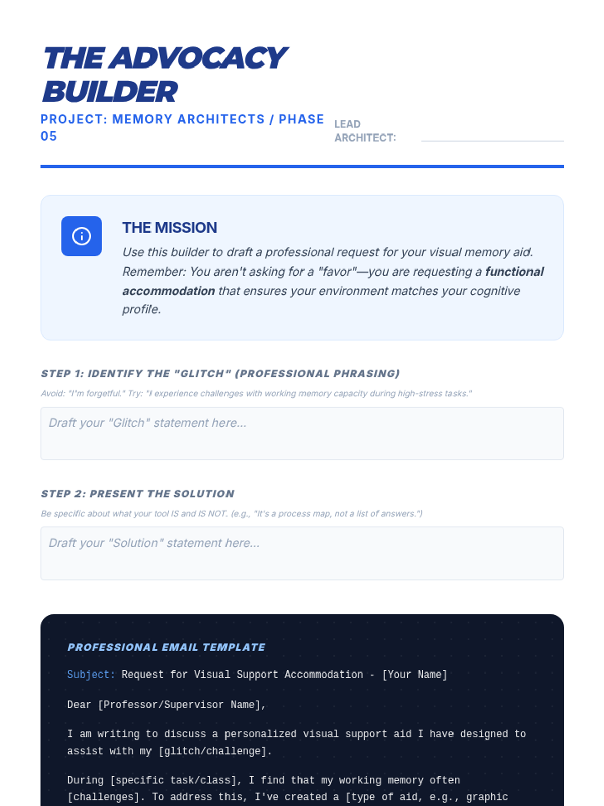 A metacognitive sequence for 11th-grade students to audit their own working memory challenges and design personalized visual support aids. Students transition from passive recipients of support to active designers and advocates for their own learning environments.