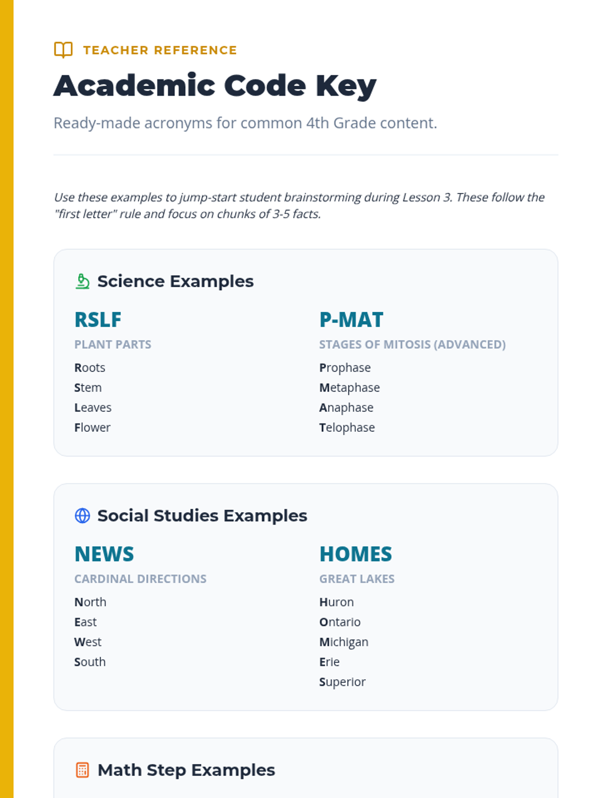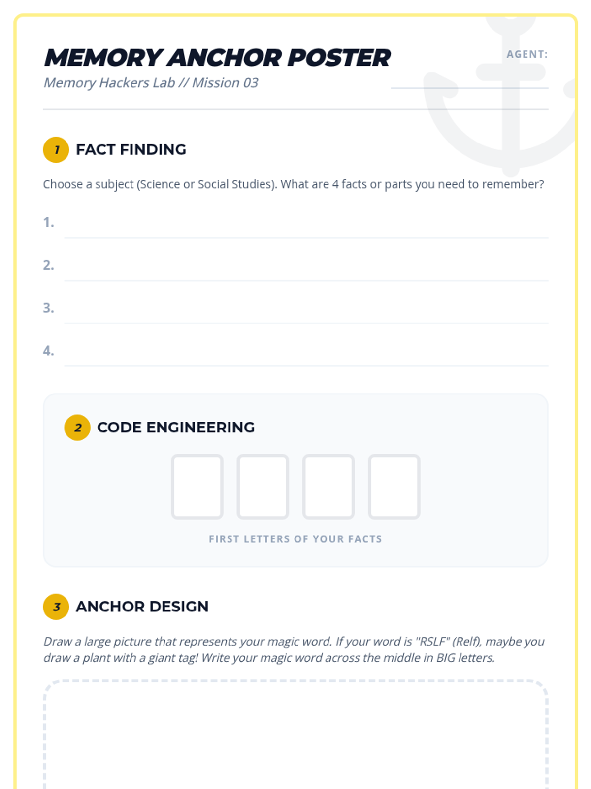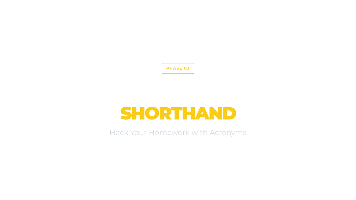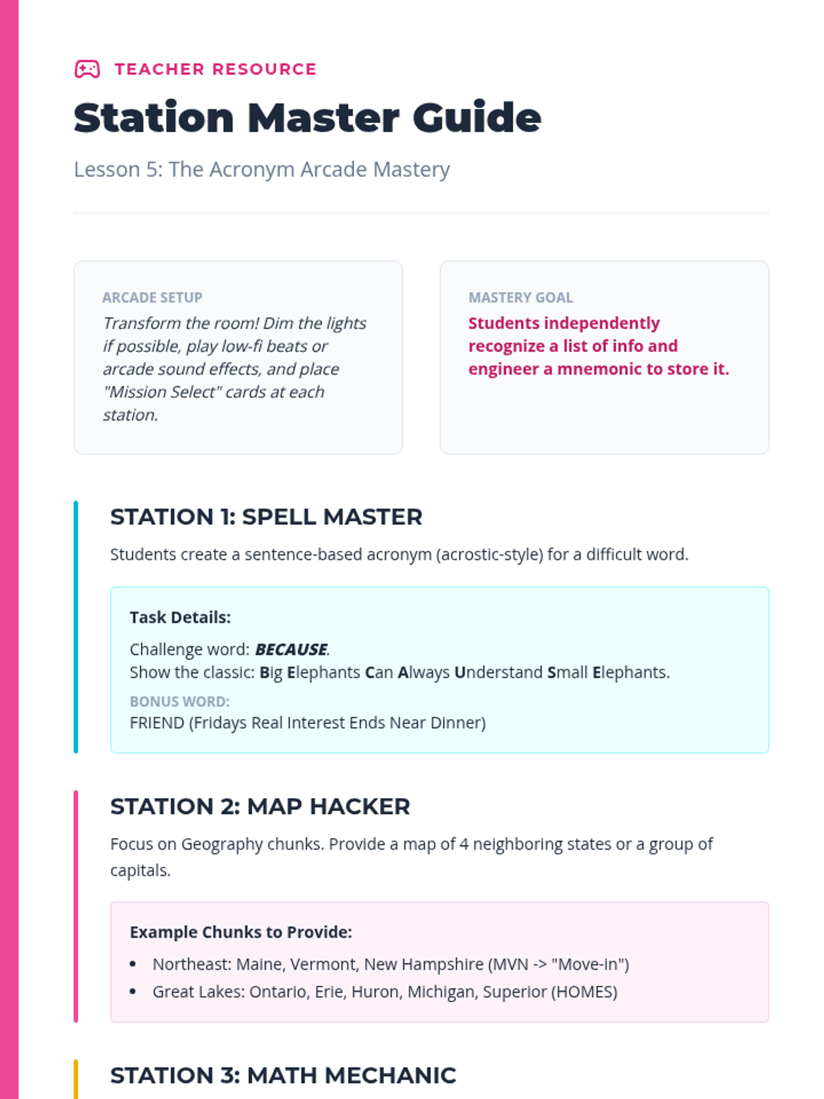 Students master the art of creating and using mnemonic acronyms to reduce cognitive load and improve concept retrieval. The sequence progresses from decoding common acronyms to engineering personal and academic ones, culminating in a mastery arcade.