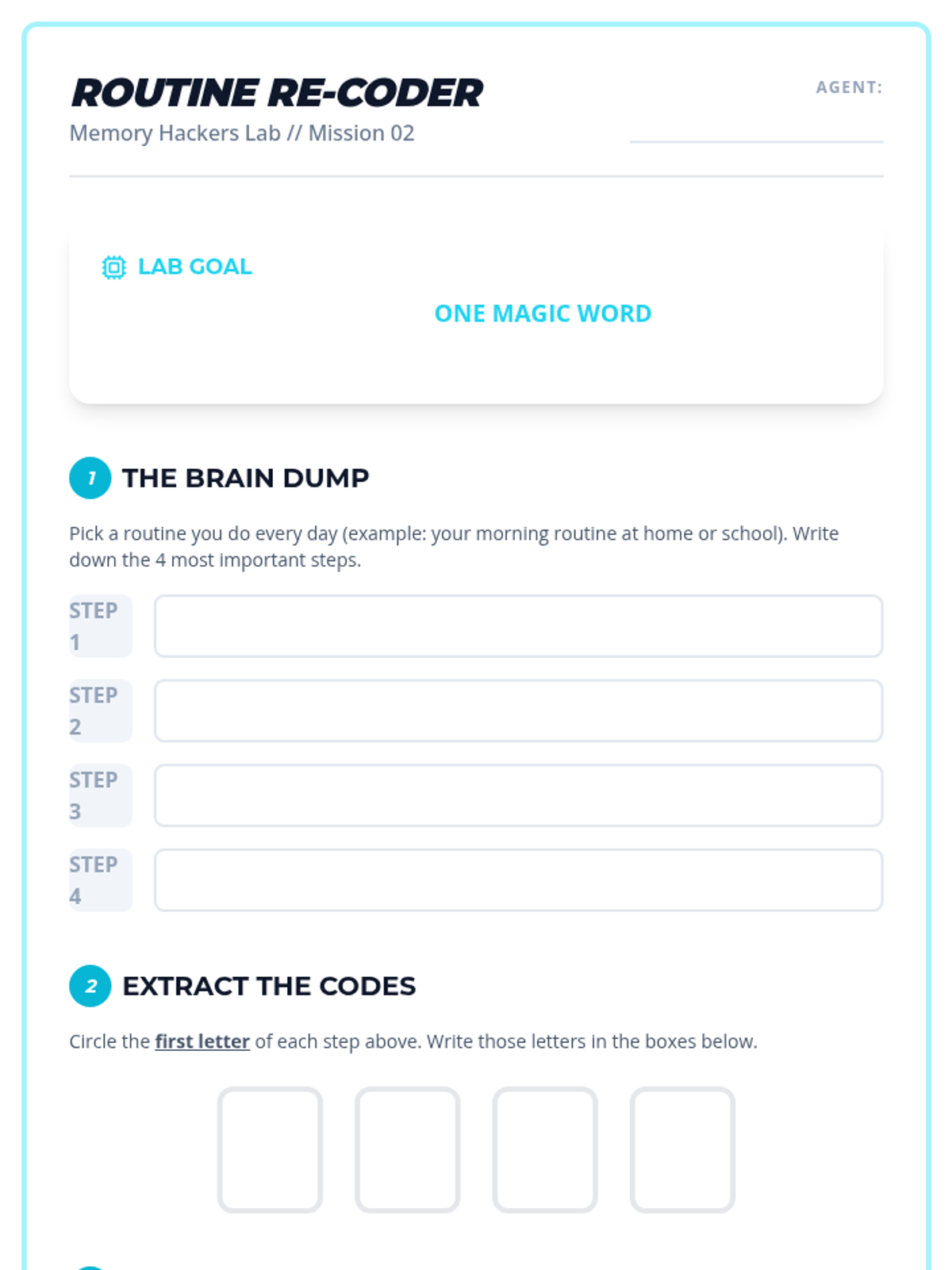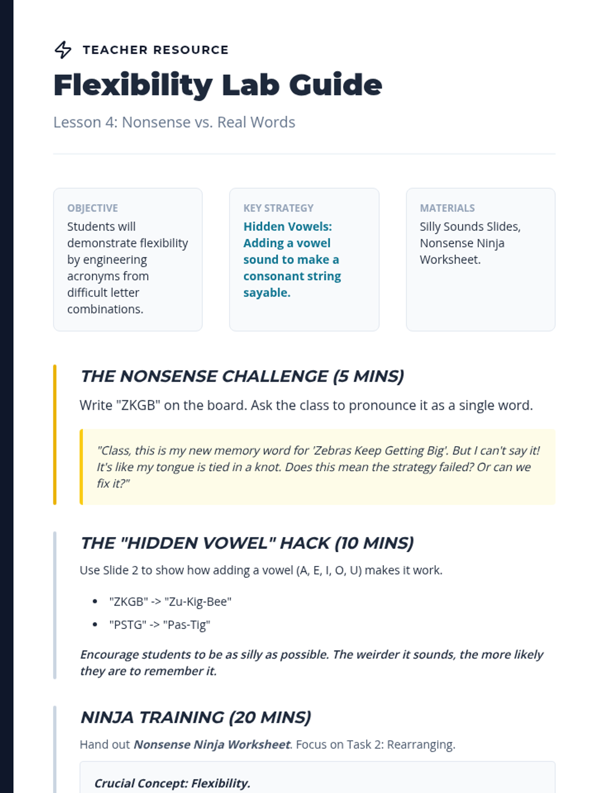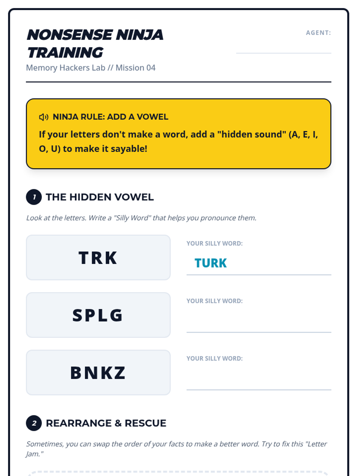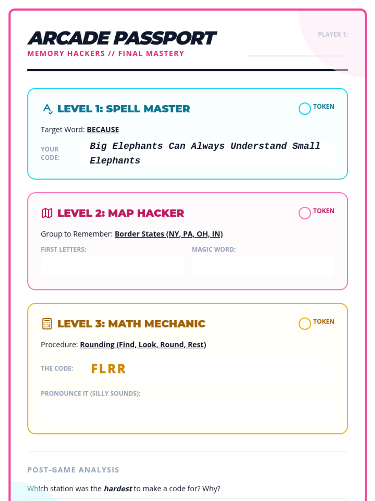 Students master the art of creating and using mnemonic acronyms to reduce cognitive load and improve concept retrieval. The sequence progresses from decoding common acronyms to engineering personal and academic ones, culminating in a mastery arcade.