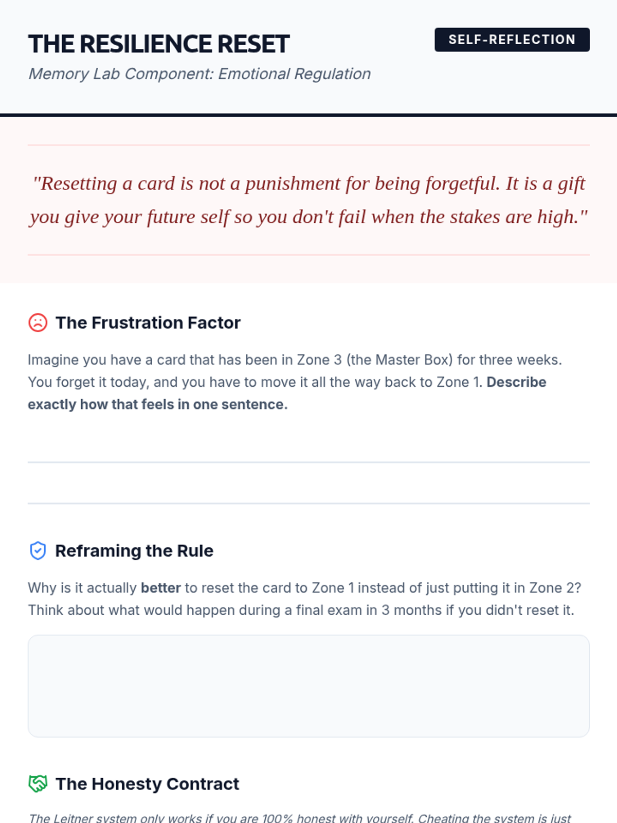 A comprehensive sequence for 10th-grade students to master the Leitner System of spaced repetition. Students build physical study boxes, learn to design high-quality active recall cards, and develop the self-honesty and routines required for long-term memory retention.