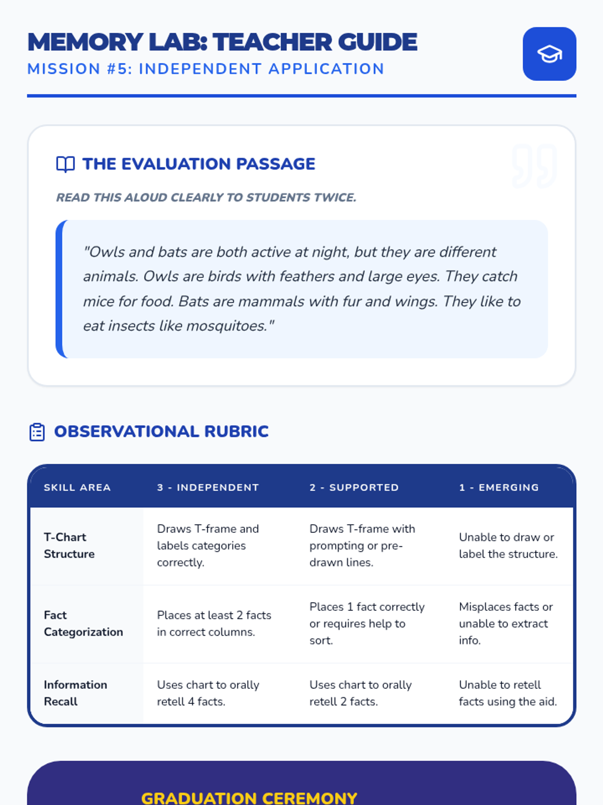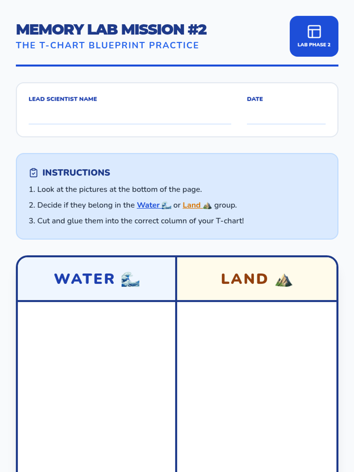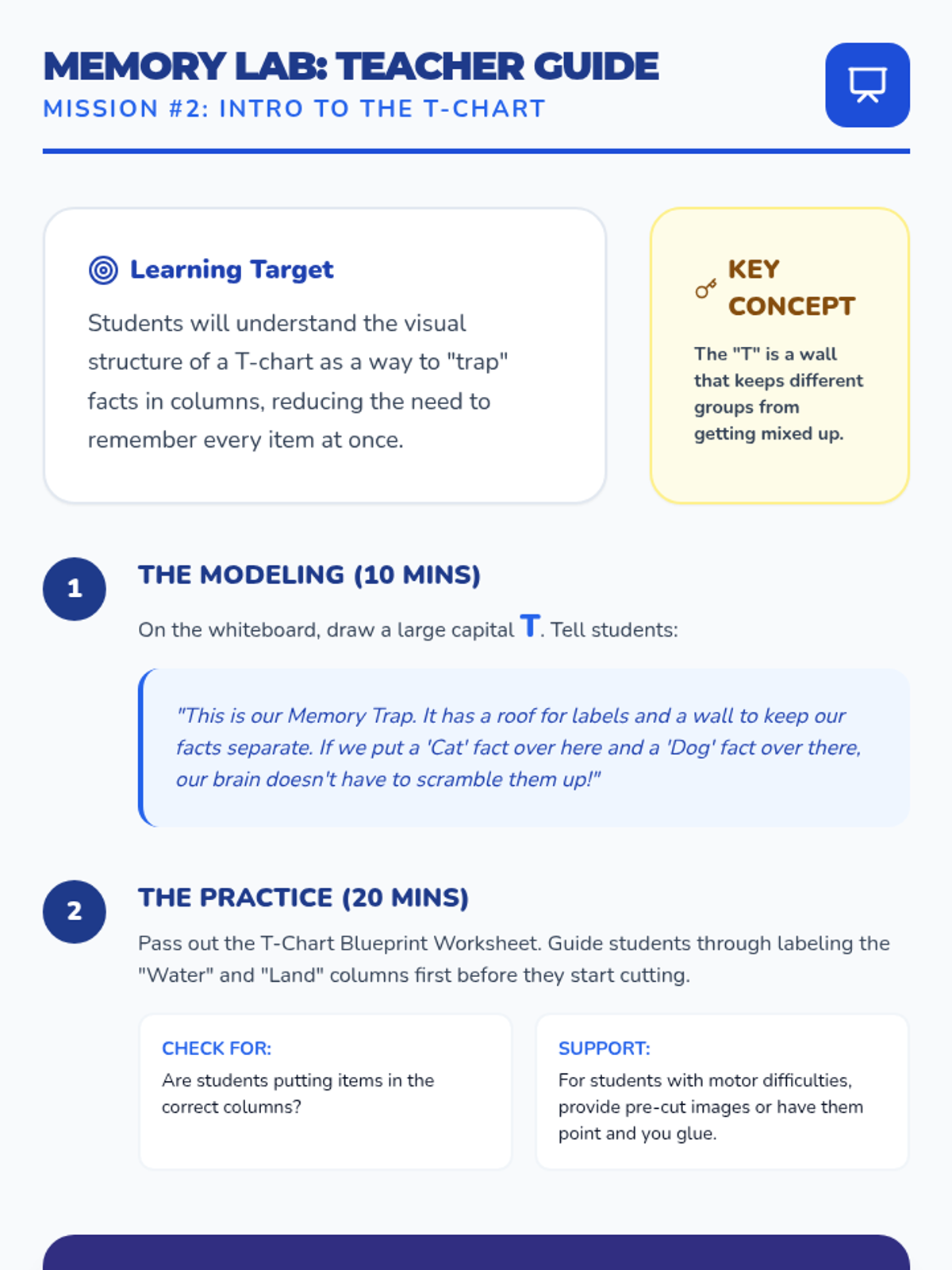 A 5-lesson sequence for 2nd-grade students focusing on working memory support through graphic organizers. Students move from physical sorting to auditory classification and finally to independent T-chart note-taking to aid information recall.