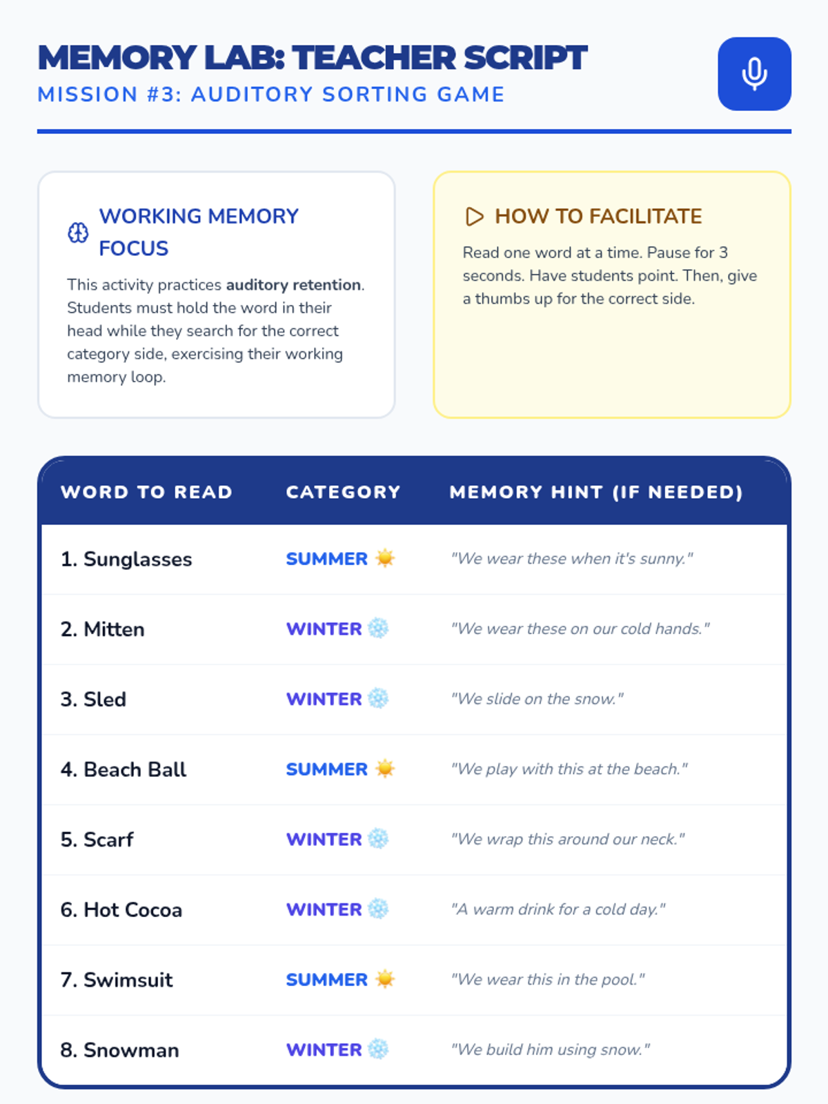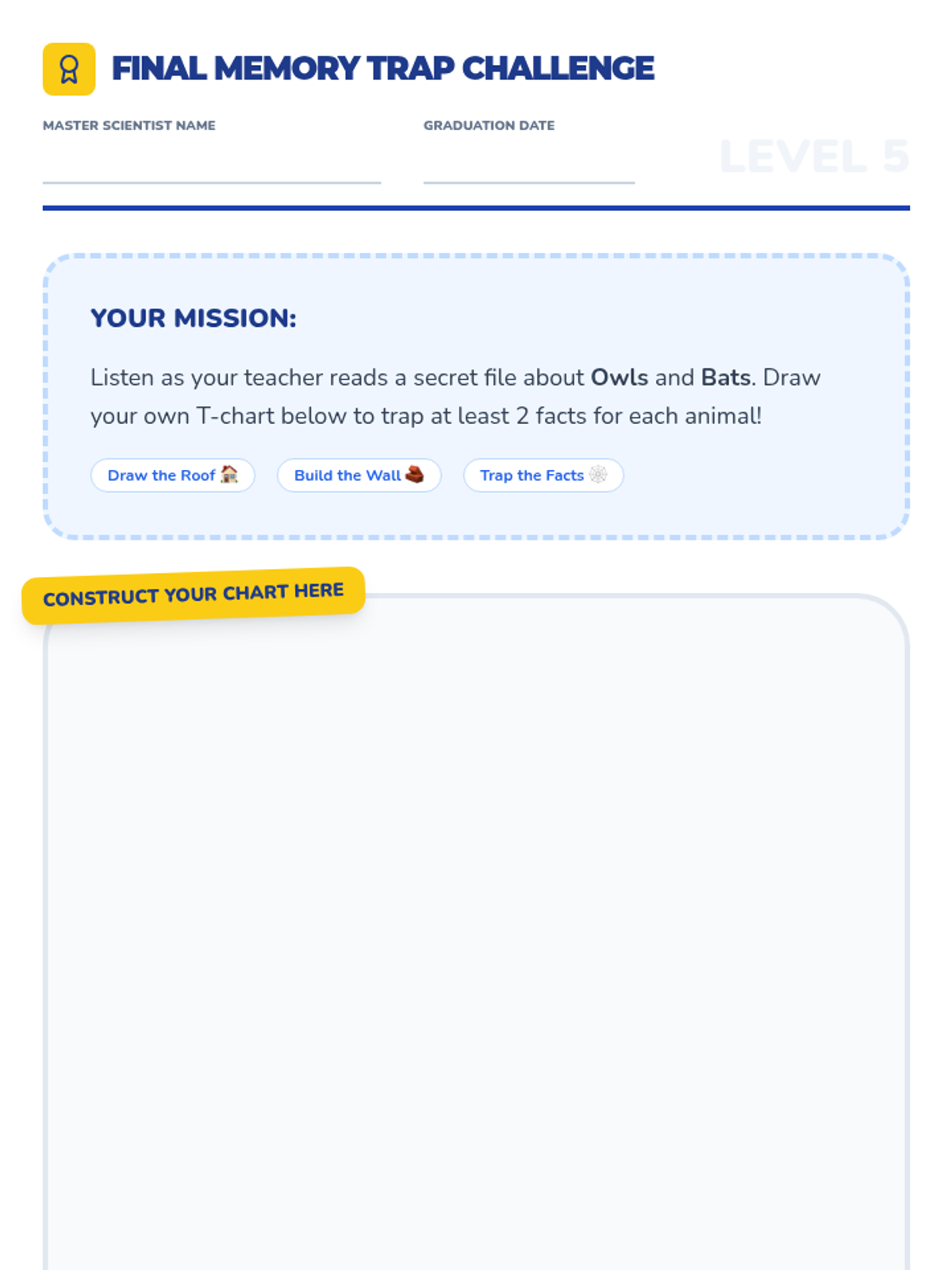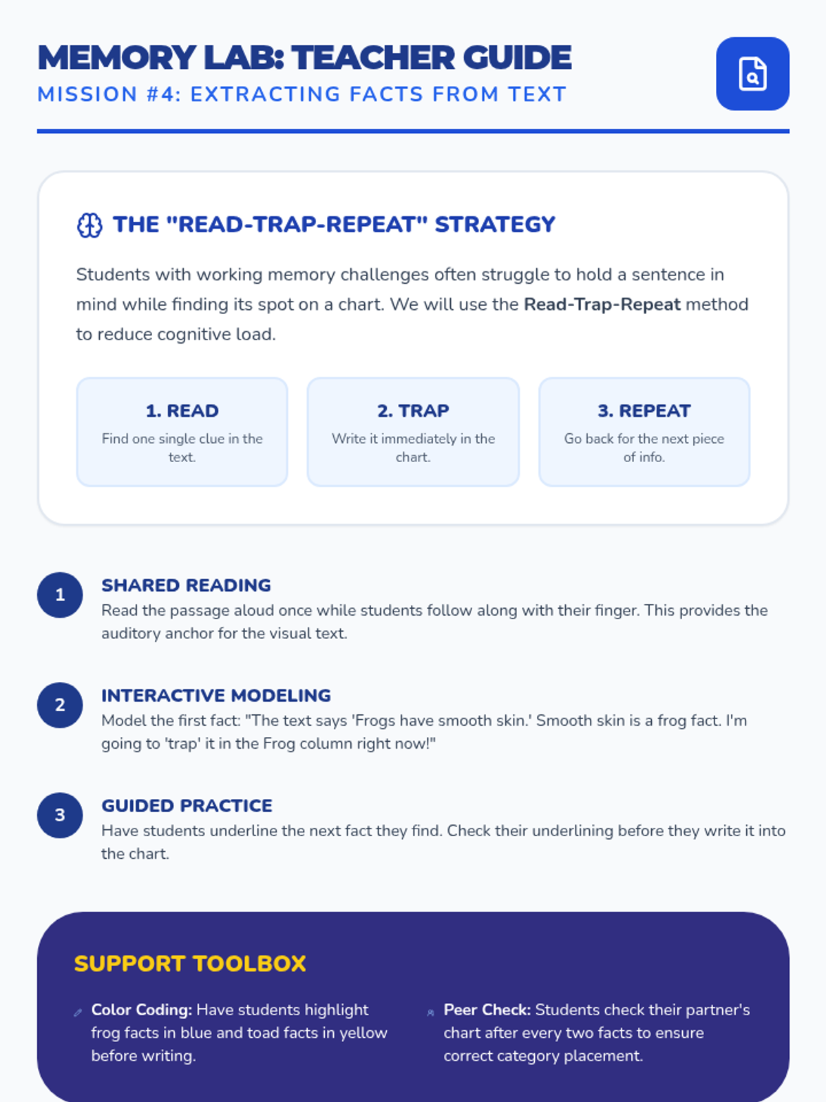 A 5-lesson sequence for 2nd-grade students focusing on working memory support through graphic organizers. Students move from physical sorting to auditory classification and finally to independent T-chart note-taking to aid information recall.