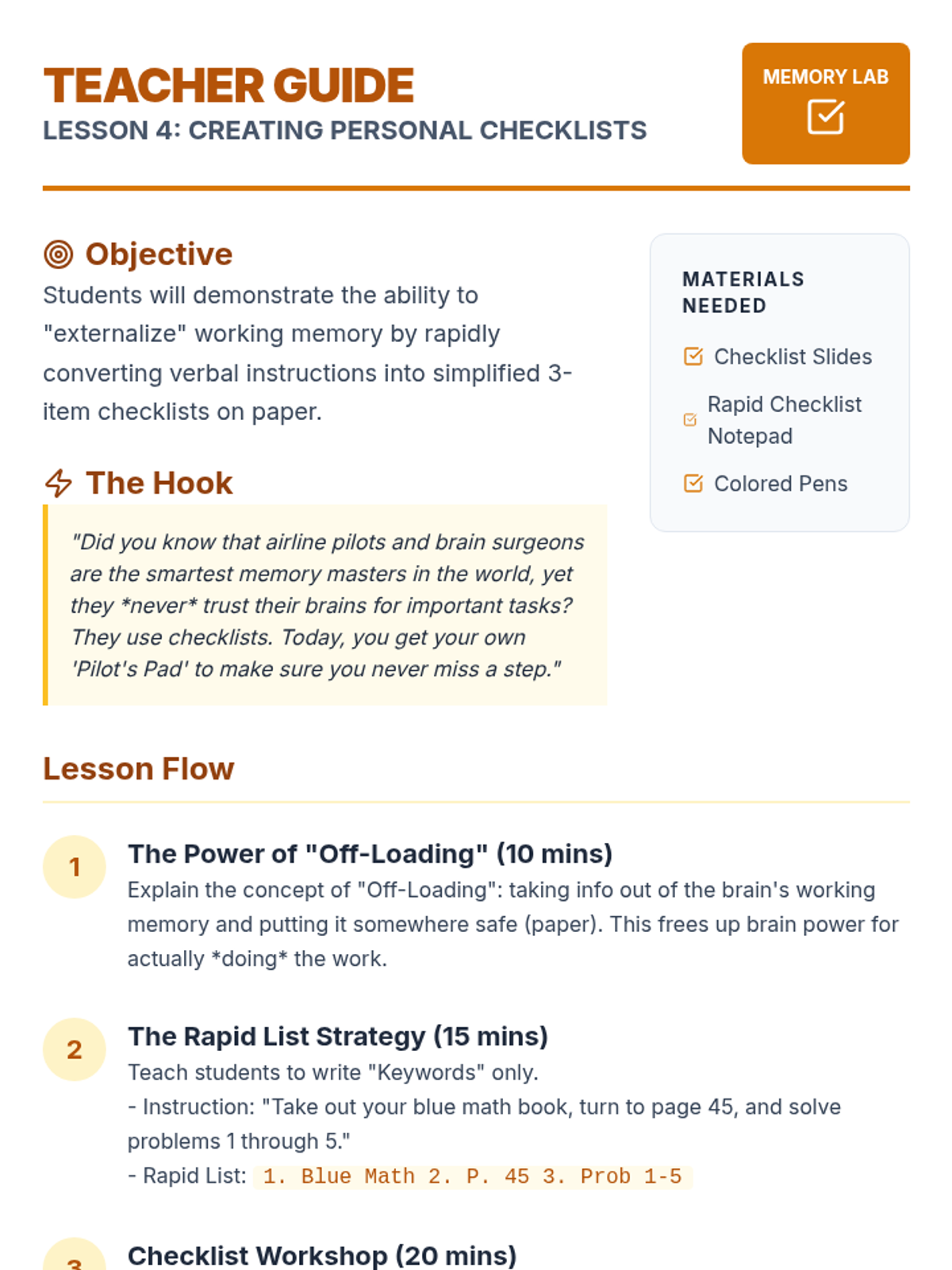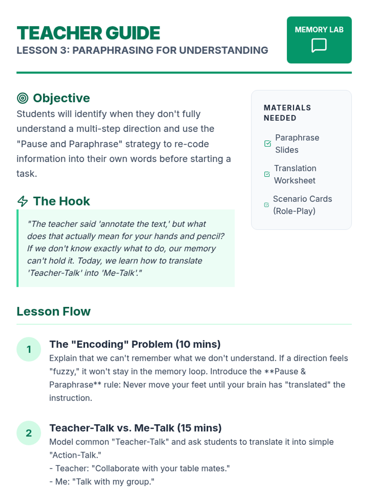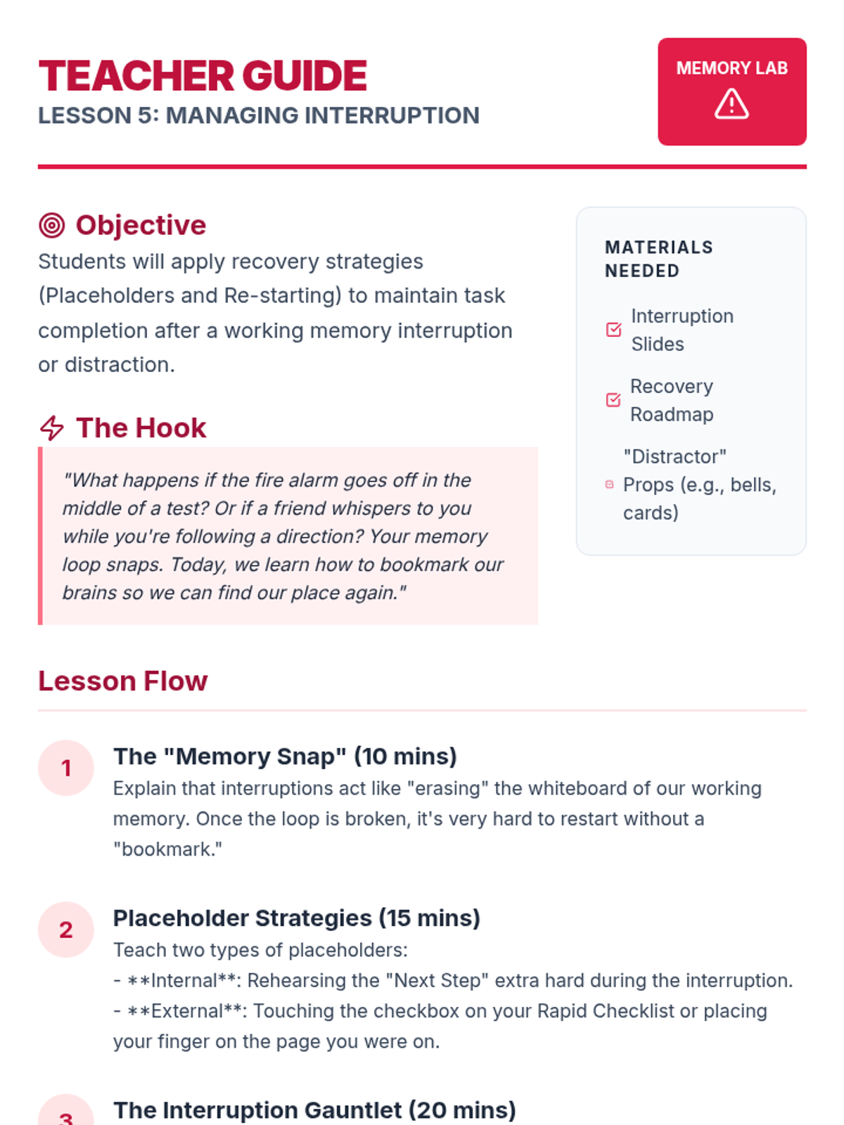 A 5-lesson sequence for 5th-grade students focused on executive function skills, specifically chunking and verbal rehearsal, to improve multi-step direction following. Students move from basic memory strategies to creating external aids and managing distractions.