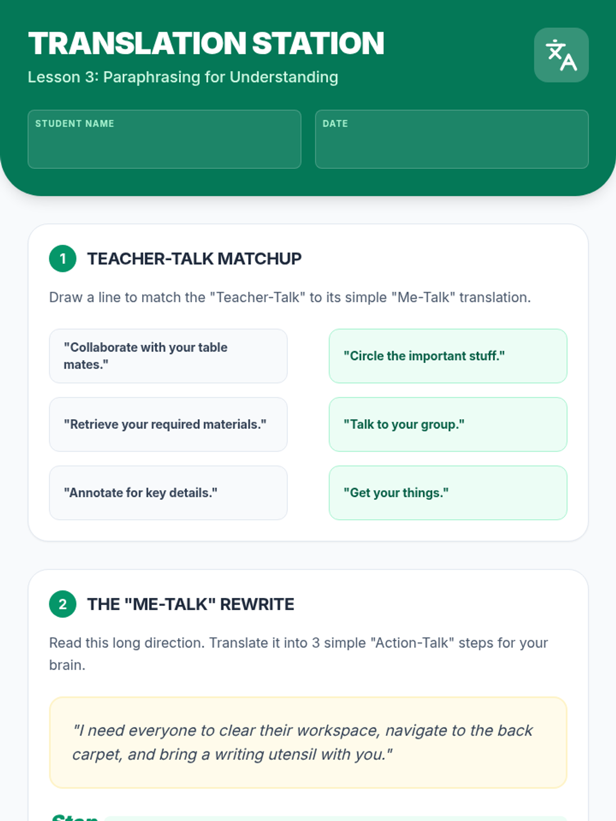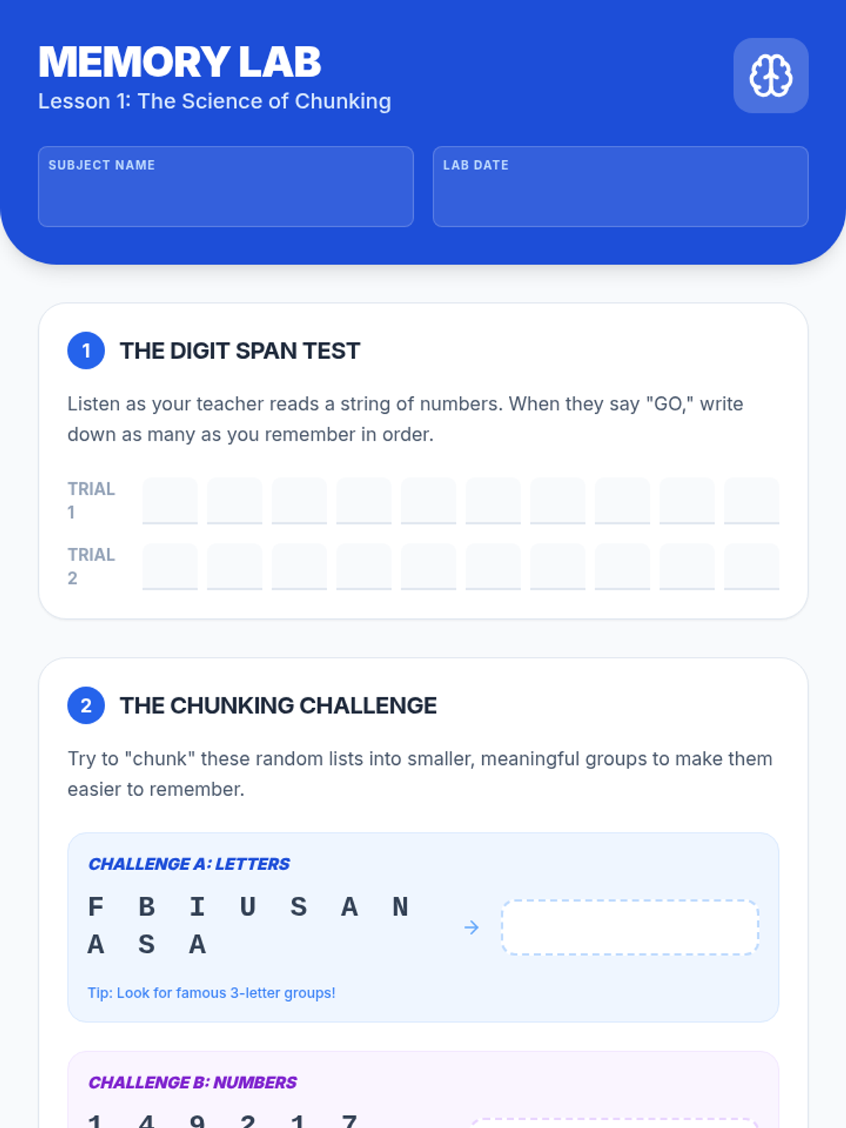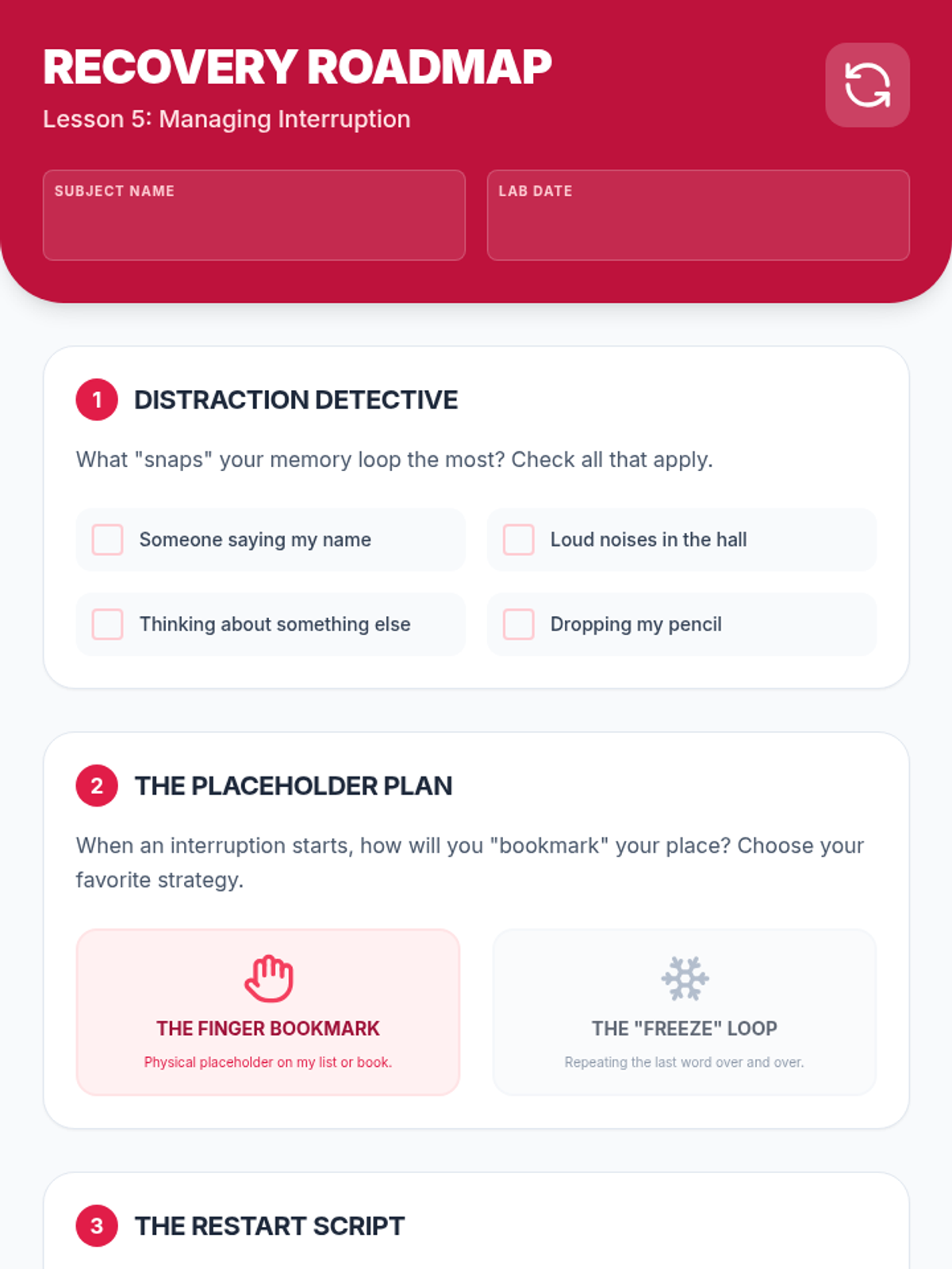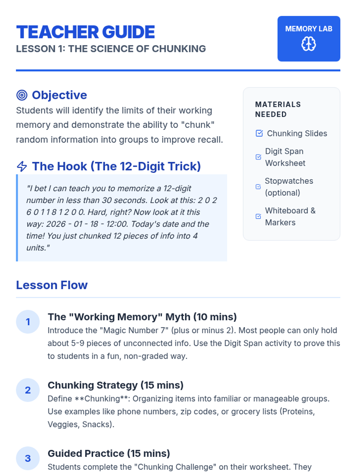 A 5-lesson sequence for 5th-grade students focused on executive function skills, specifically chunking and verbal rehearsal, to improve multi-step direction following. Students move from basic memory strategies to creating external aids and managing distractions.