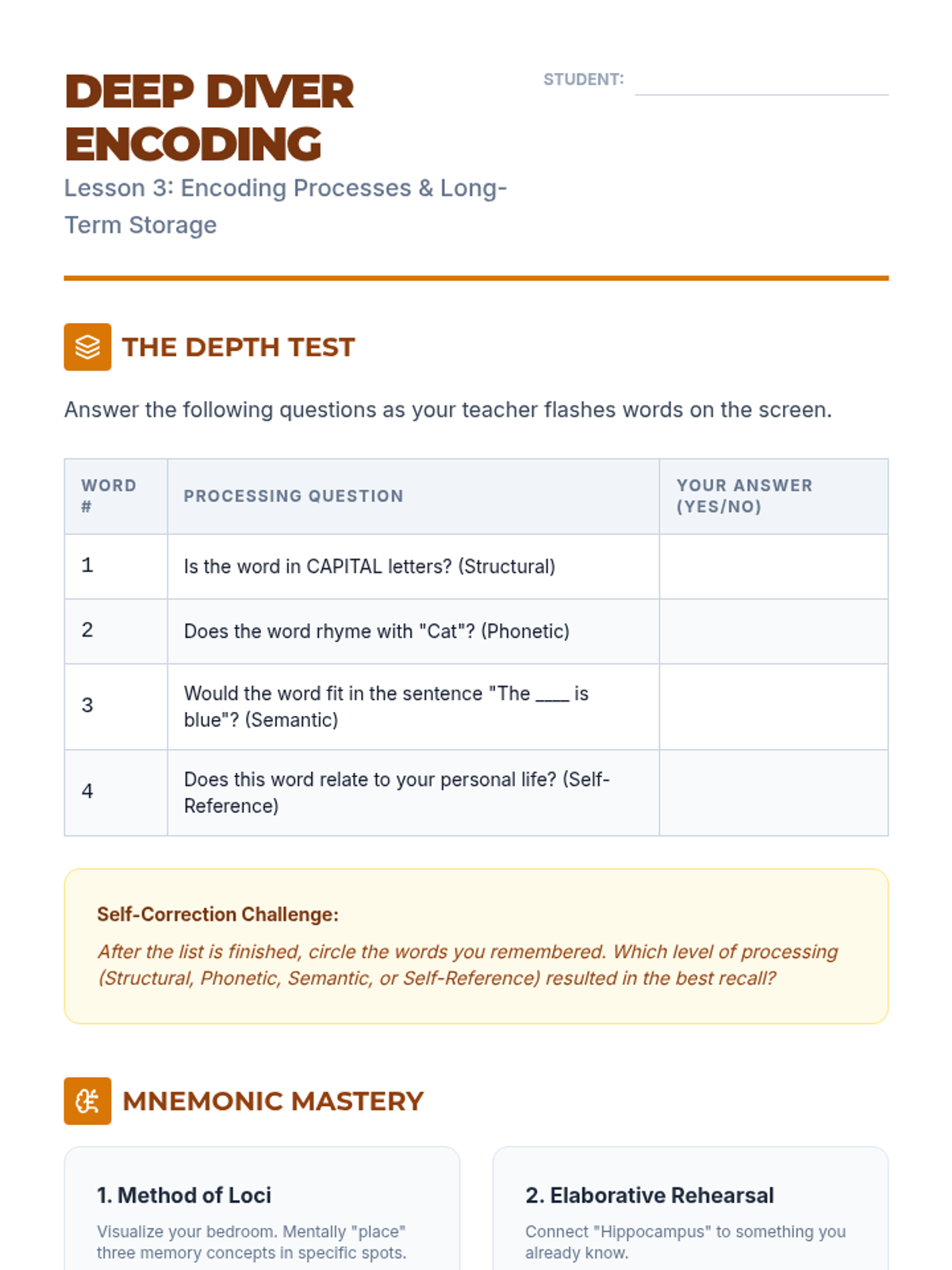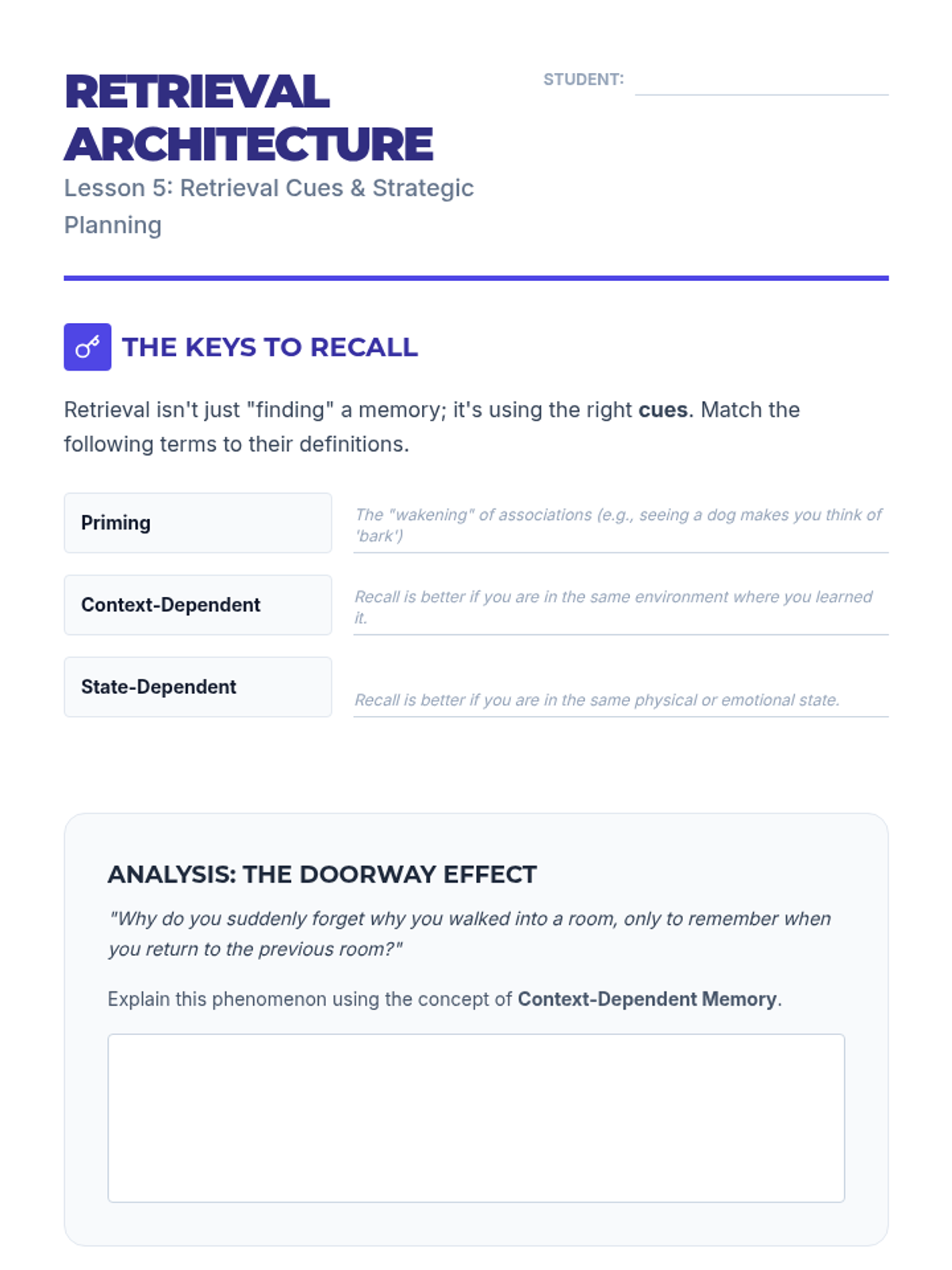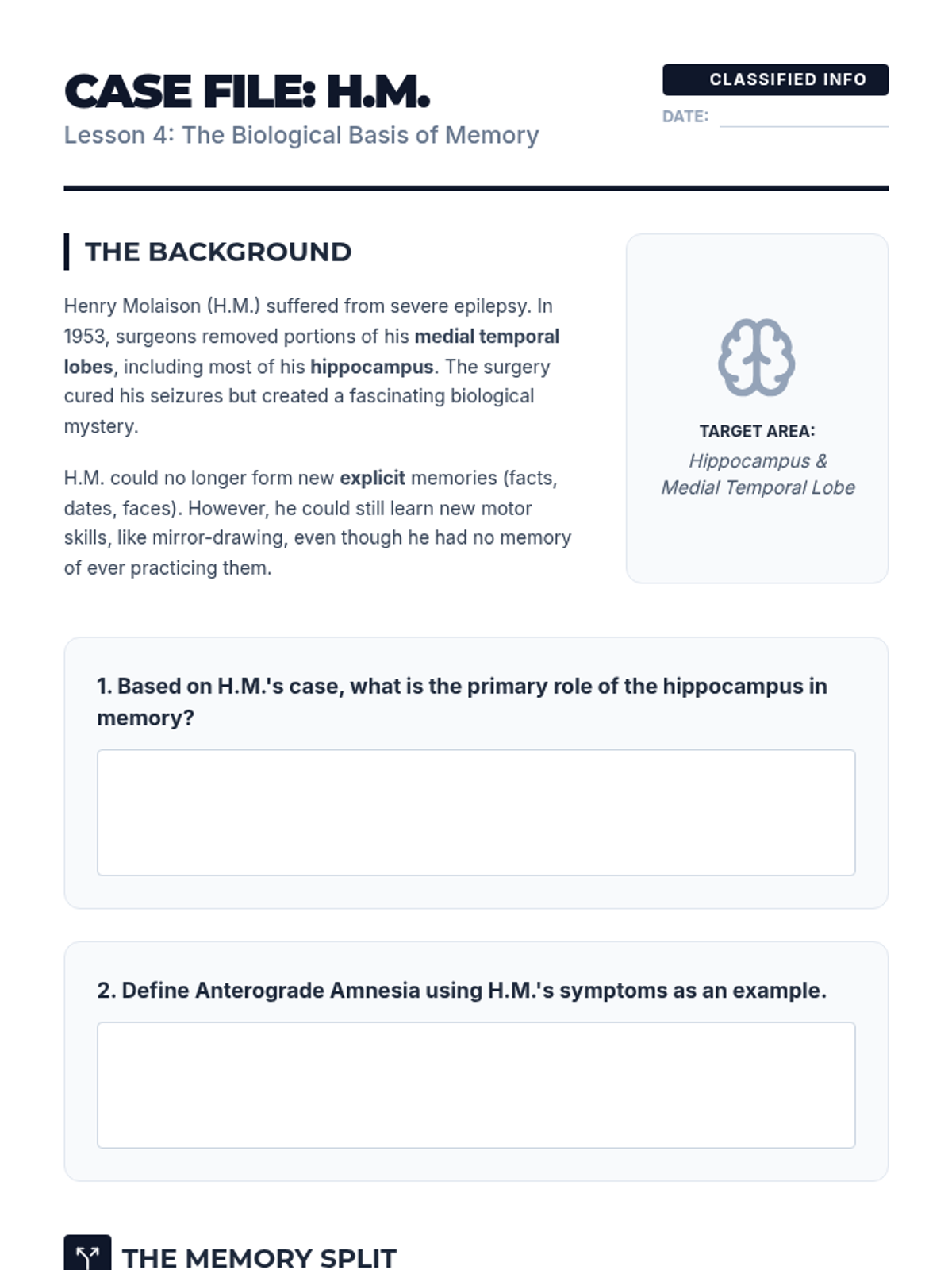 A comprehensive 12th-grade psychology sequence exploring the Atkinson-Shiffrin model of memory. Students investigate sensory, short-term, and long-term memory through interactive experiments, biological analysis of neural pathways, and practical retrieval strategies.