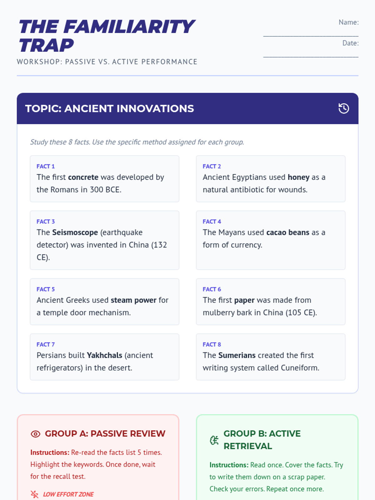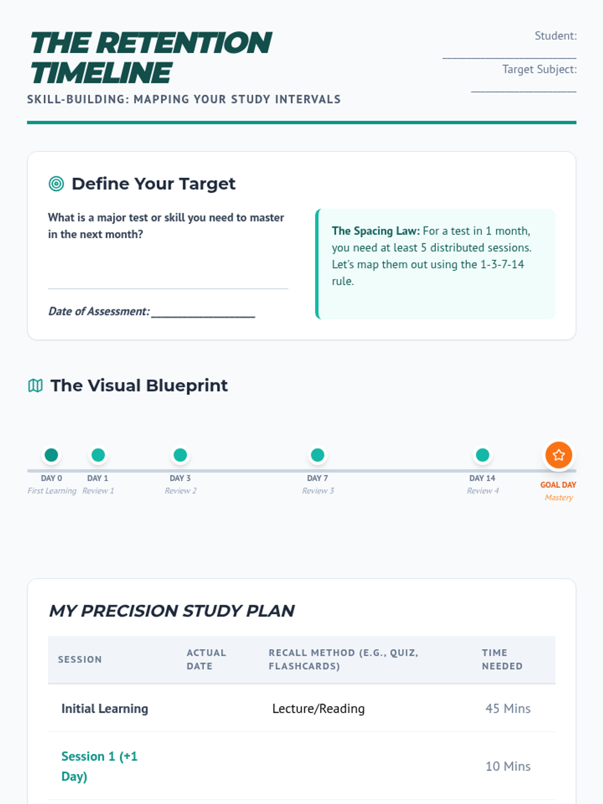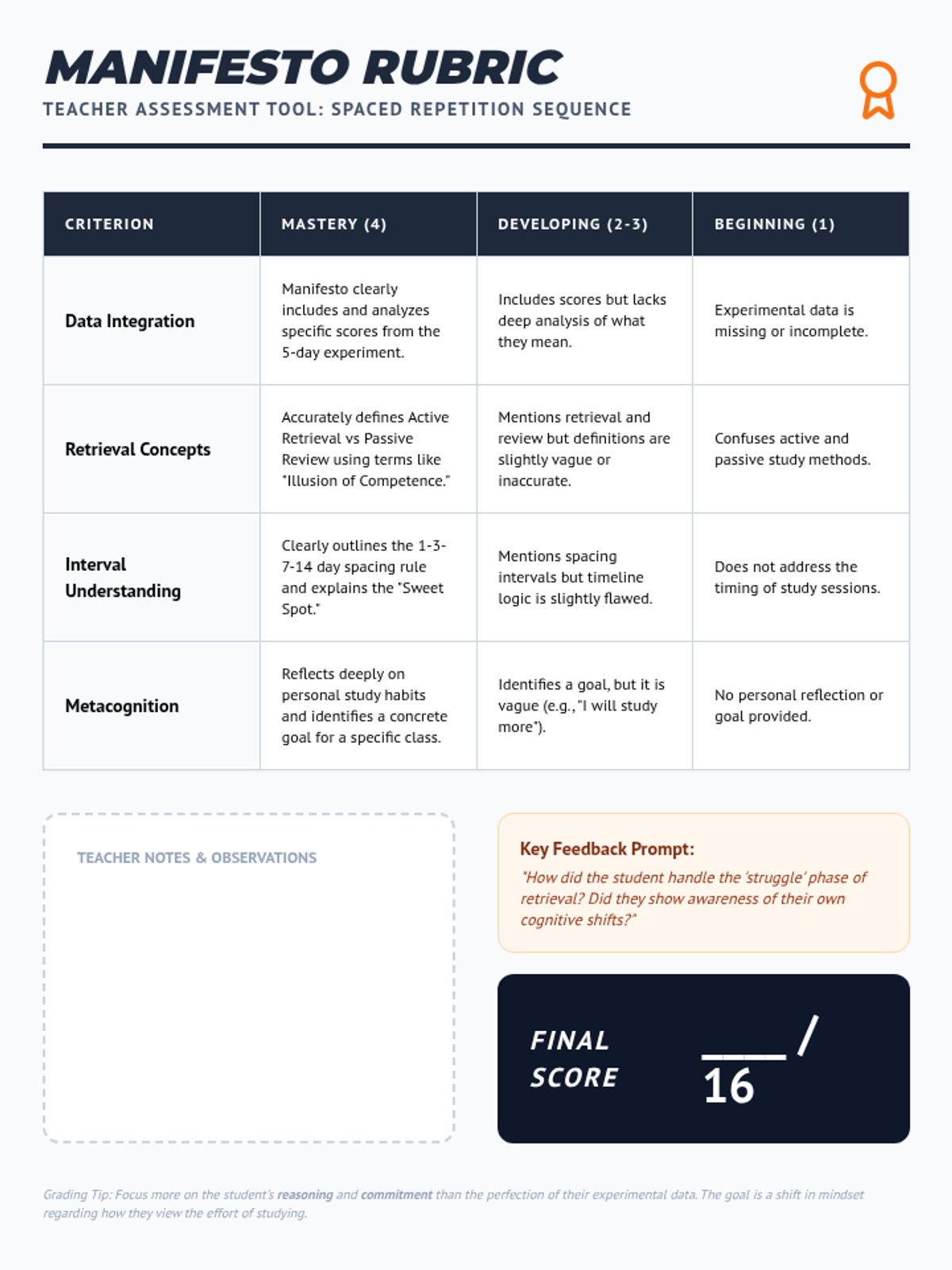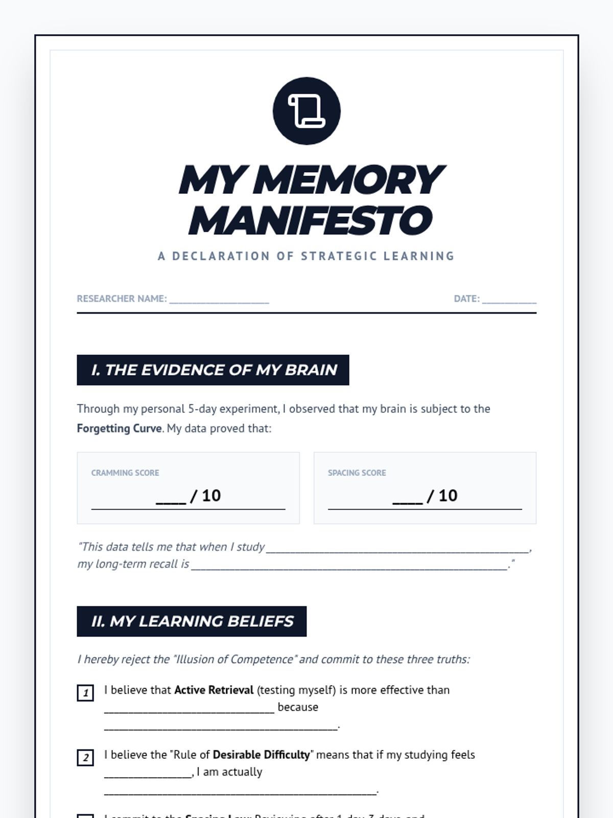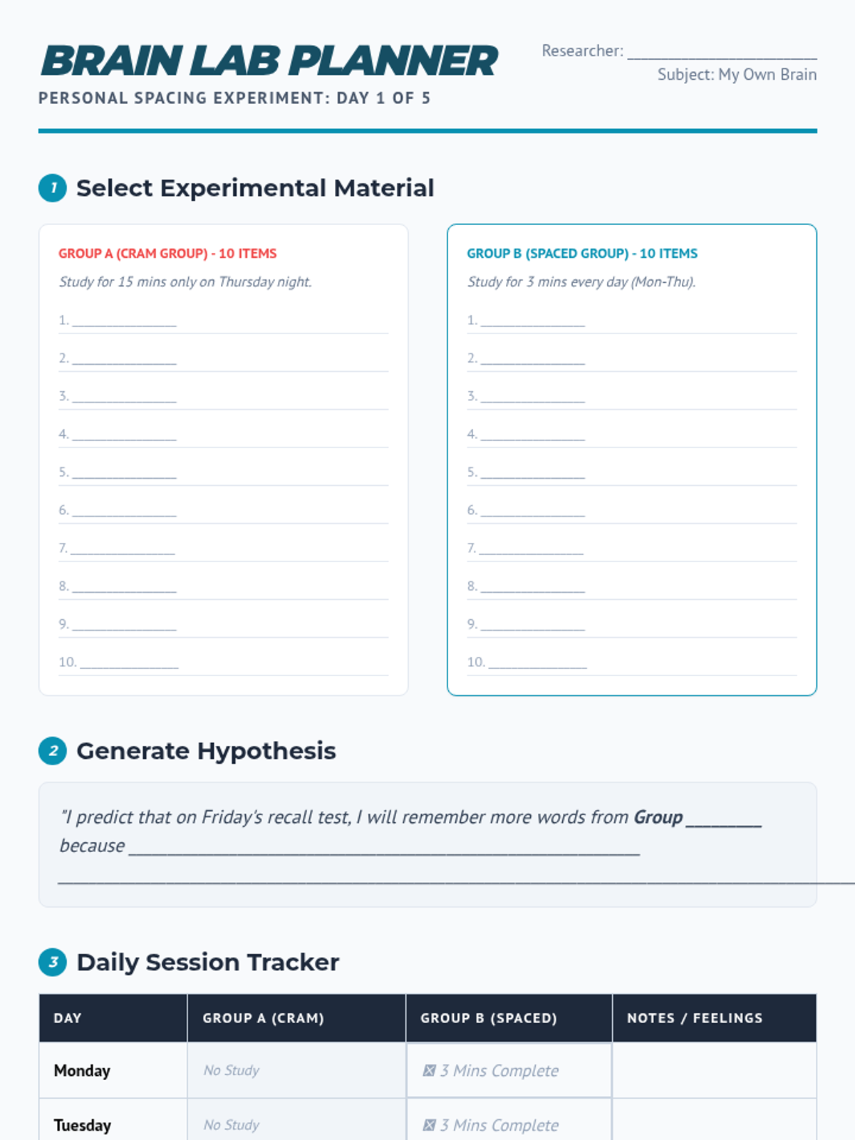 A comprehensive sequence for 10th-grade students exploring the biological and psychological foundations of memory. Students investigate the Ebbinghaus Forgetting Curve, compare passive and active study methods, and conduct a personal 5-day experiment to prove the efficacy of spaced repetition over cramming.