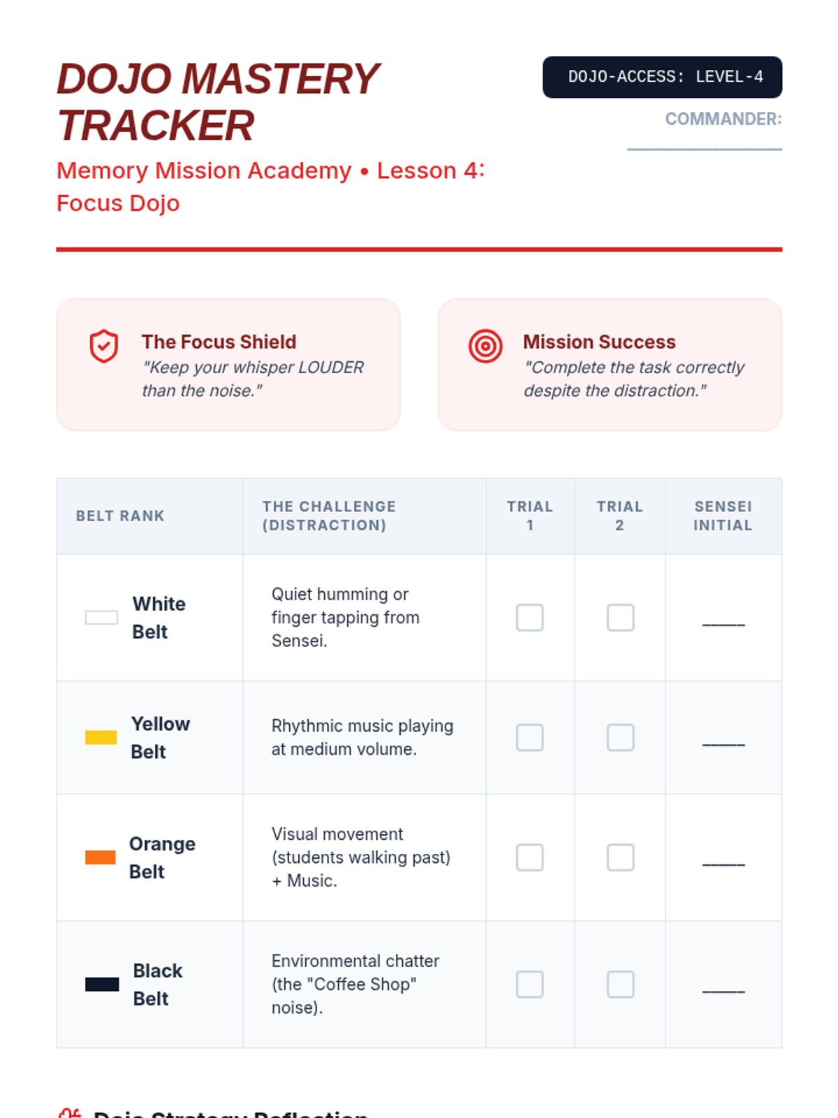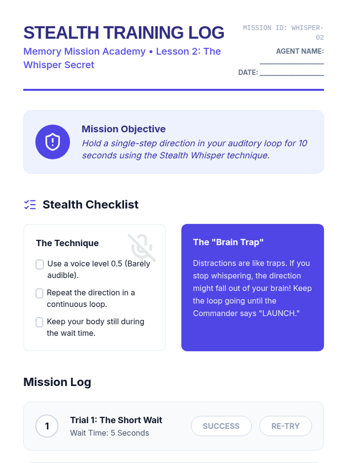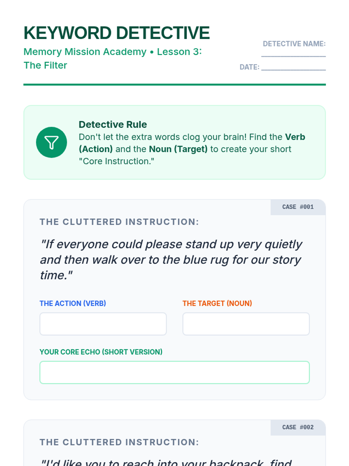A specialized sequence for 5th-grade students to develop working memory strategies, specifically focusing on following single-step directions through verbal rehearsal, keyword identification, and distraction management.