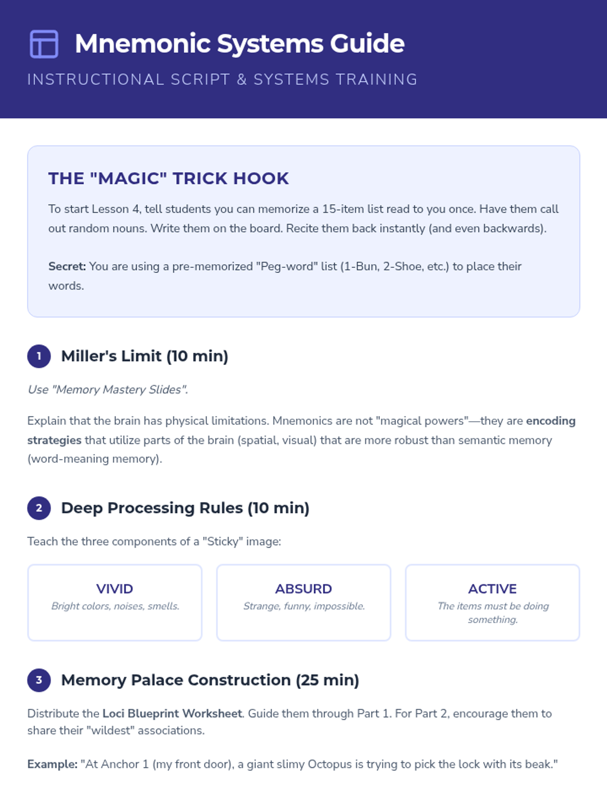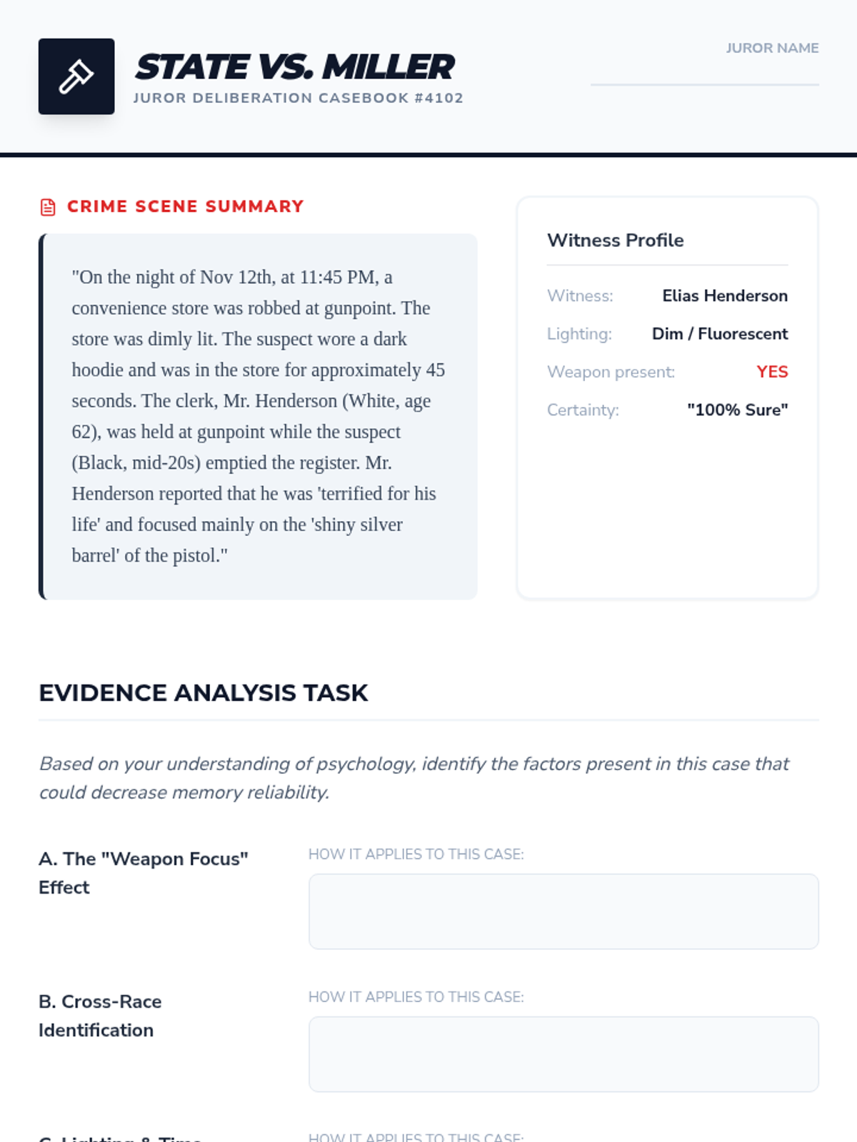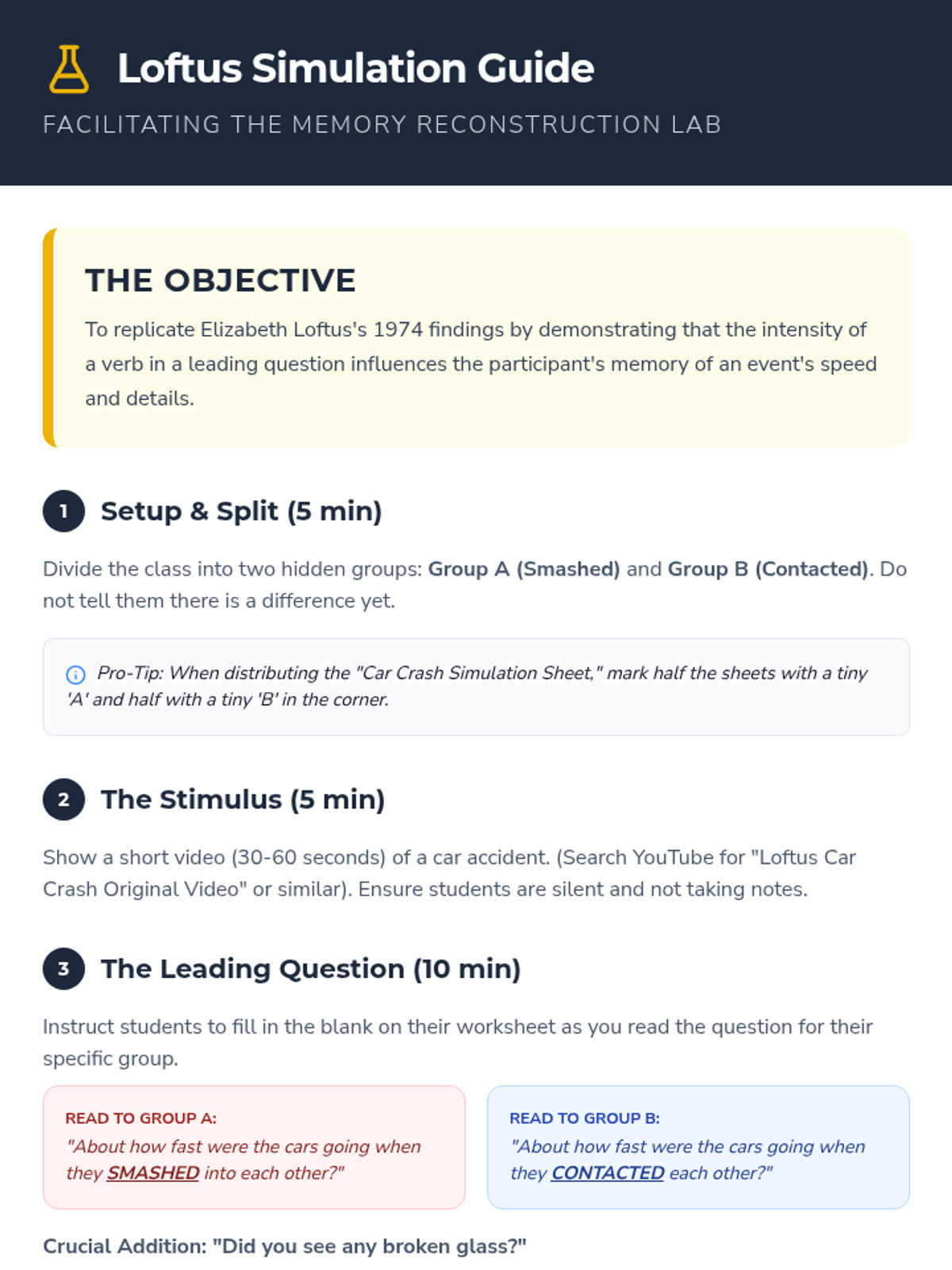 This high school psychology sequence explores why our memories fail and how we can use cognitive principles to improve learning. Students investigate theories of forgetting, the reconstructive nature of memory, the reliability of eyewitness testimony, and practical mnemonic strategies, culminating in a personalized memory optimization plan.