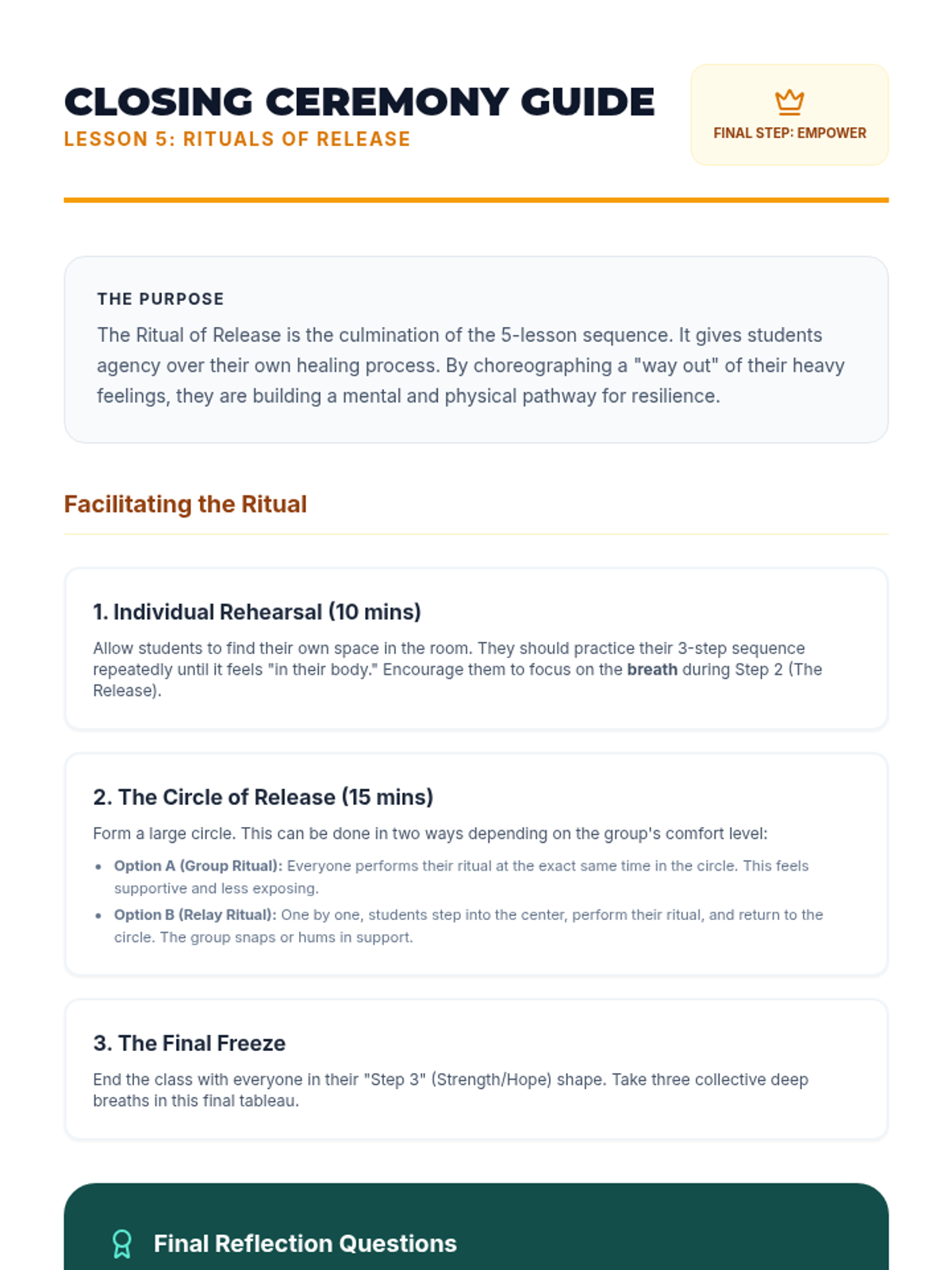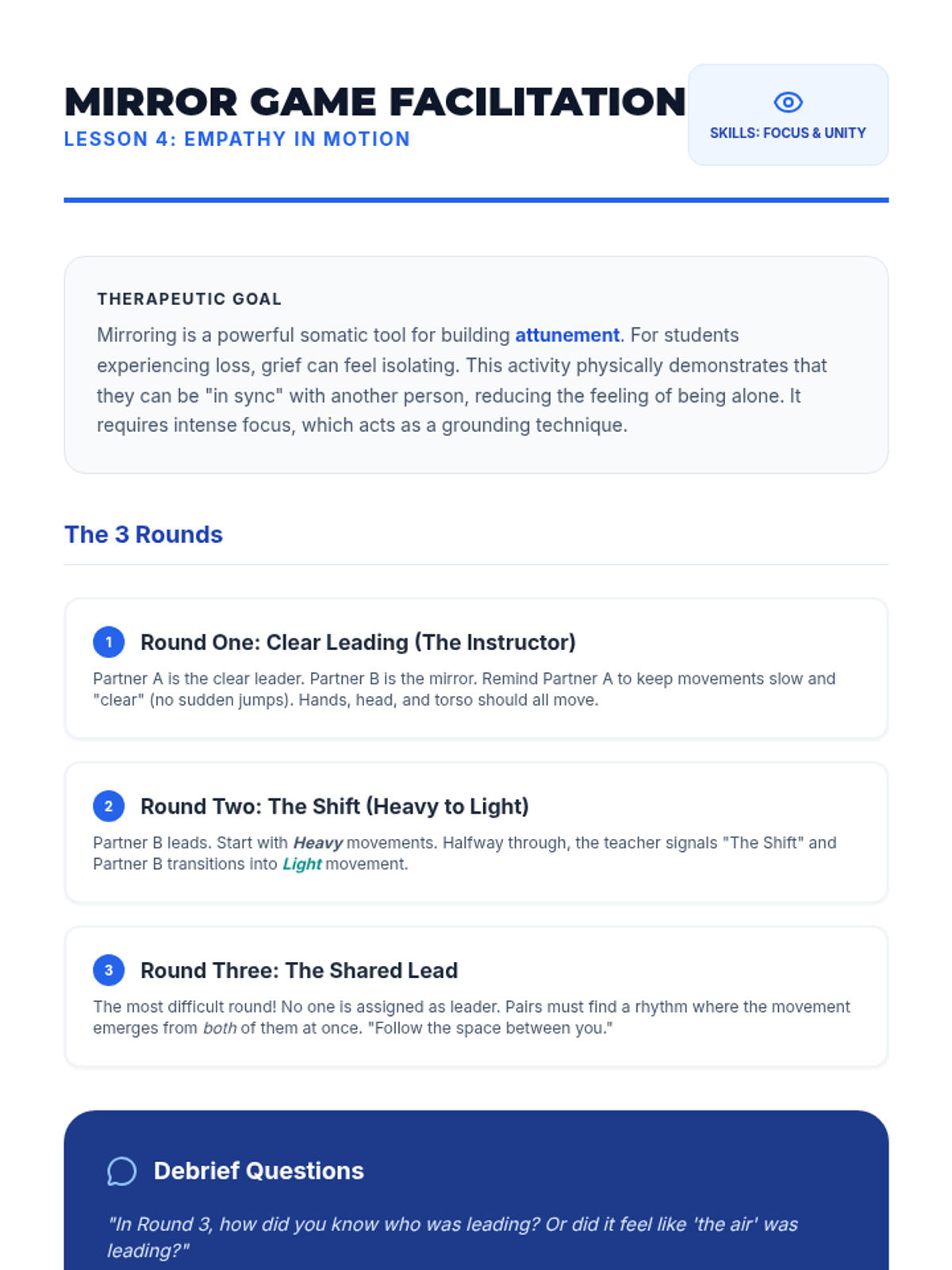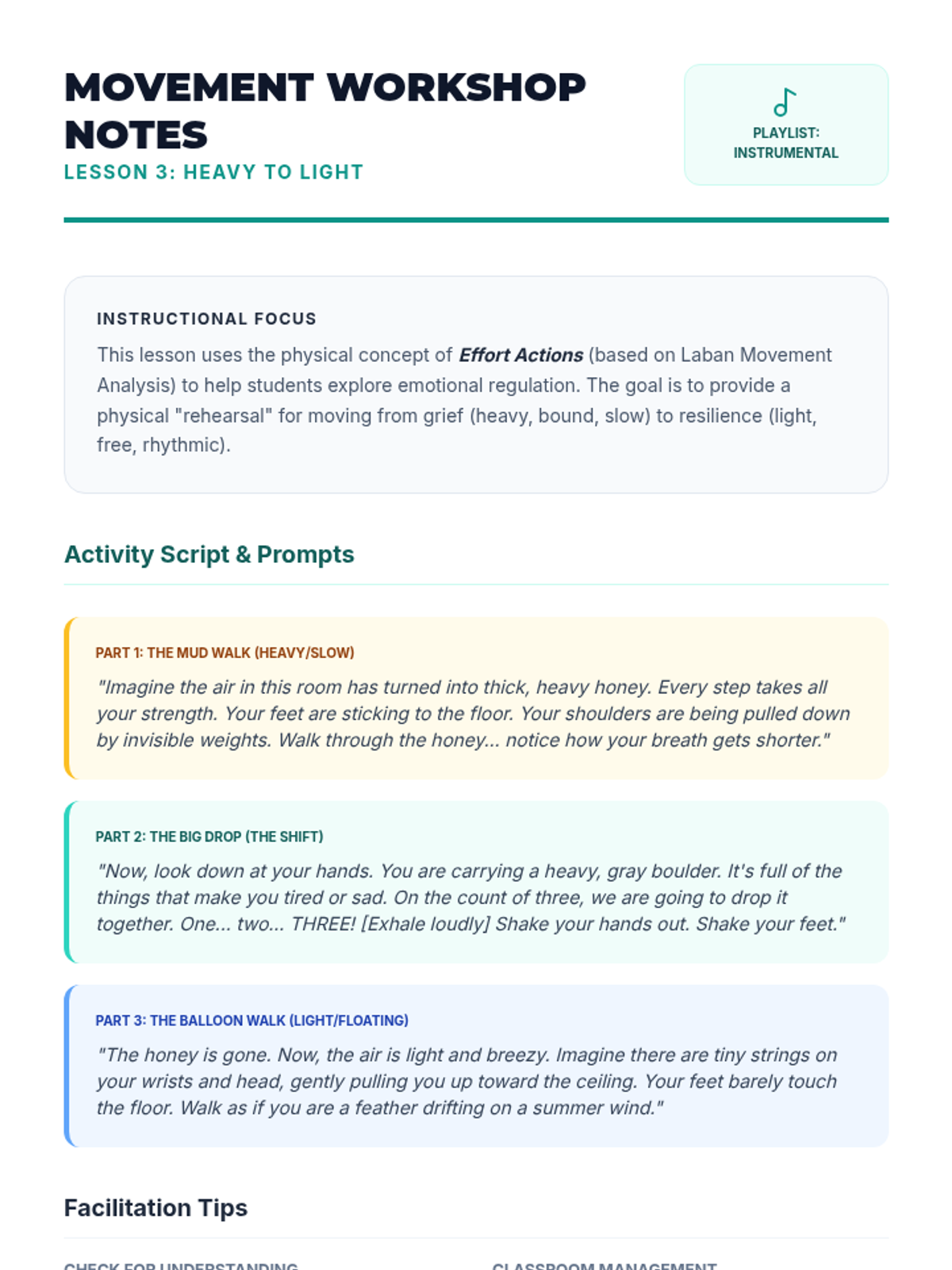This 5-lesson sequence uses somatic practices and drama techniques to help 5th-grade students process grief and loss through body movement. It focuses on identifying physical tension, externalizing emotions through tableau, exploring movement metaphors, building empathy via mirroring, and creating personal rituals of release.