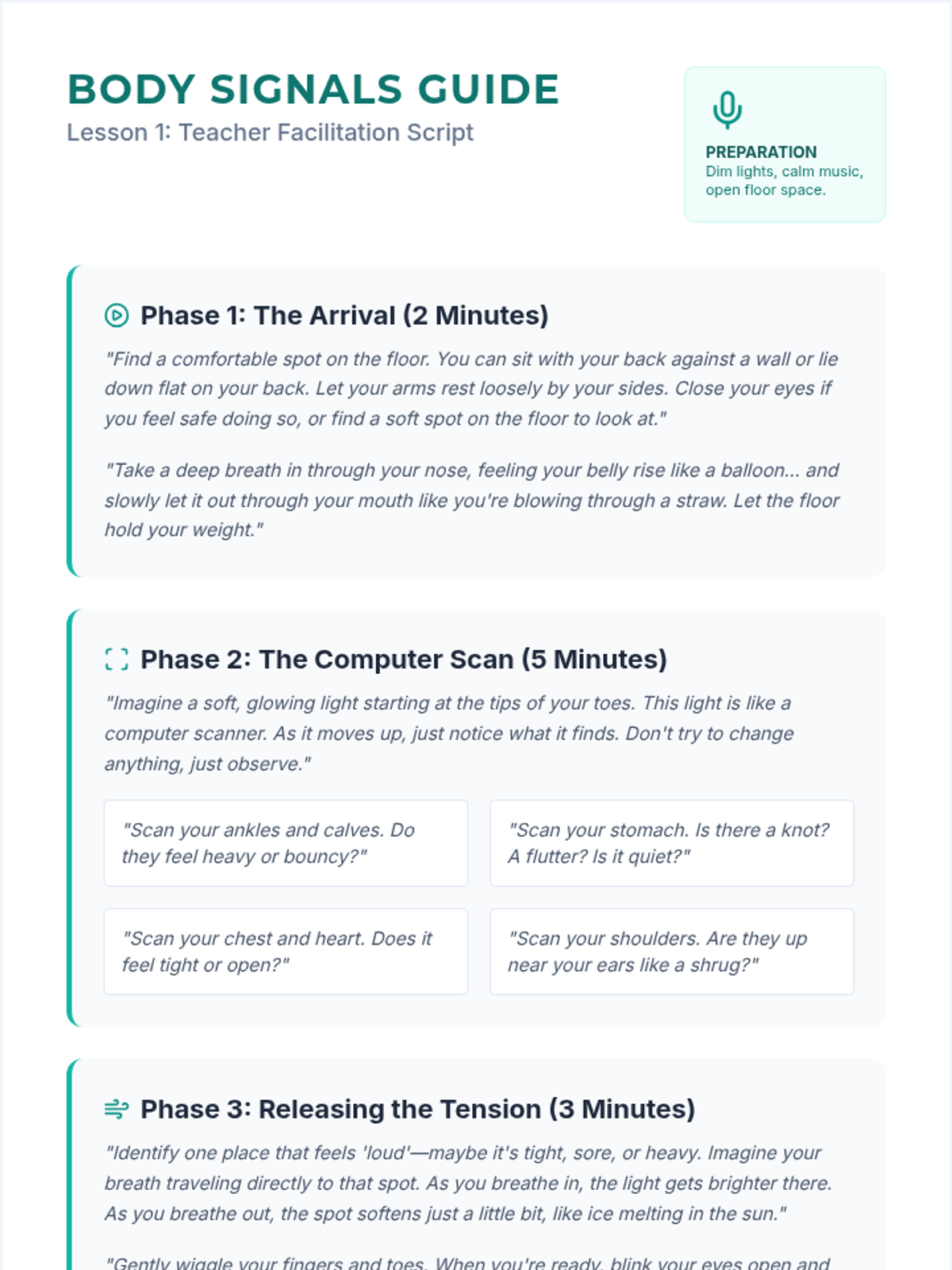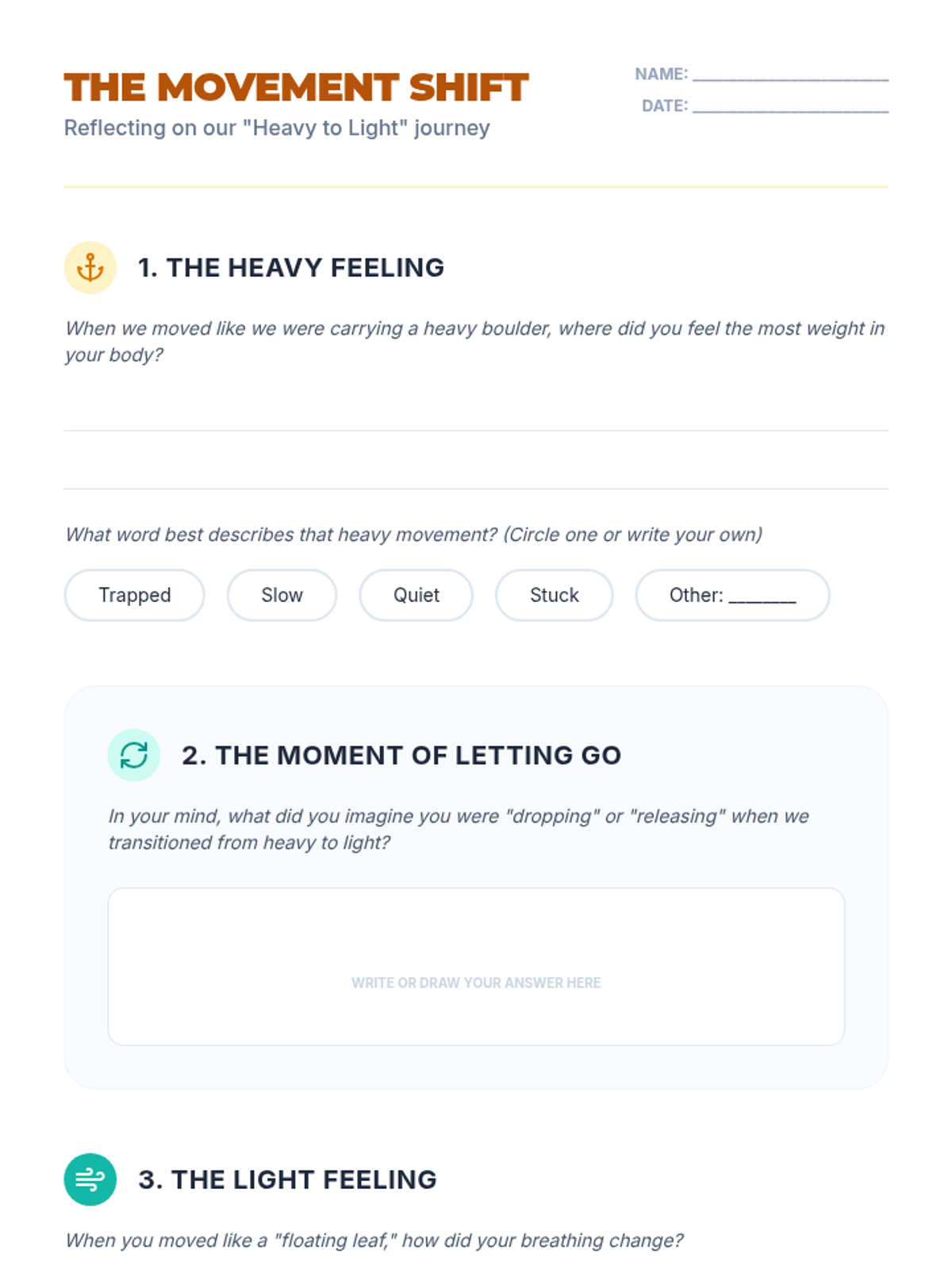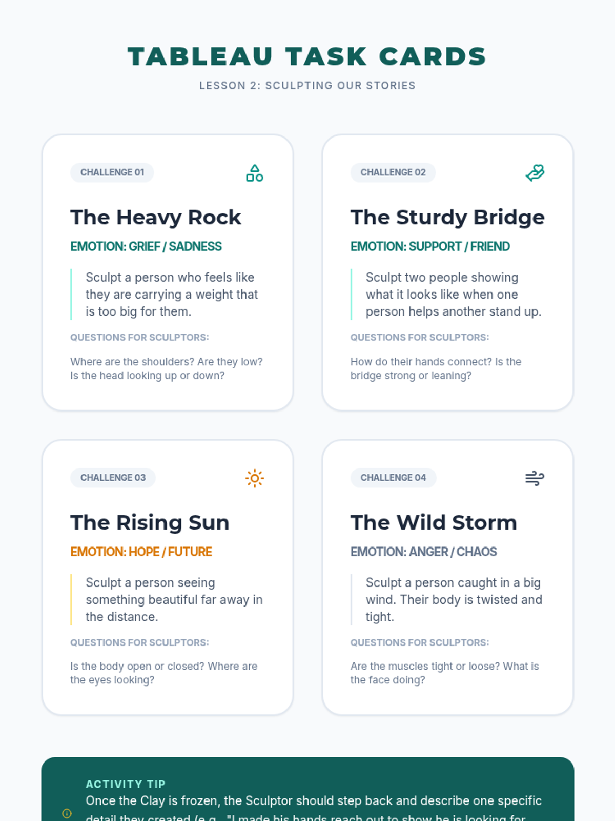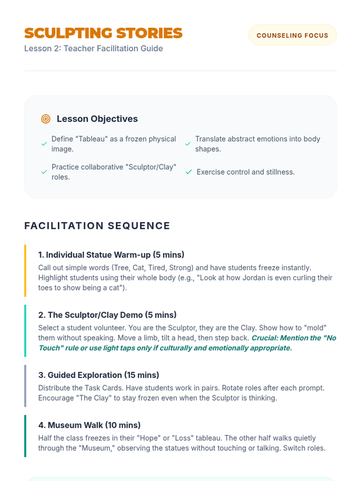 This 5-lesson sequence uses somatic practices and drama techniques to help 5th-grade students process grief and loss through body movement. It focuses on identifying physical tension, externalizing emotions through tableau, exploring movement metaphors, building empathy via mirroring, and creating personal rituals of release.