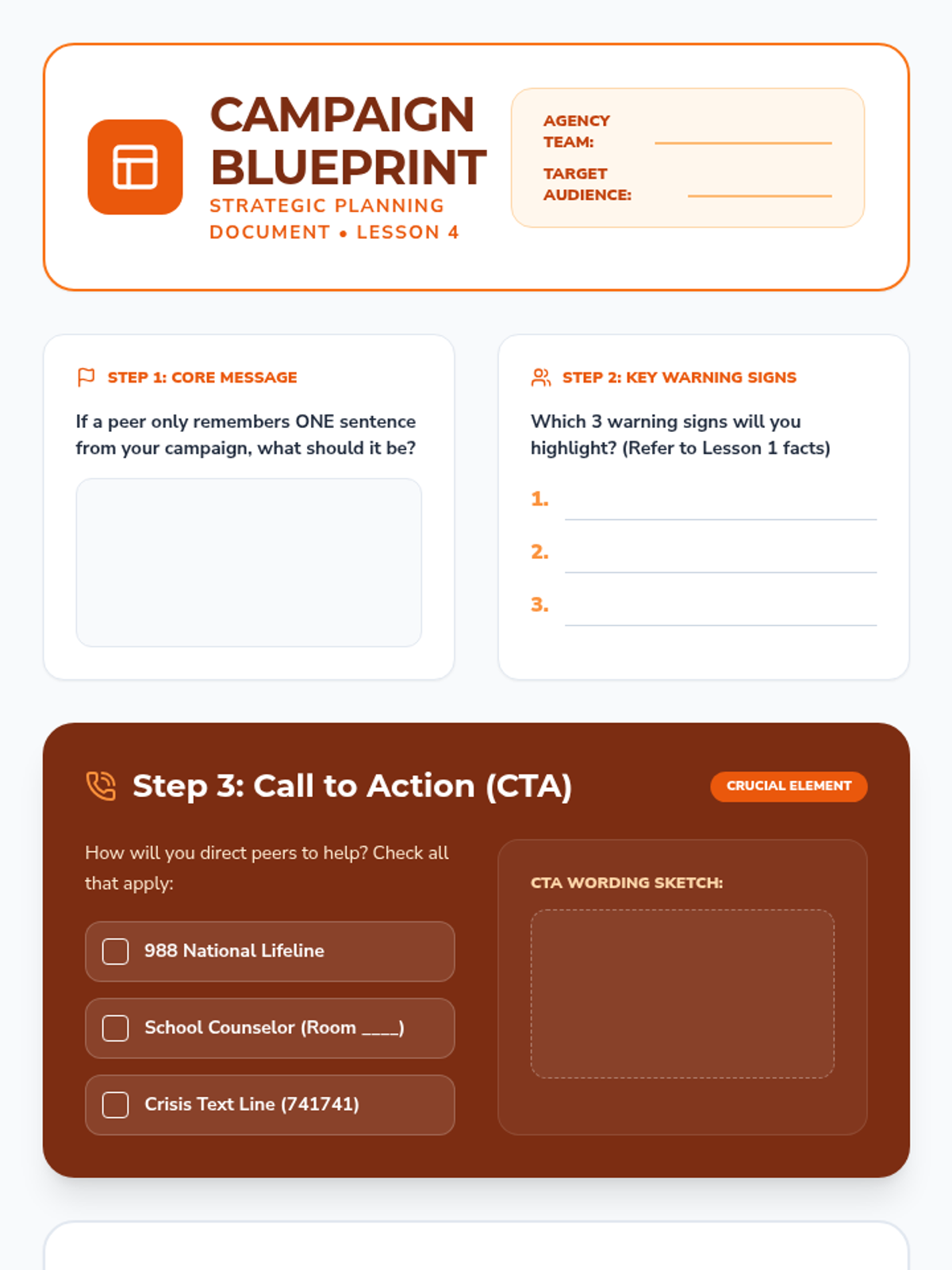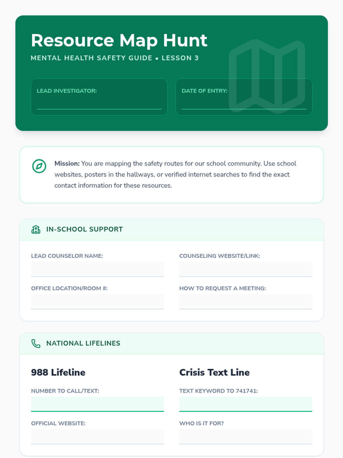 This sequence explores the social and emotional complexities of seeking help via crisis hotlines. Students analyze common barriers like stigma and fear, debunk myths about emergency services, and practice supportive communication to help peers access professional resources.