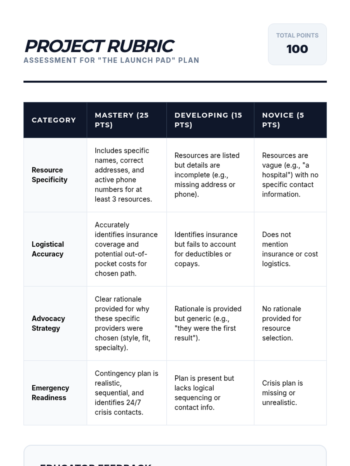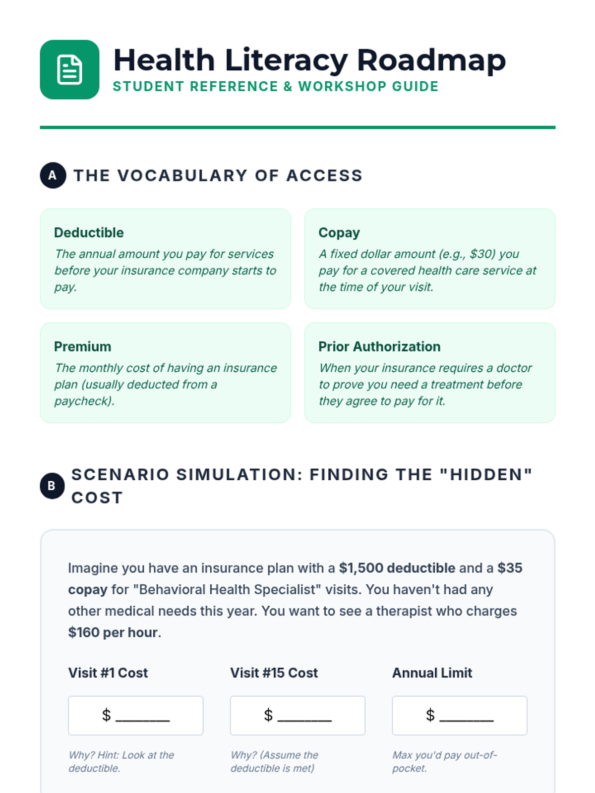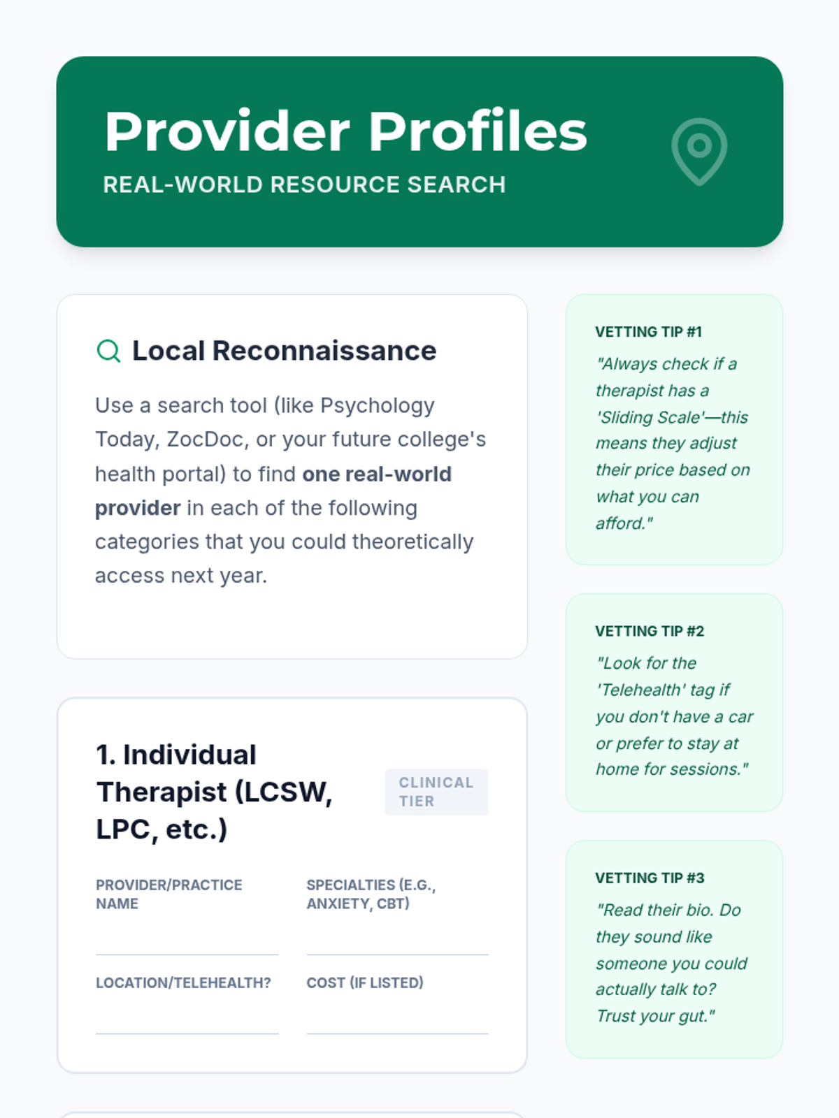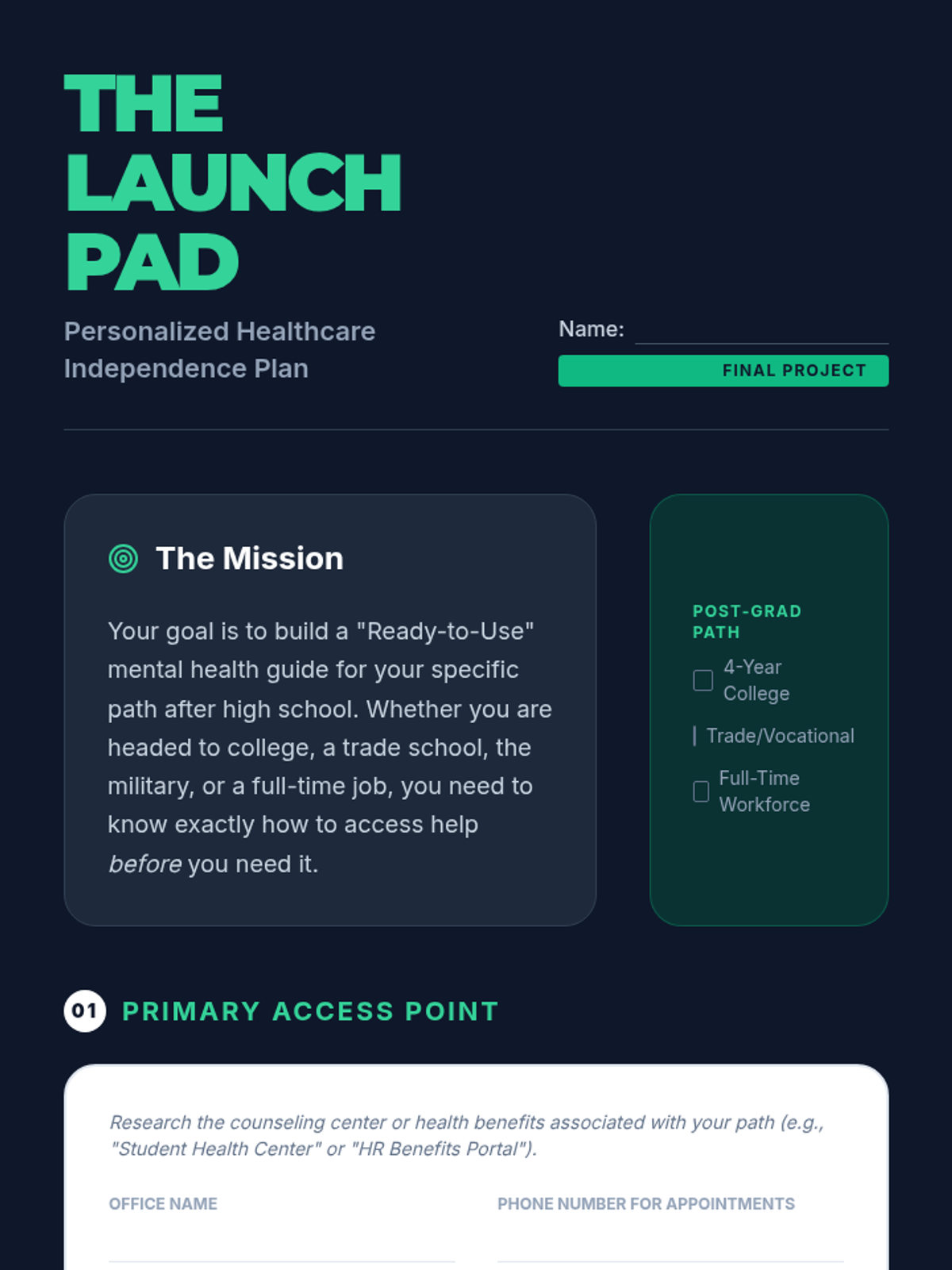 This sequence prepares seniors for the transition to independent living by demystifying the process of accessing mental healthcare without parental intervention. Students analyze systemic and psychological barriers to help-seeking, map out community and digital resources, and develop practical health literacy skills including insurance navigation and professional communication.