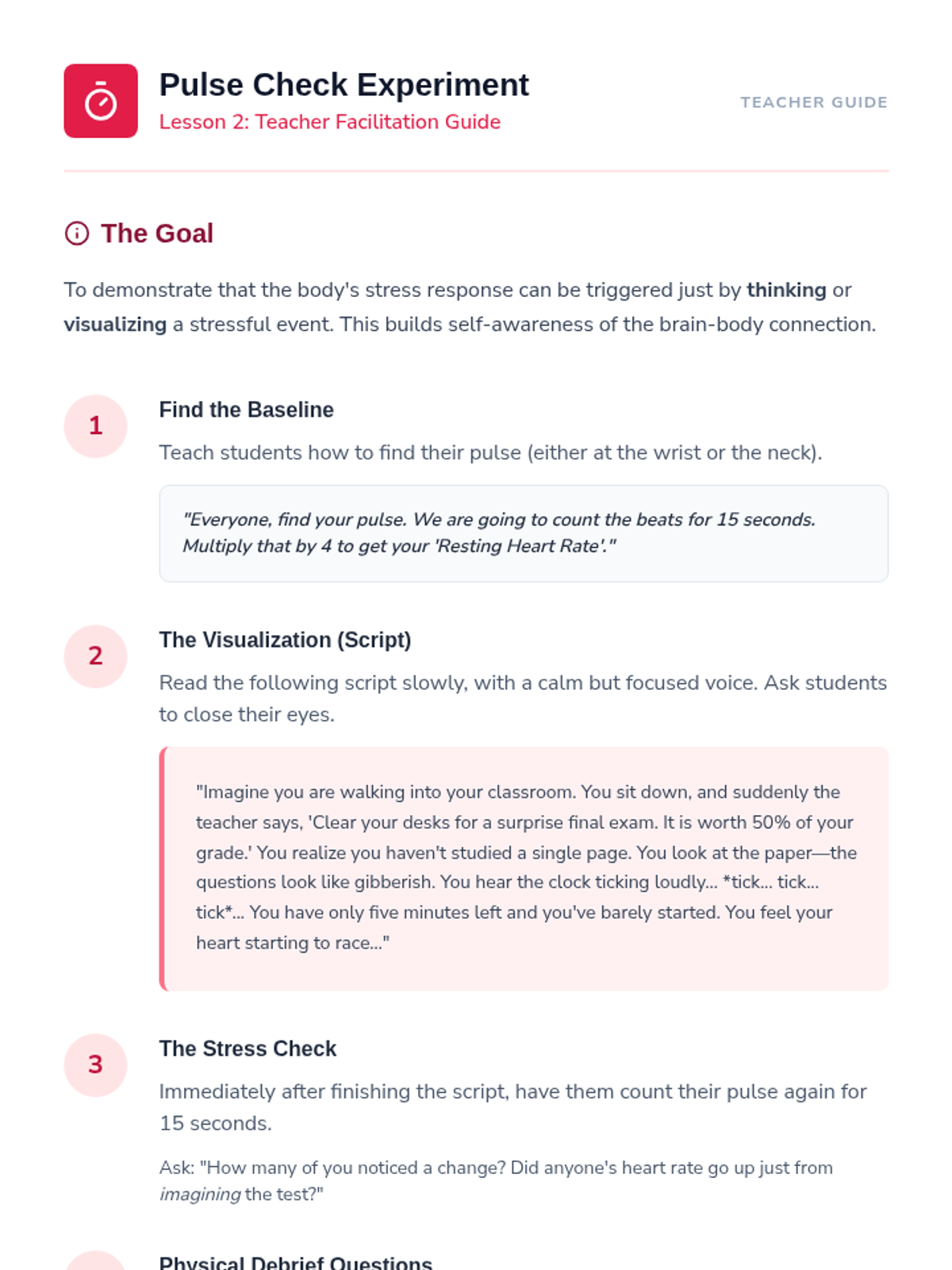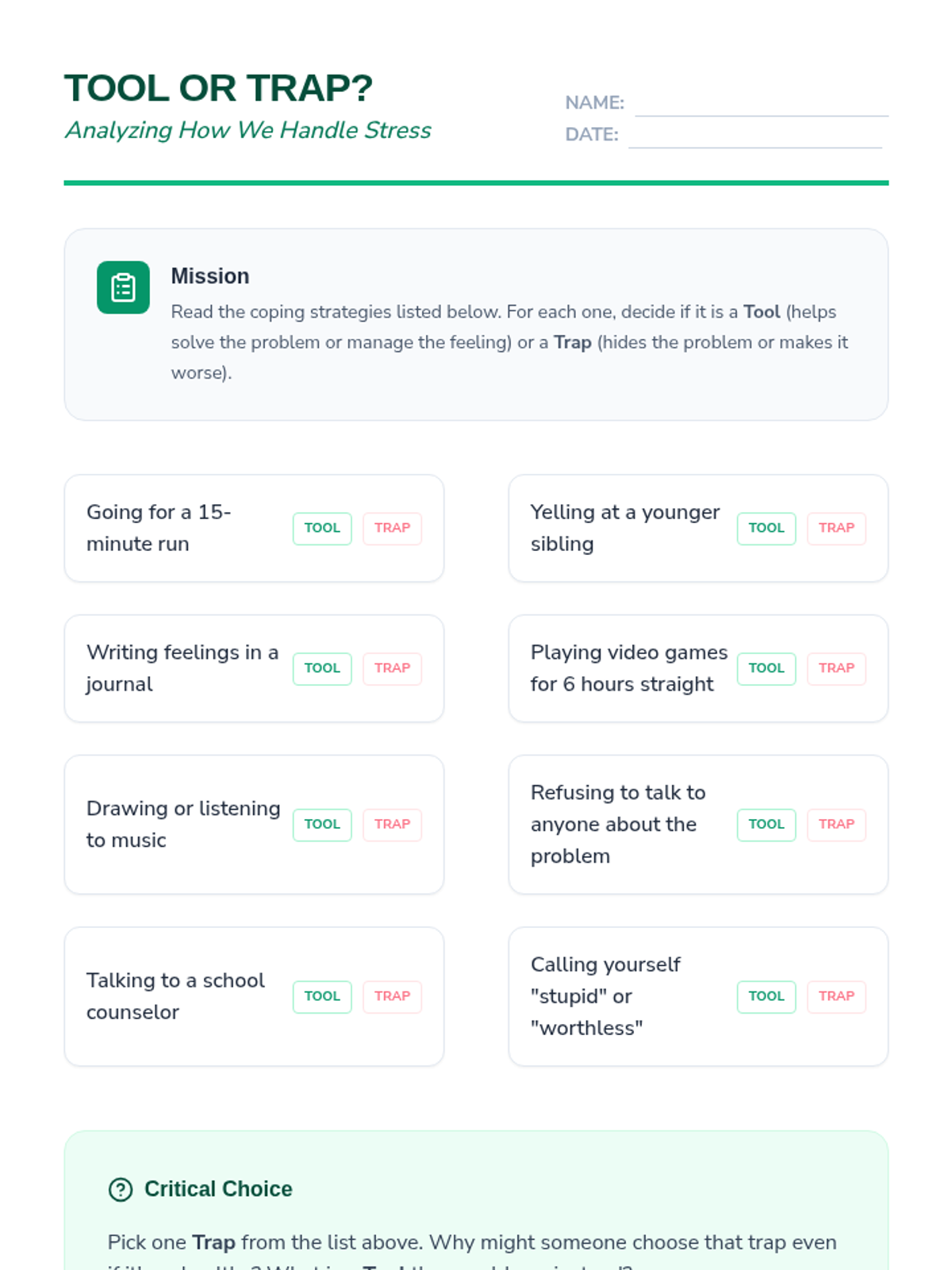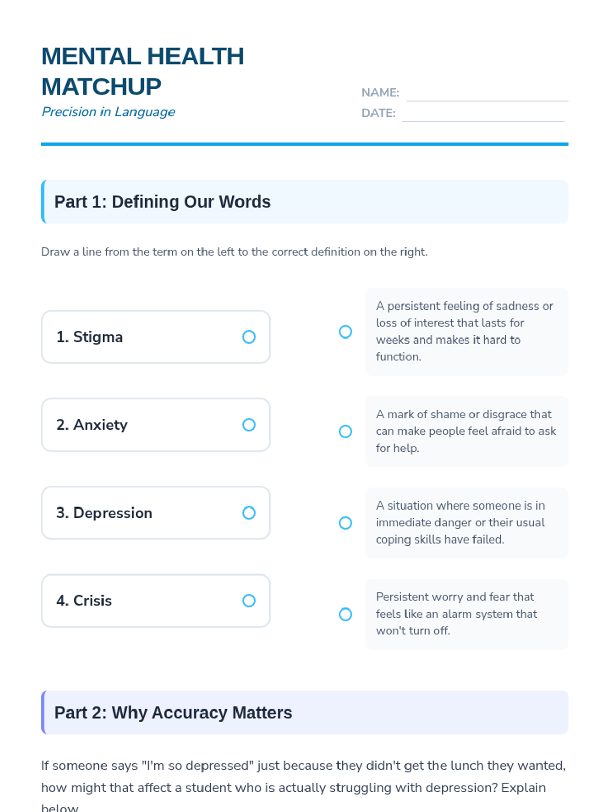 This sequence introduces 6th-grade students to mental health literacy, focusing on distinguishing between normal emotional fluctuations and signs of distress. Students build emotional vocabulary, understand the physical signs of stress, and learn to evaluate the intensity and duration of their feelings.
