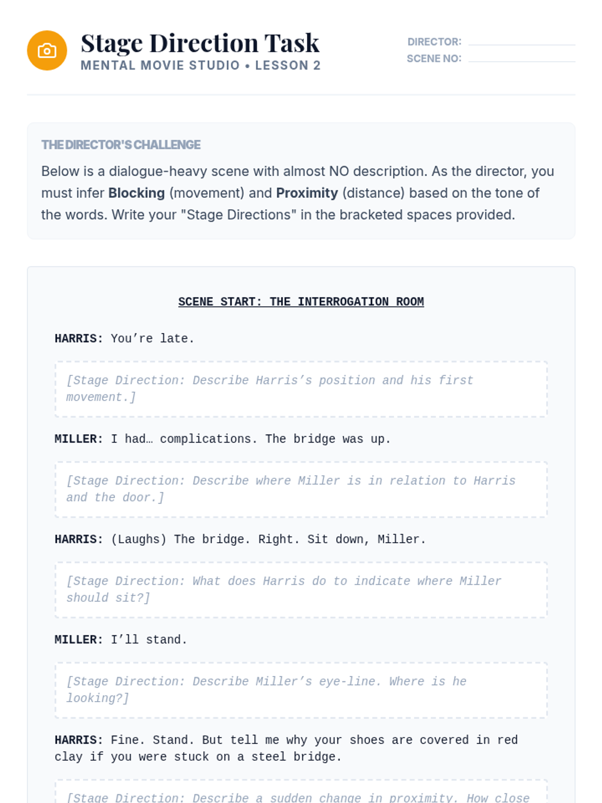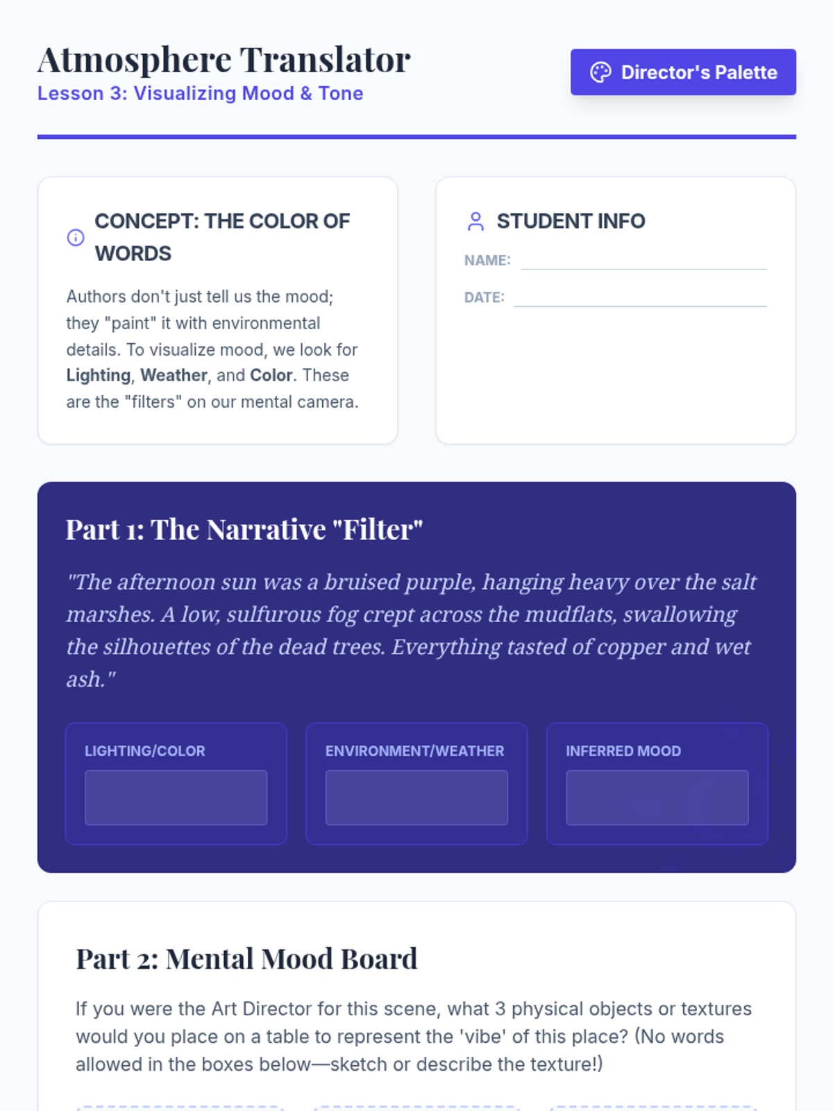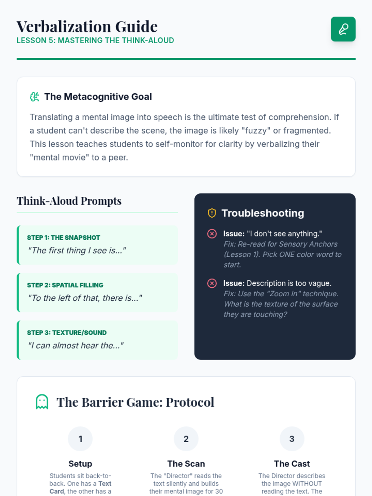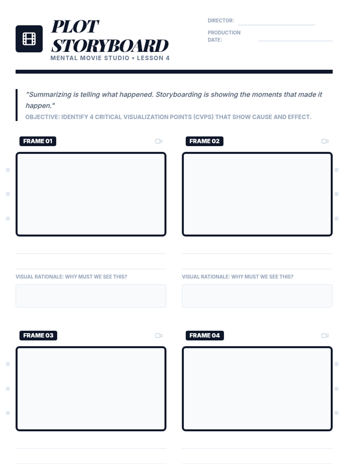 A specialized literacy sequence for 12th-grade students focused on using visualization strategies to decode and analyze complex narrative texts. Students adopt the persona of film directors to translate descriptive language into vivid mental imagery, enhancing comprehension, memory retention, and inference skills.