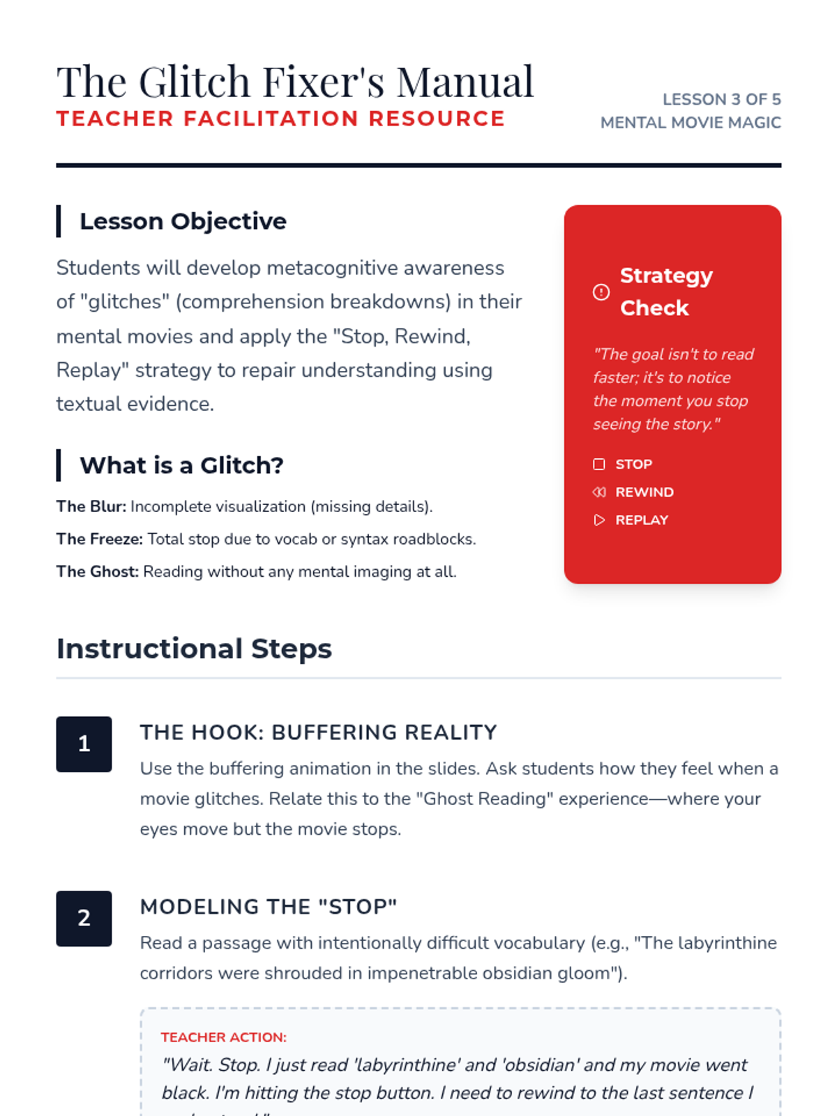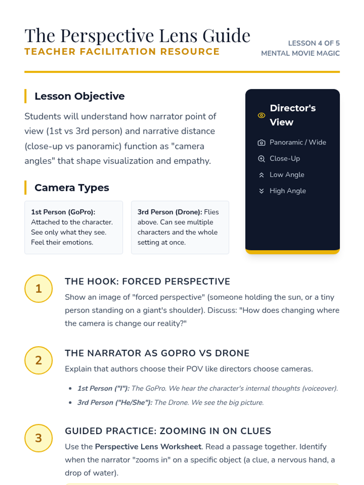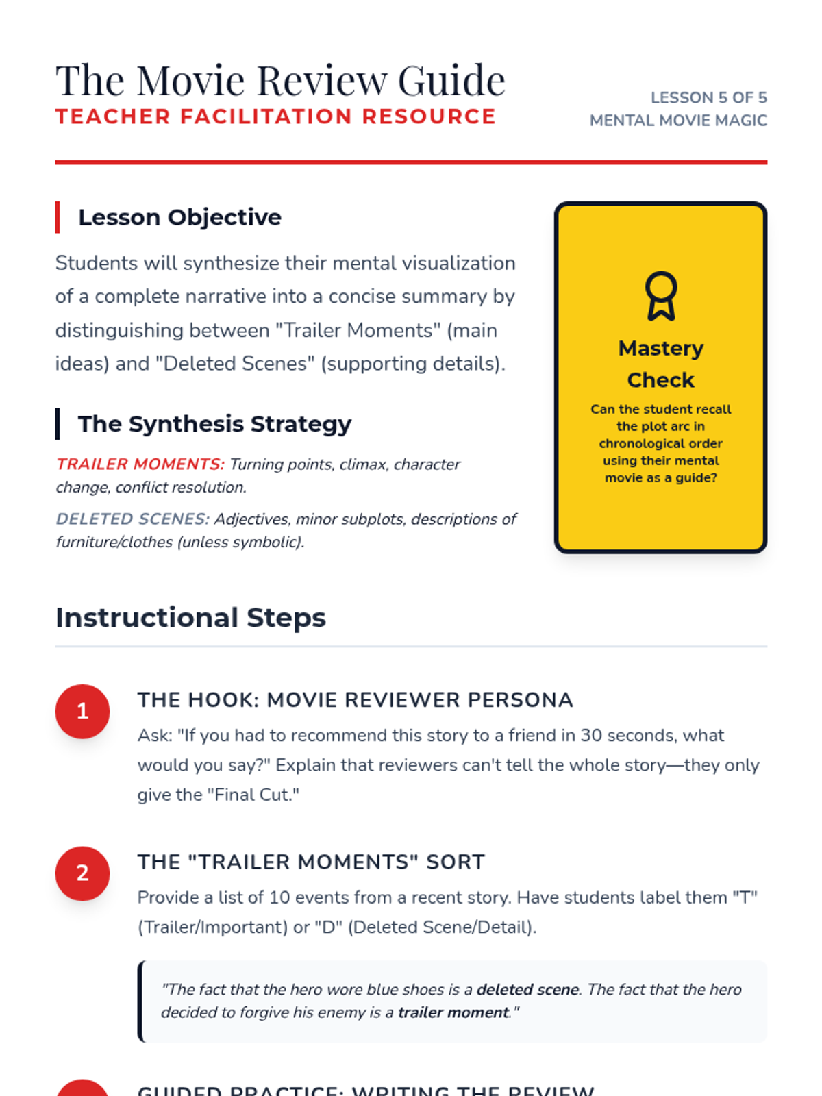 This sequence teaches 6th-grade students to use the 'Mental Movie' metaphor to improve reading comprehension and narrative recall. Students act as 'directors,' learning to visualize characters, settings, and actions while self-monitoring for 'glitches' in their understanding.