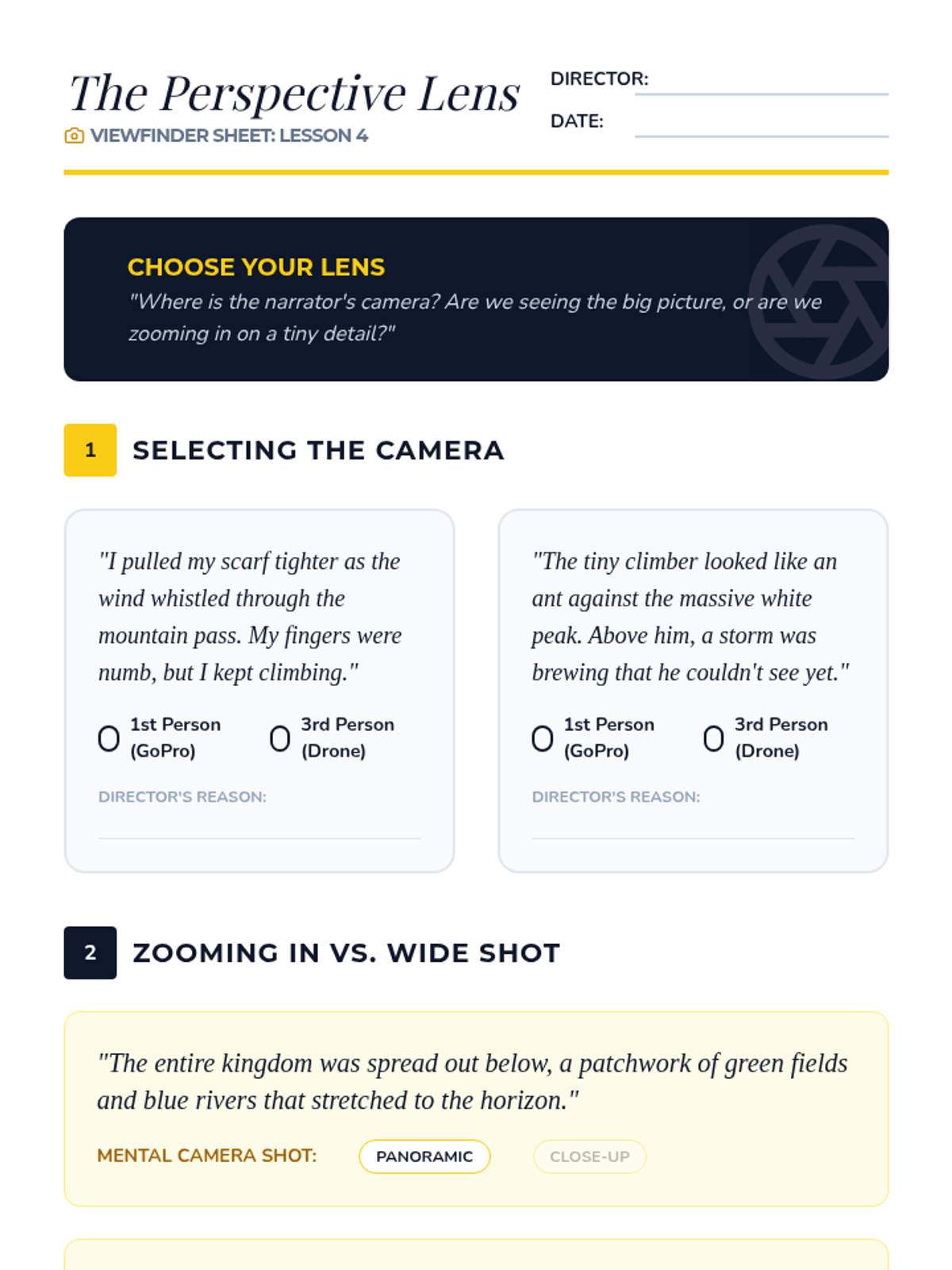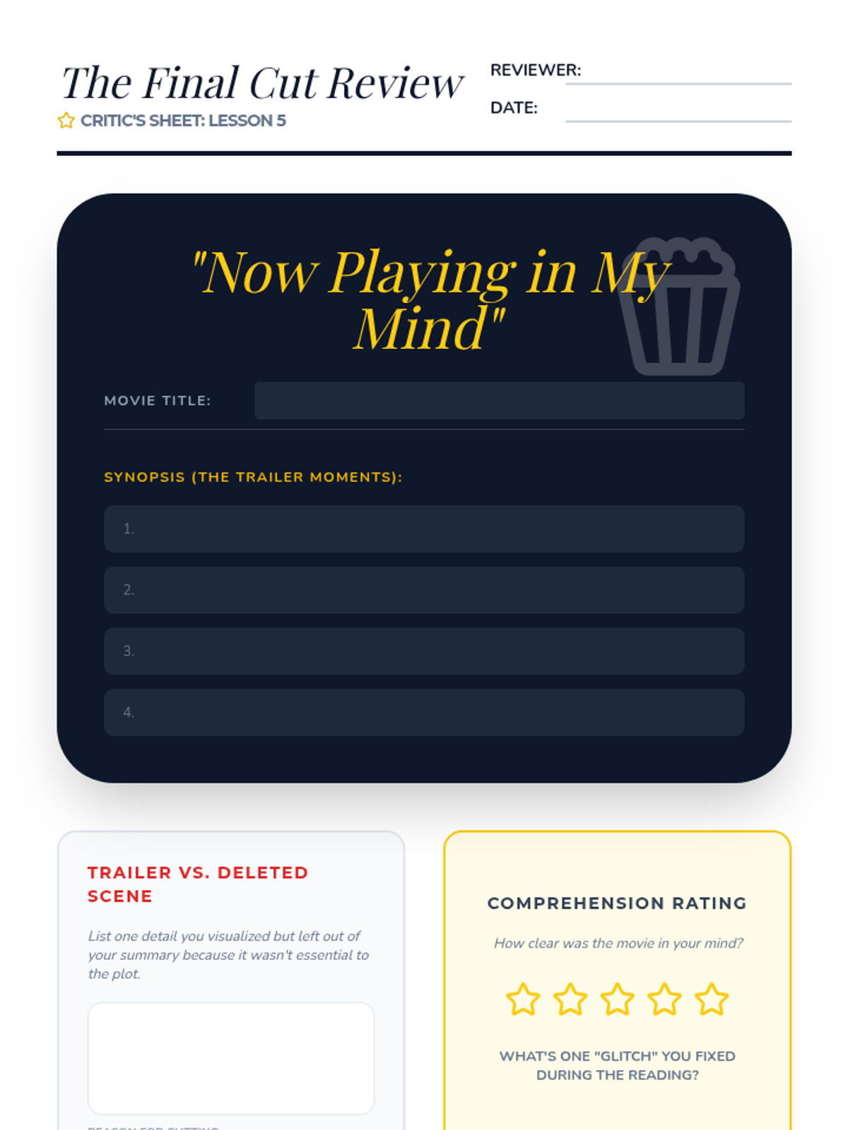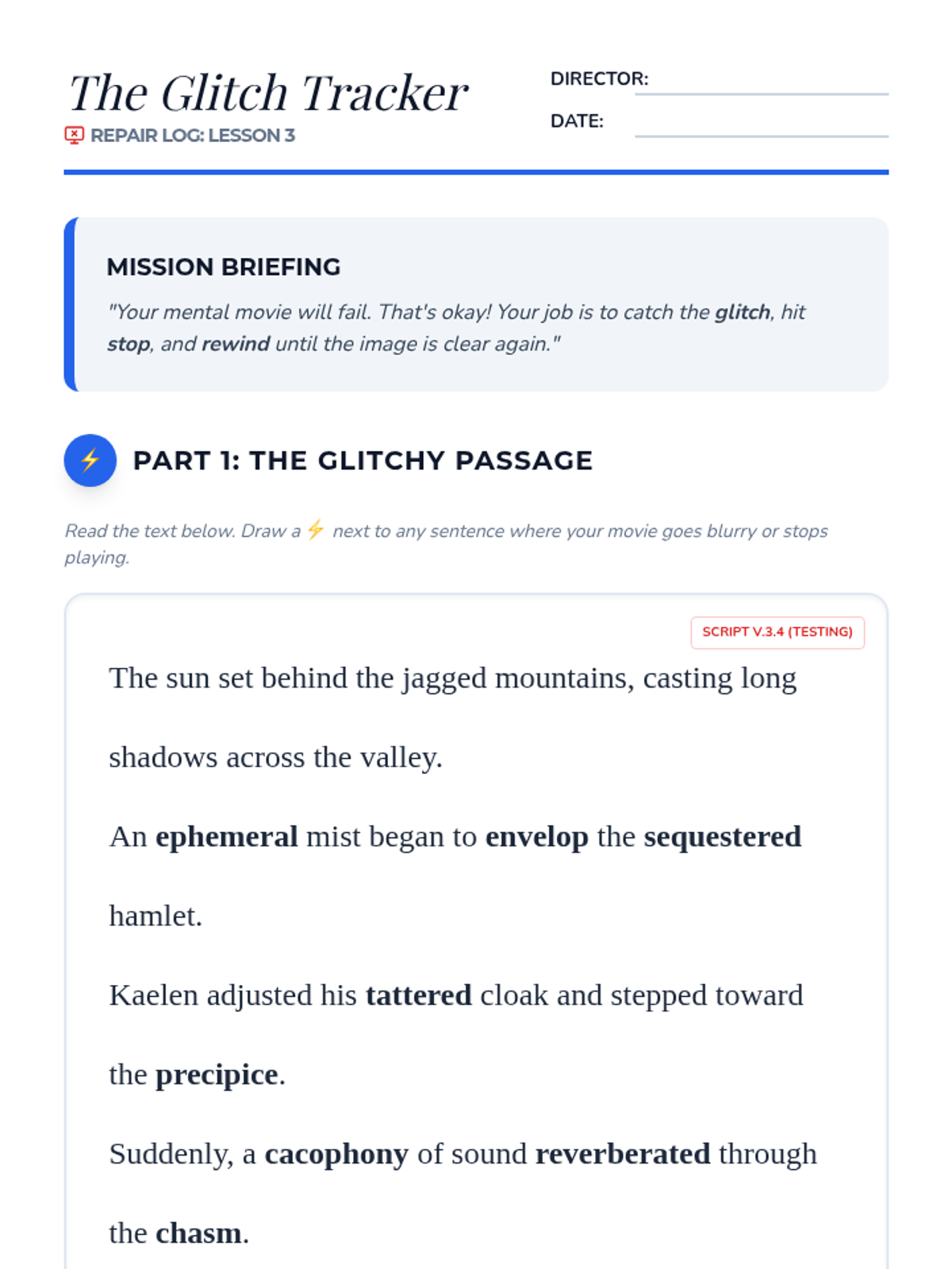 This sequence teaches 6th-grade students to use the 'Mental Movie' metaphor to improve reading comprehension and narrative recall. Students act as 'directors,' learning to visualize characters, settings, and actions while self-monitoring for 'glitches' in their understanding.