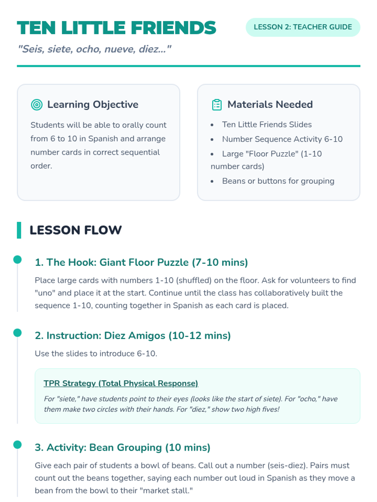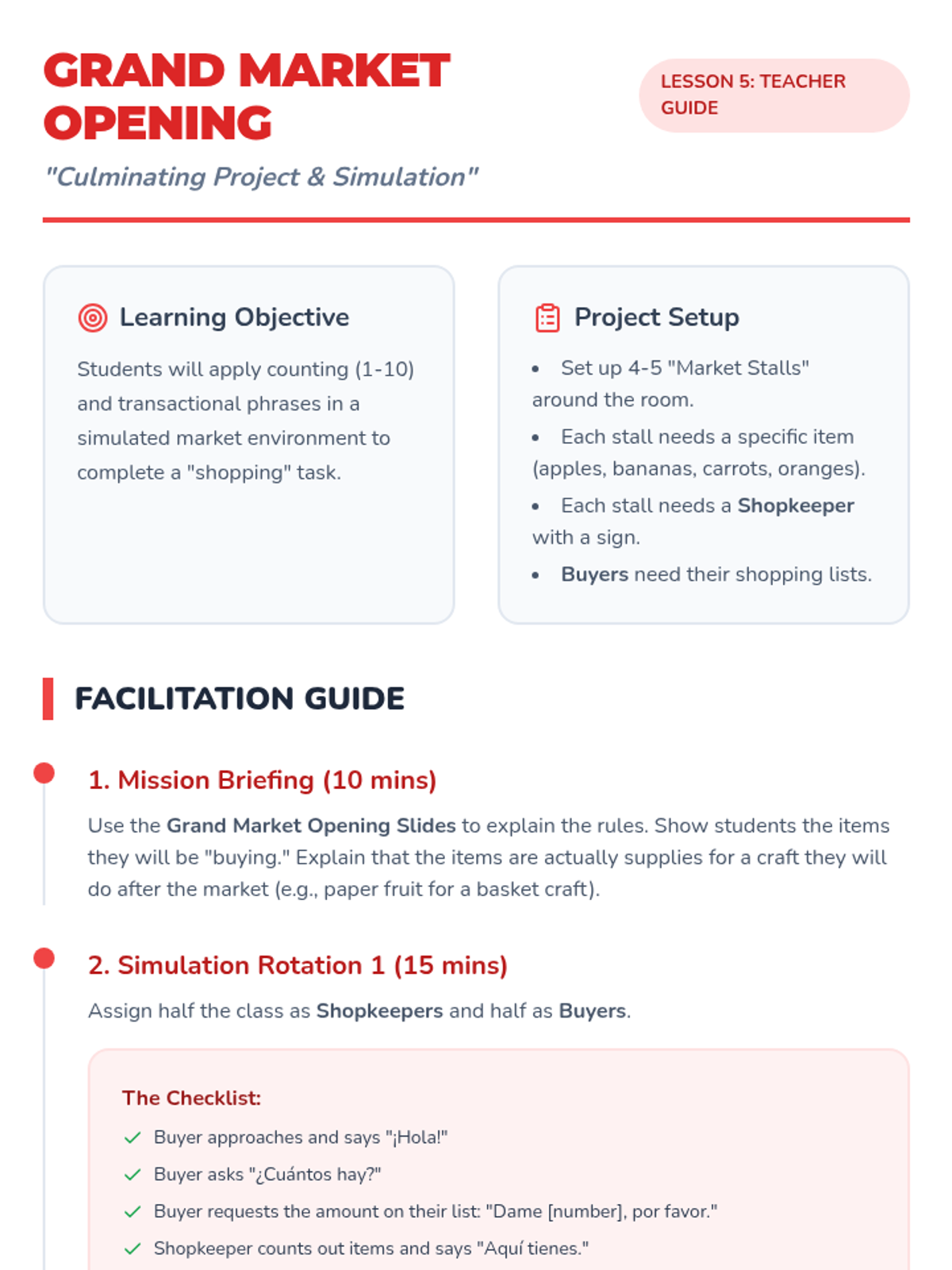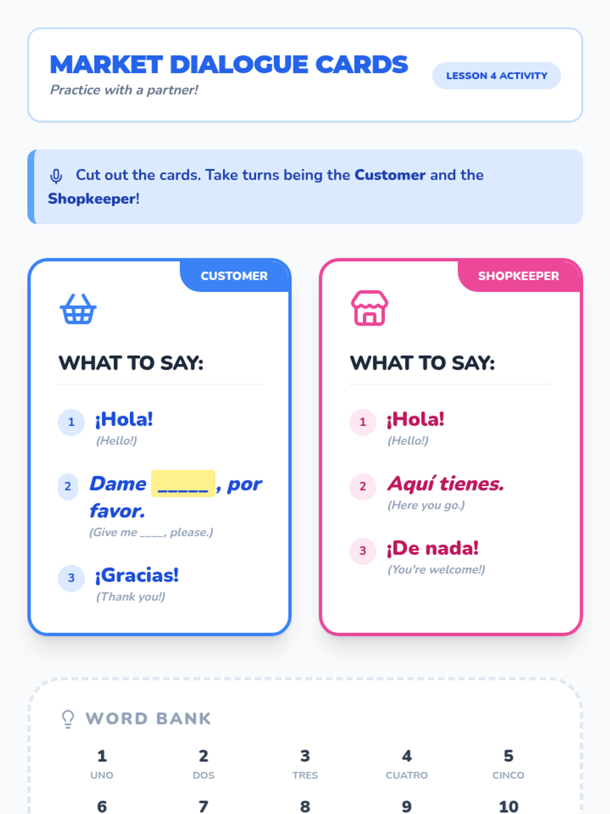 A beginner Spanish sequence for 1st graders focused on numbers 1-10 and basic transactional language. Students use a market-themed project to practice counting, asking 'how many', and requesting items politely.