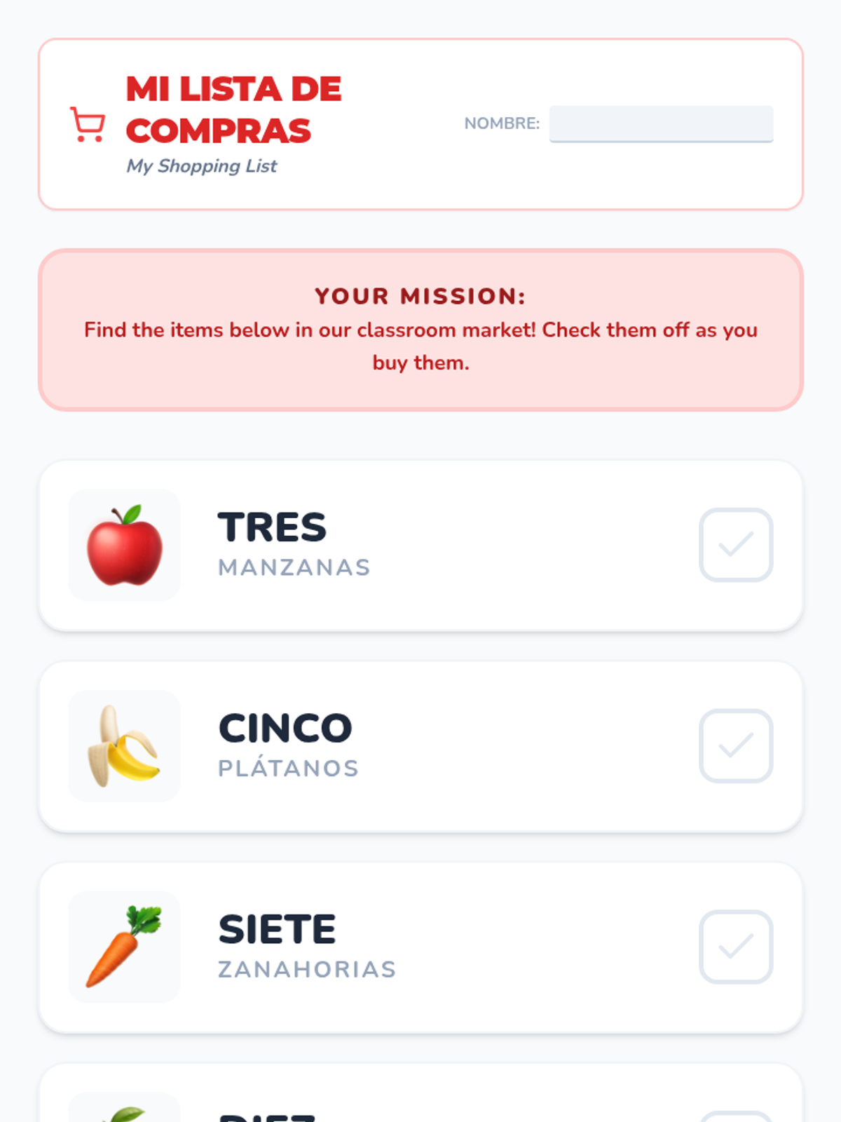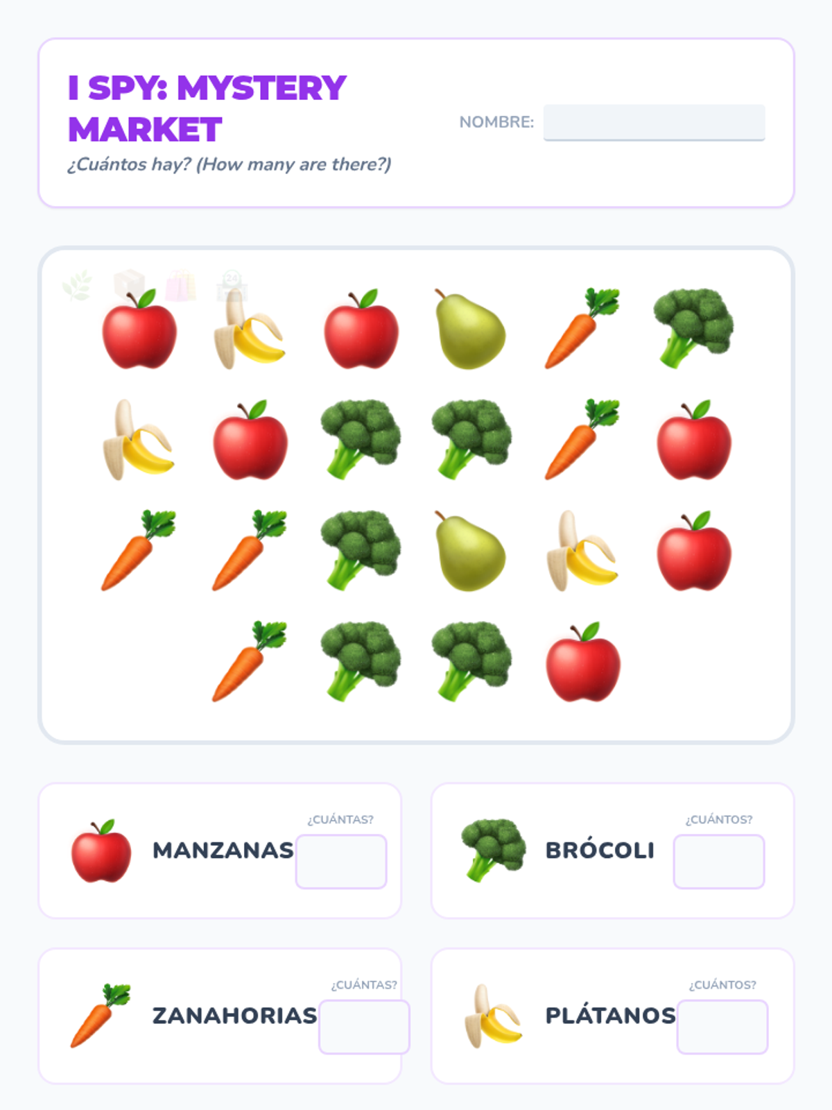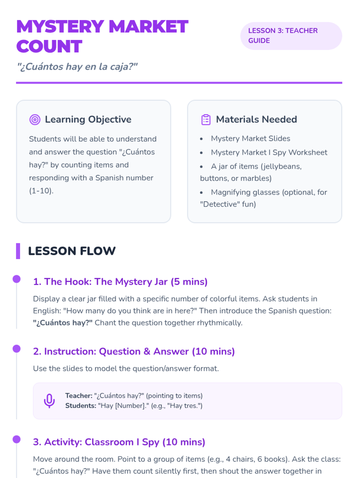 A beginner Spanish sequence for 1st graders focused on numbers 1-10 and basic transactional language. Students use a market-themed project to practice counting, asking 'how many', and requesting items politely.