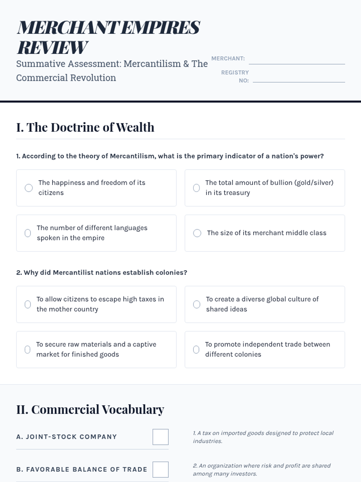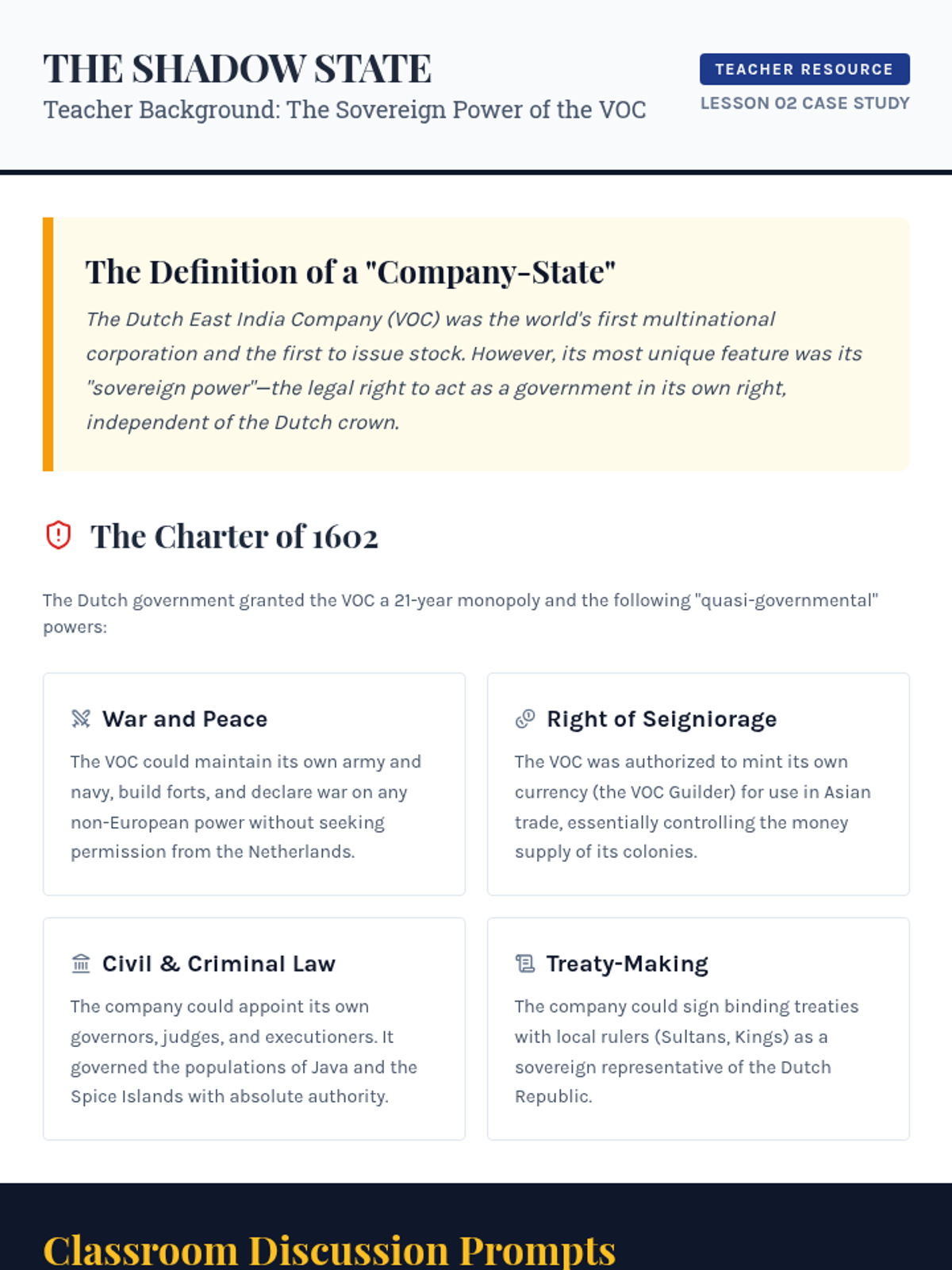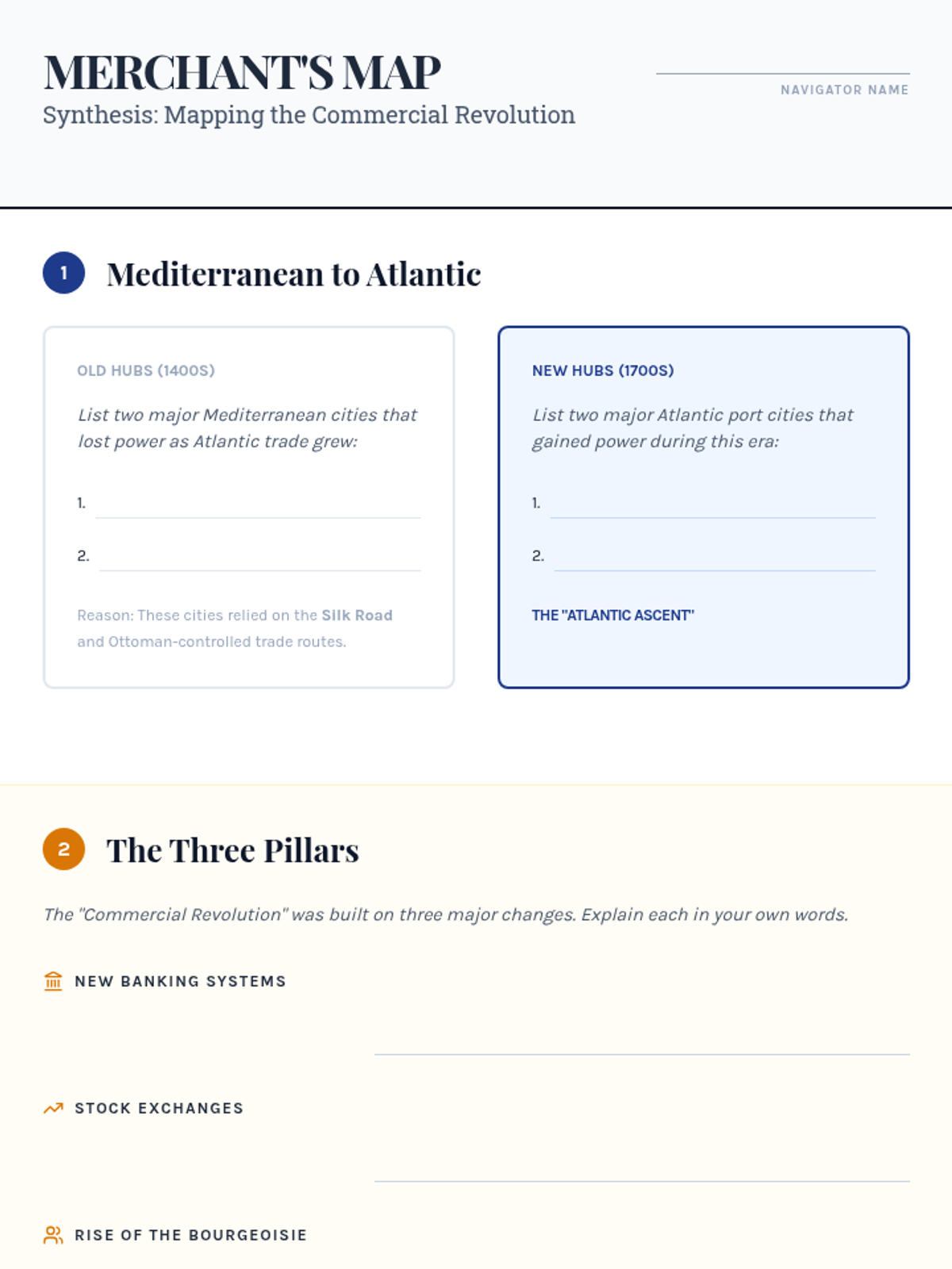 A game-based sequence exploring the economic systems of the Age of Exploration, focusing on mercantilism, joint-stock companies, and the global shift in power. Students engage in simulations and case studies to understand how modern global capitalism began.