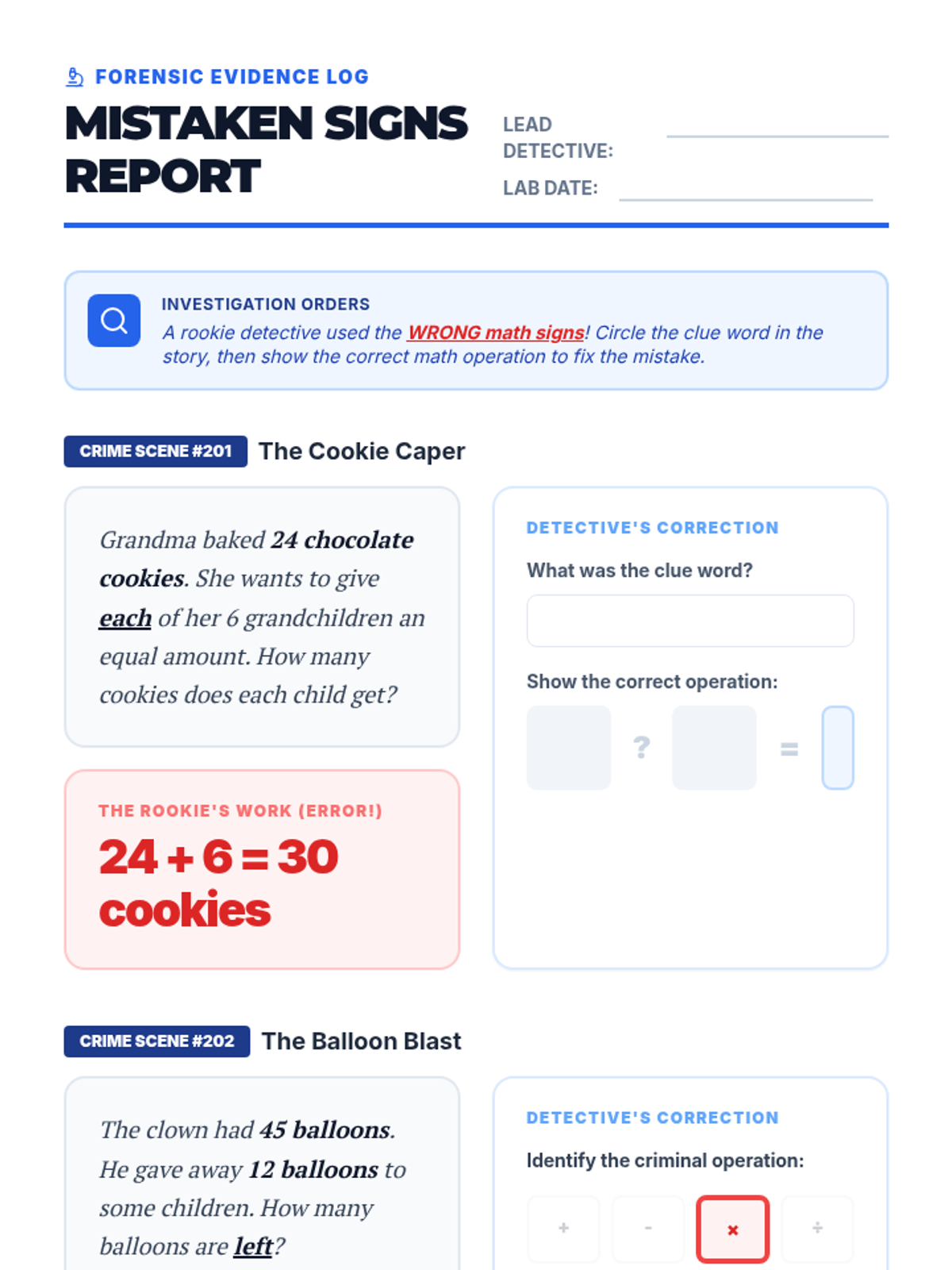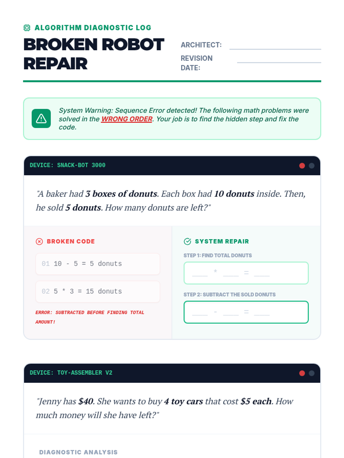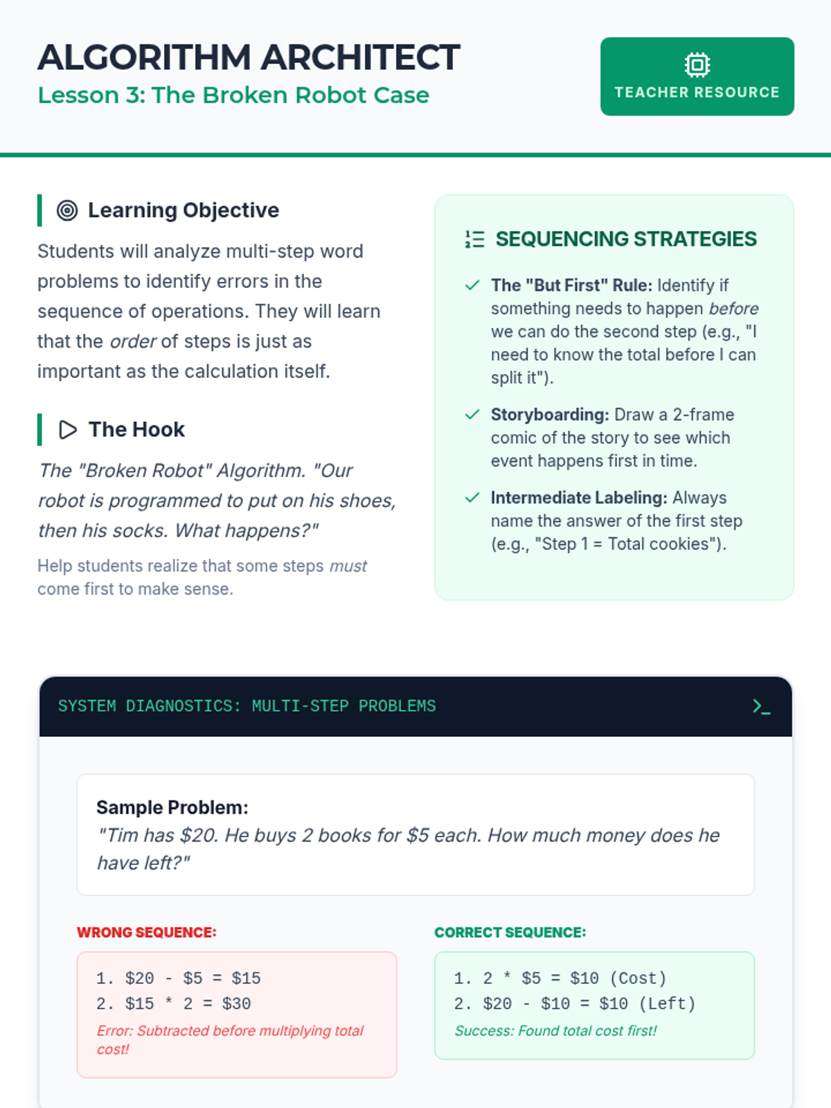 A 3rd-grade math sequence focused on metacognition and error analysis. Students act as 'math detectives' to identify and correct common errors in word problems, building their ability to break down complex math tasks.