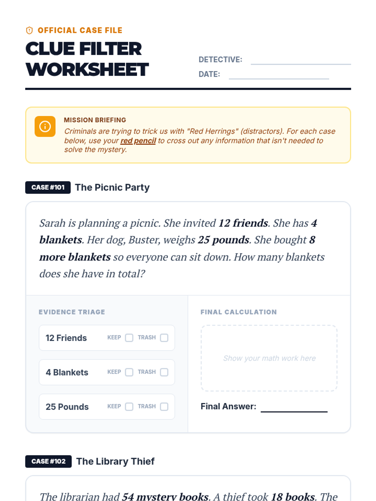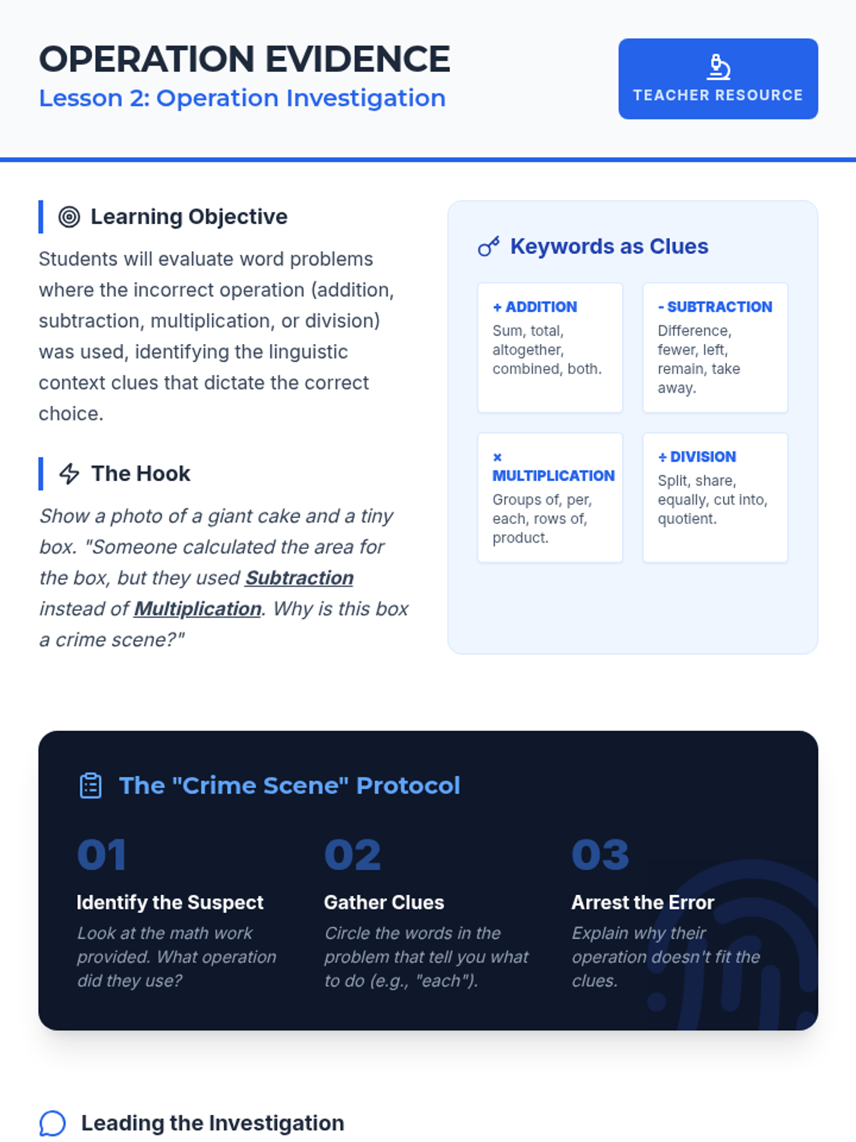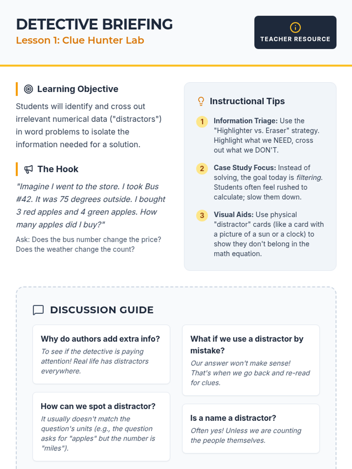 A 3rd-grade math sequence focused on metacognition and error analysis. Students act as 'math detectives' to identify and correct common errors in word problems, building their ability to break down complex math tasks.
