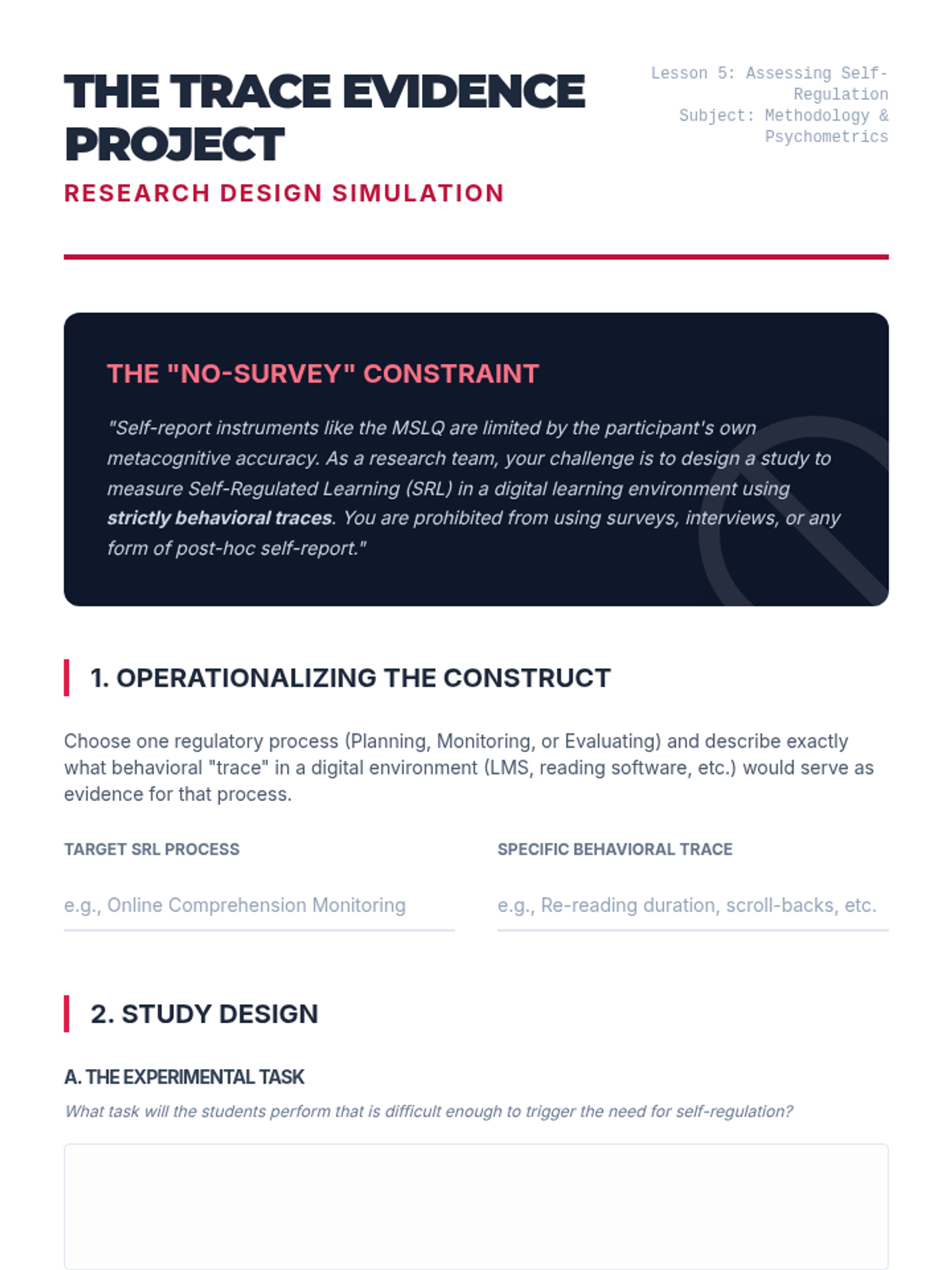 A graduate-level exploration of the executive control systems of the mind, focusing on the theoretical foundations and practical design of metacognitive and self-regulated learning interventions. Students move from conceptual delineation to the psychometric challenges of measuring internal cognitive processes.