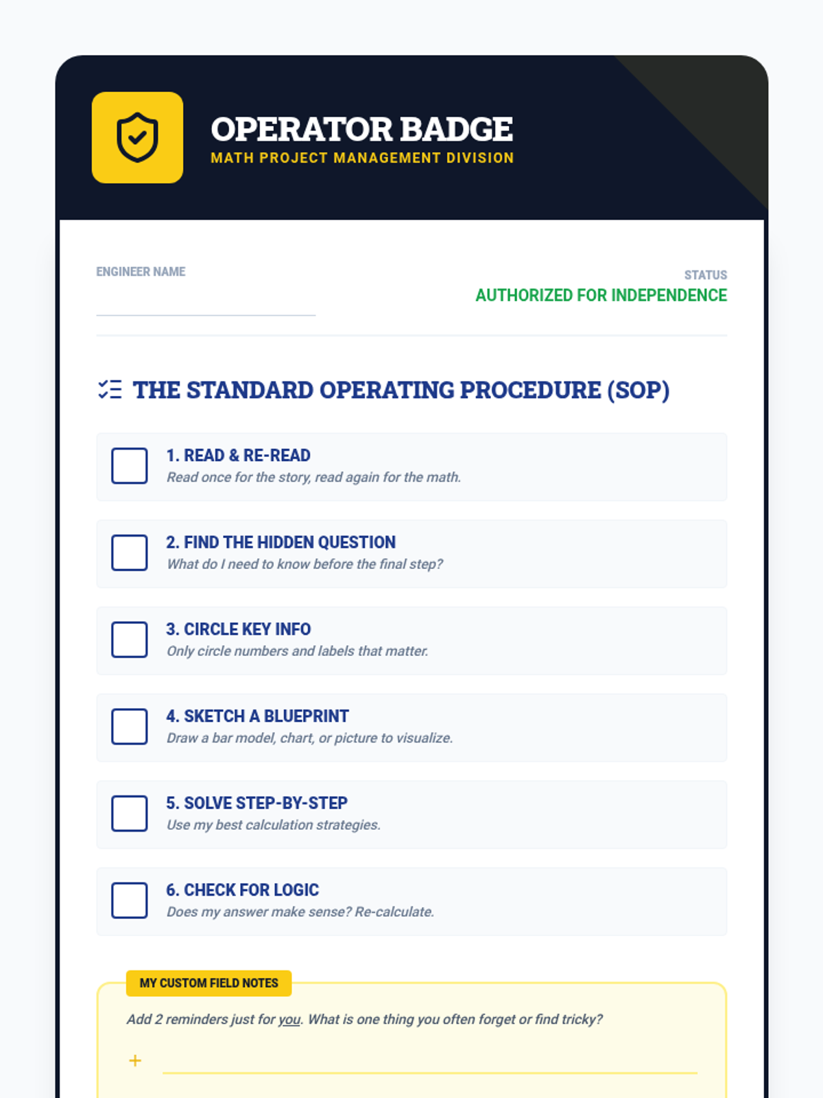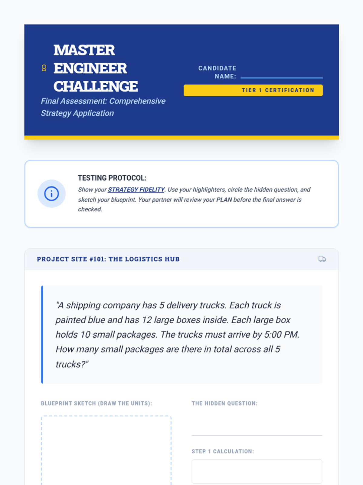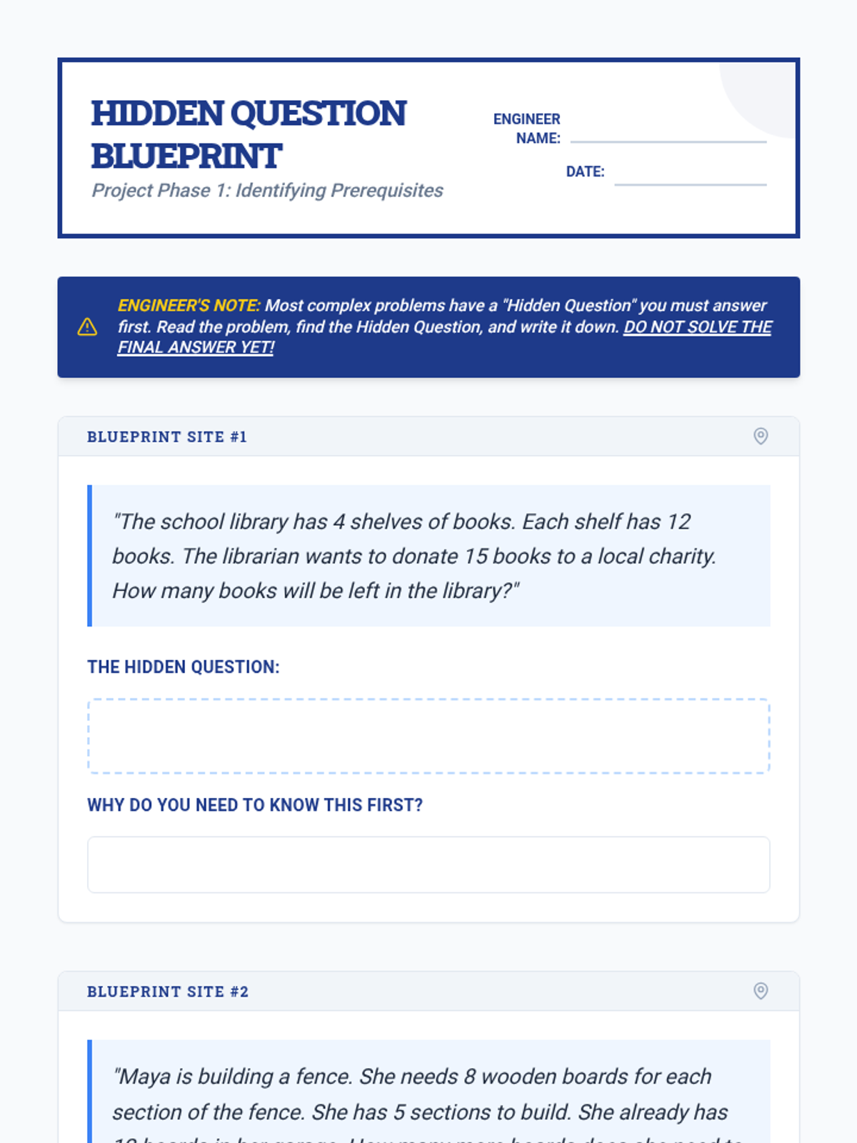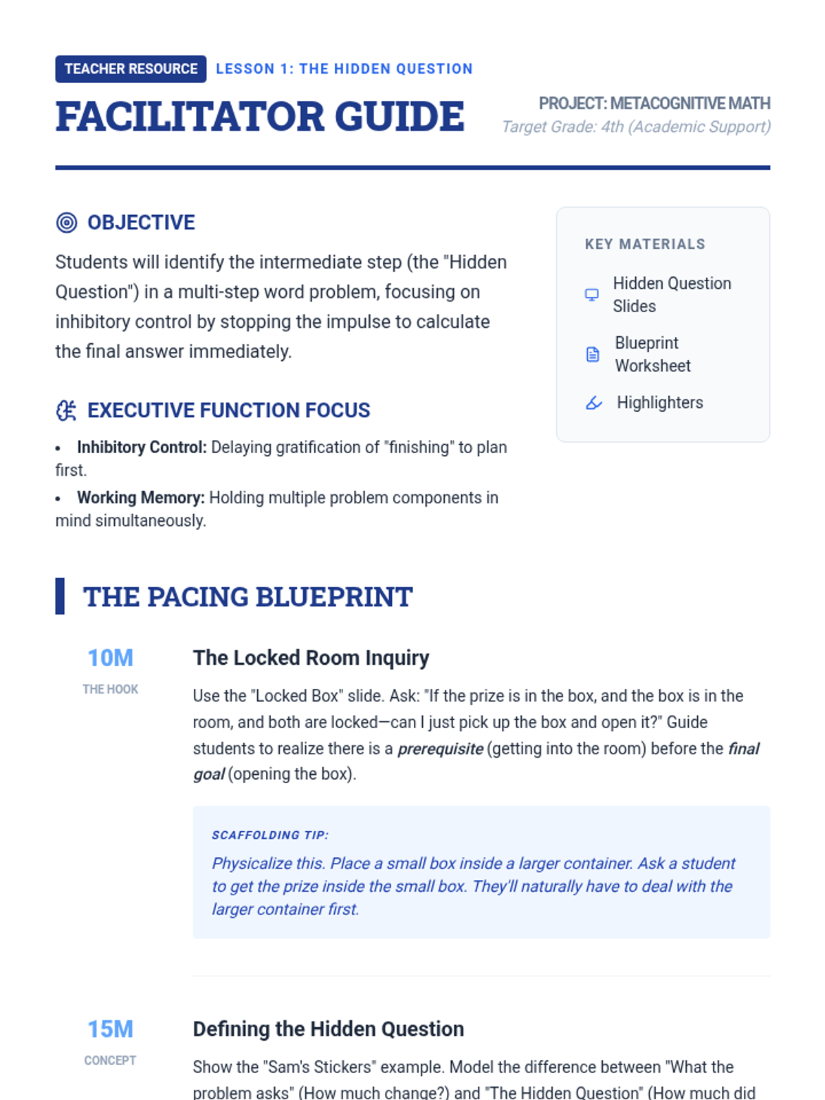 A sequence for 4th-grade students focusing on metacognitive strategies for breaking down multi-step math problems. Students learn to identify hidden questions, create procedural checklists, conduct error analysis, and filter out irrelevant information using an 'Engineer's Blueprint' theme.