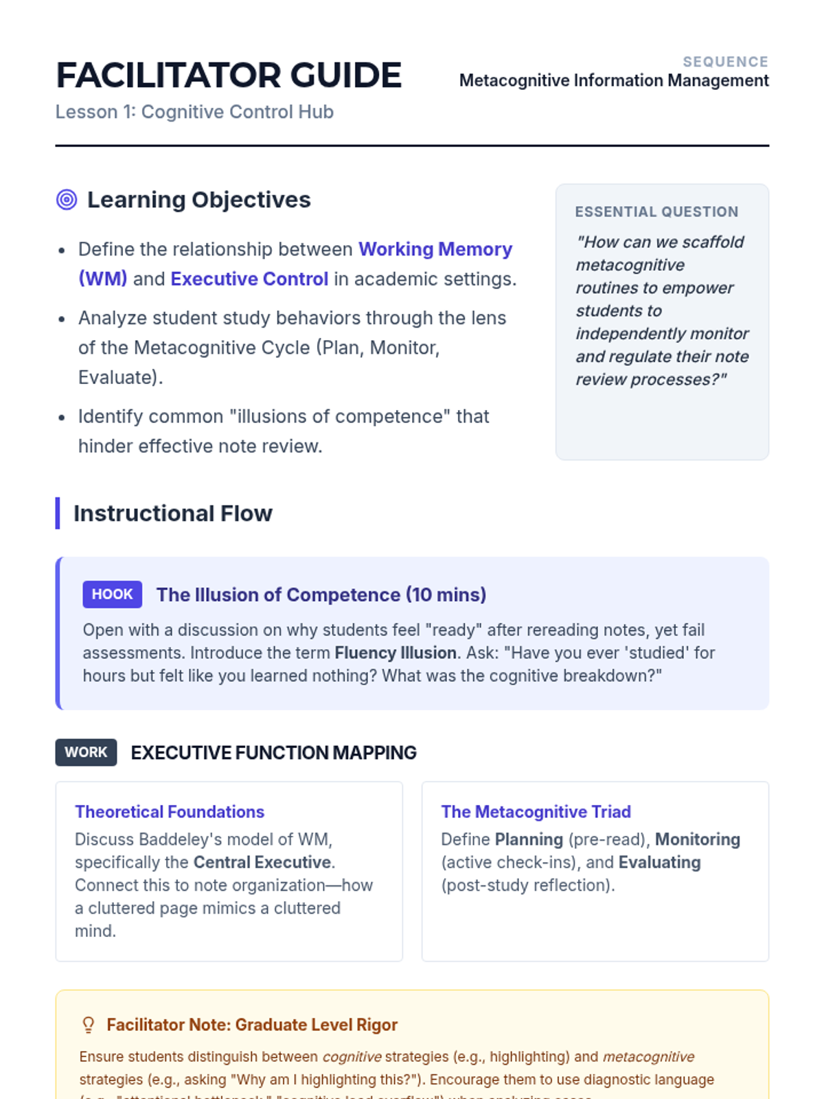 A graduate-level sequence focused on teaching special educators how to scaffold metacognitive routines for note review and information management, addressing working memory and executive function challenges.