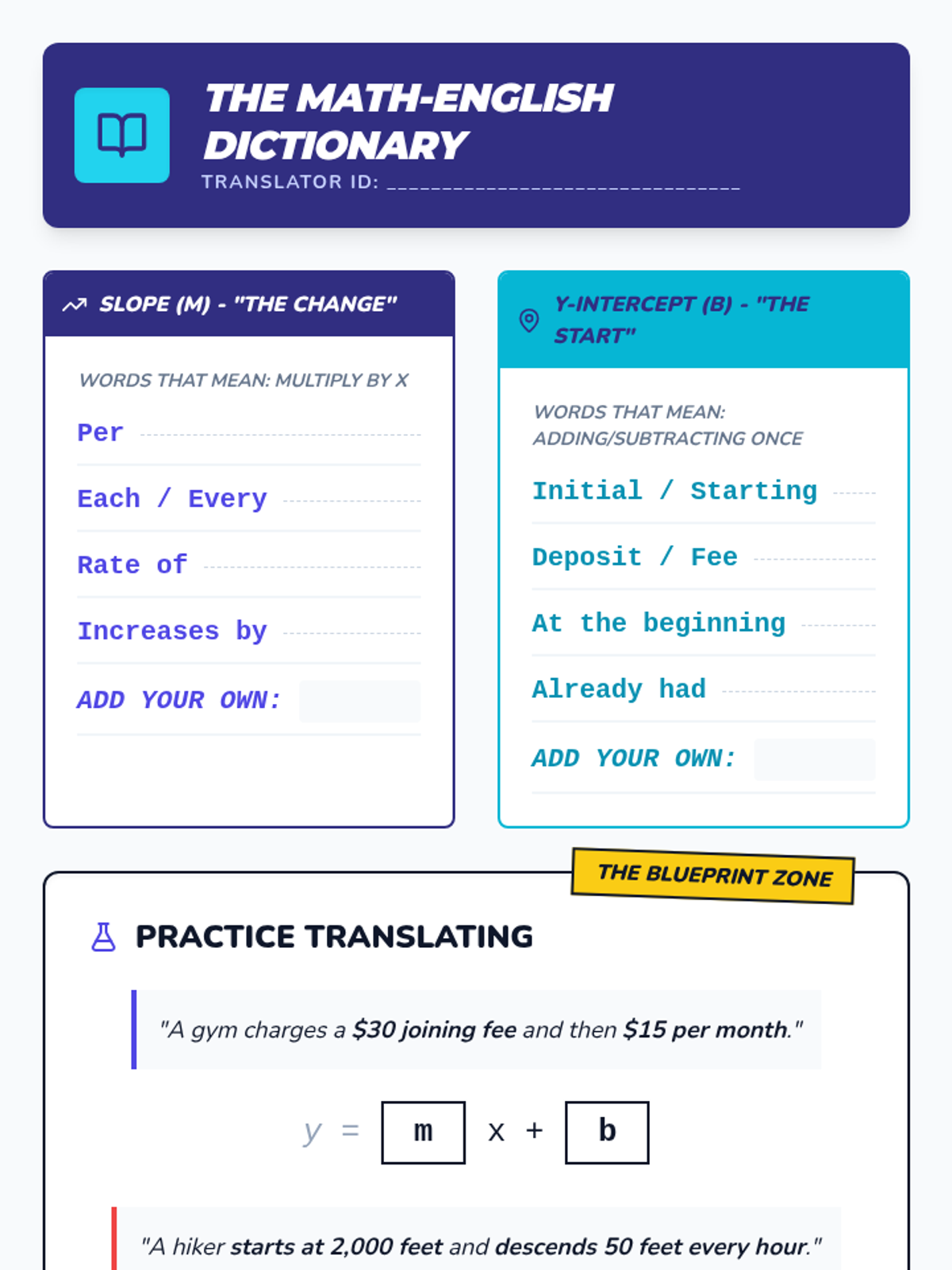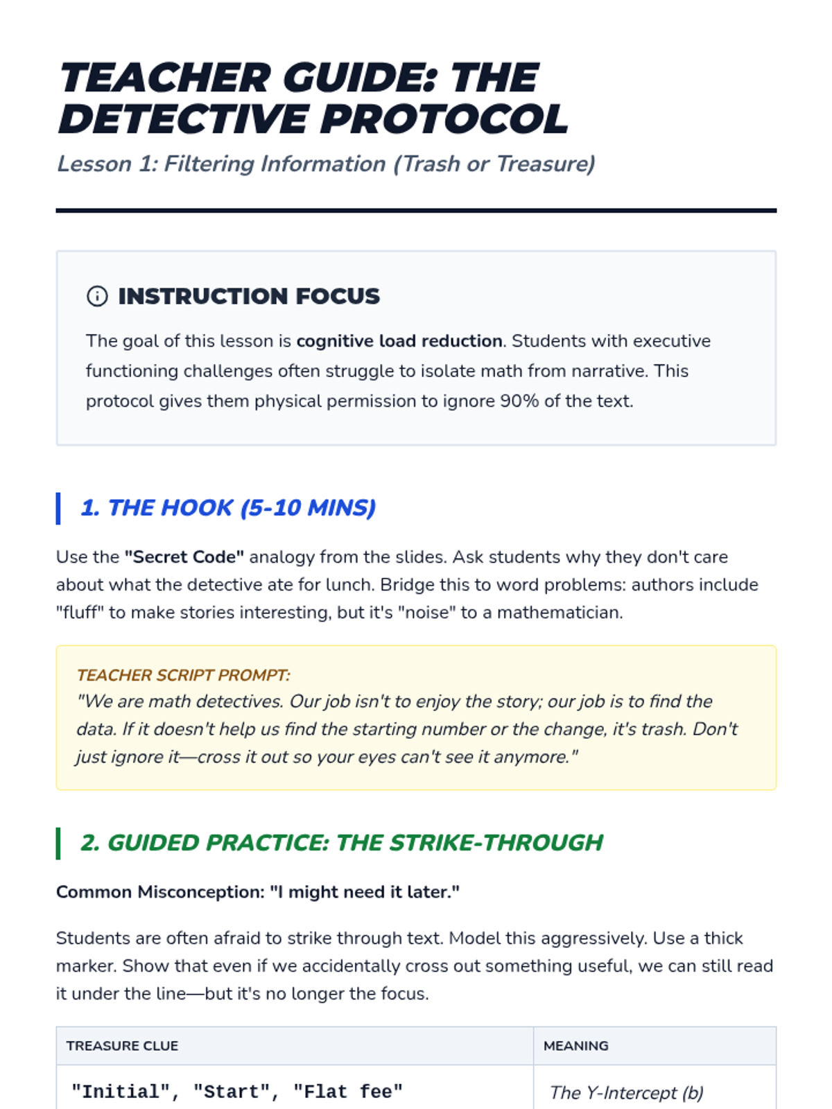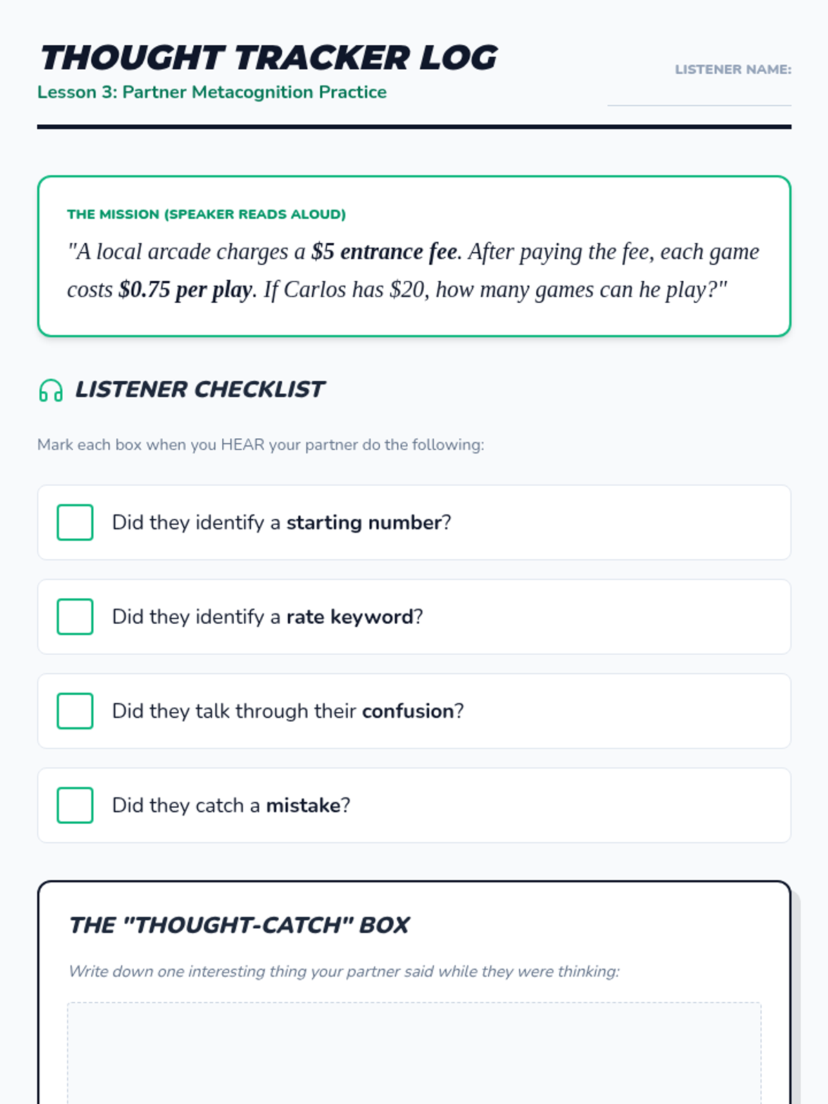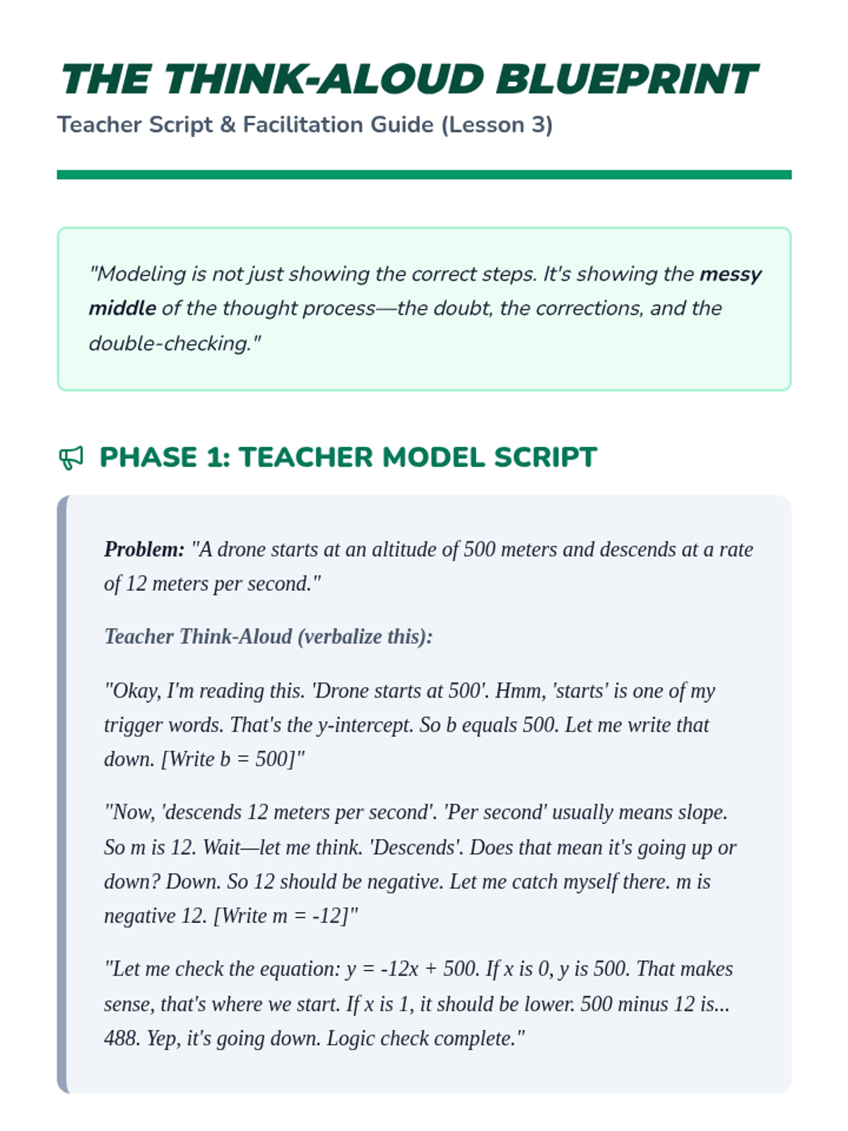 A 5-lesson sequence for 8th-grade special education students focused on metacognitive strategies for breaking down complex function word problems. Students learn to filter information, translate keywords, use think-alouds, and categorize errors to build a personalized troubleshooting guide.